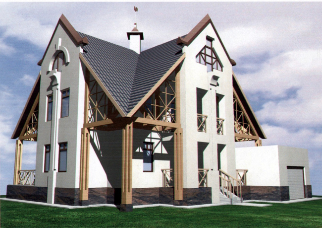 Этот дом идеален для небольшого участка. Его задняя стена, к торой примыкает гараж, по сути является частью забора. Встроенная в объем дома терраса выходит во двор, попасть на которую можно из гостиной. Декоративность зданию придают пилястры, украшающие фасады, а также необычной формы окна. Уоколь дома облицован натуральным камнем, который хорошо сочетается с кровельным материалом – металлочерепицей. ажурные геометрические деревянные конструкции в сочетании со светлыми оштукатуренными стенами придают дому особый шарм. Легкий светлый, изящный, устремленный в небо – так в целом воспринимается дом.