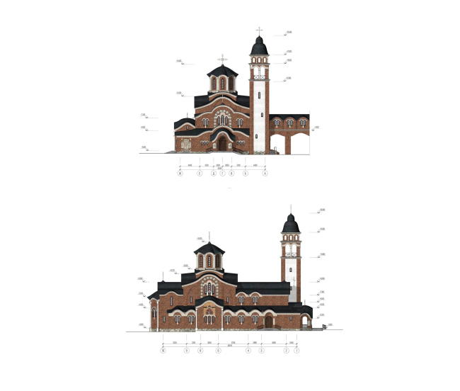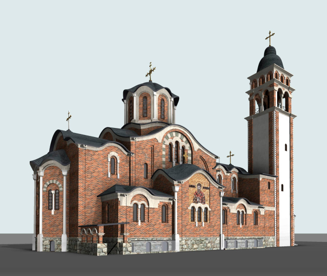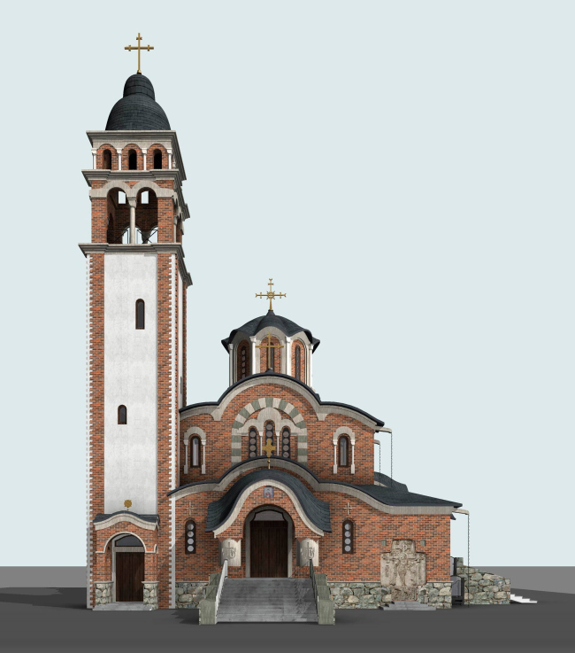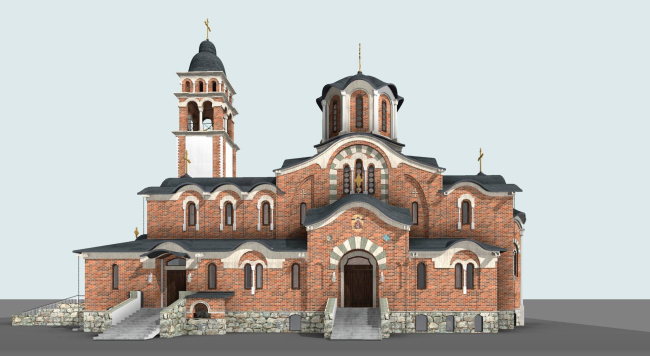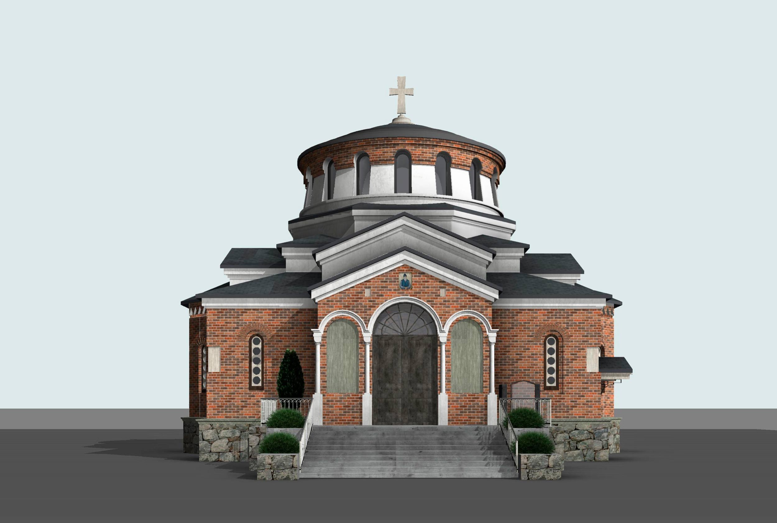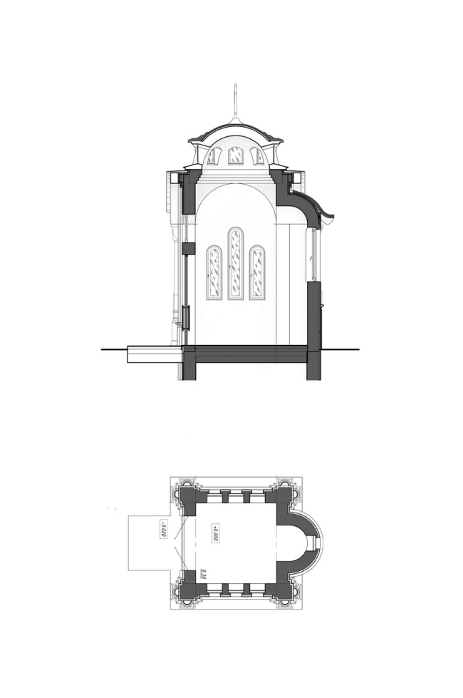 Малый храм – компактная ротонда на 350 человек, с обходной галереей и эркерами, архитектурно ориентированная на раннехристианские византийские постройки, особенно на храм Санта-Фоско в Торчелло. Фасады обоих храмов украшены пилястрами, арочными молдингами, мозаикой, барельефами и декоративной кладкой.