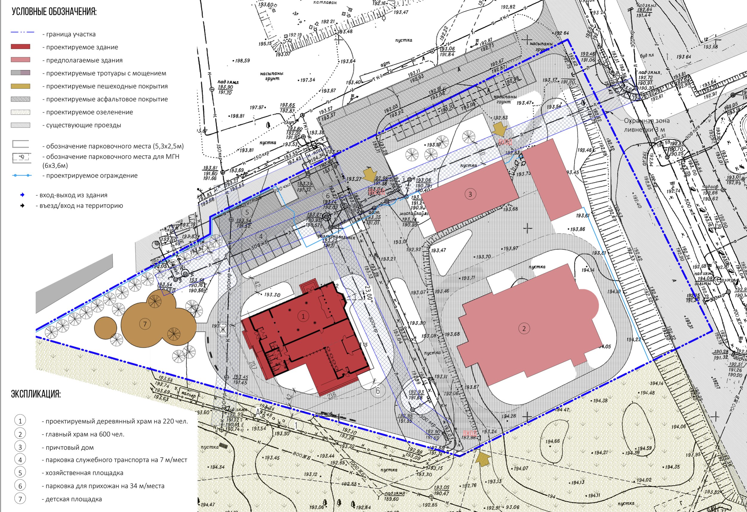 Главный большой храм, приходской центр и генплан участка не являются объектами проектирования в рамках данного предпроектного предложения и показываются в виде схем на генплане.