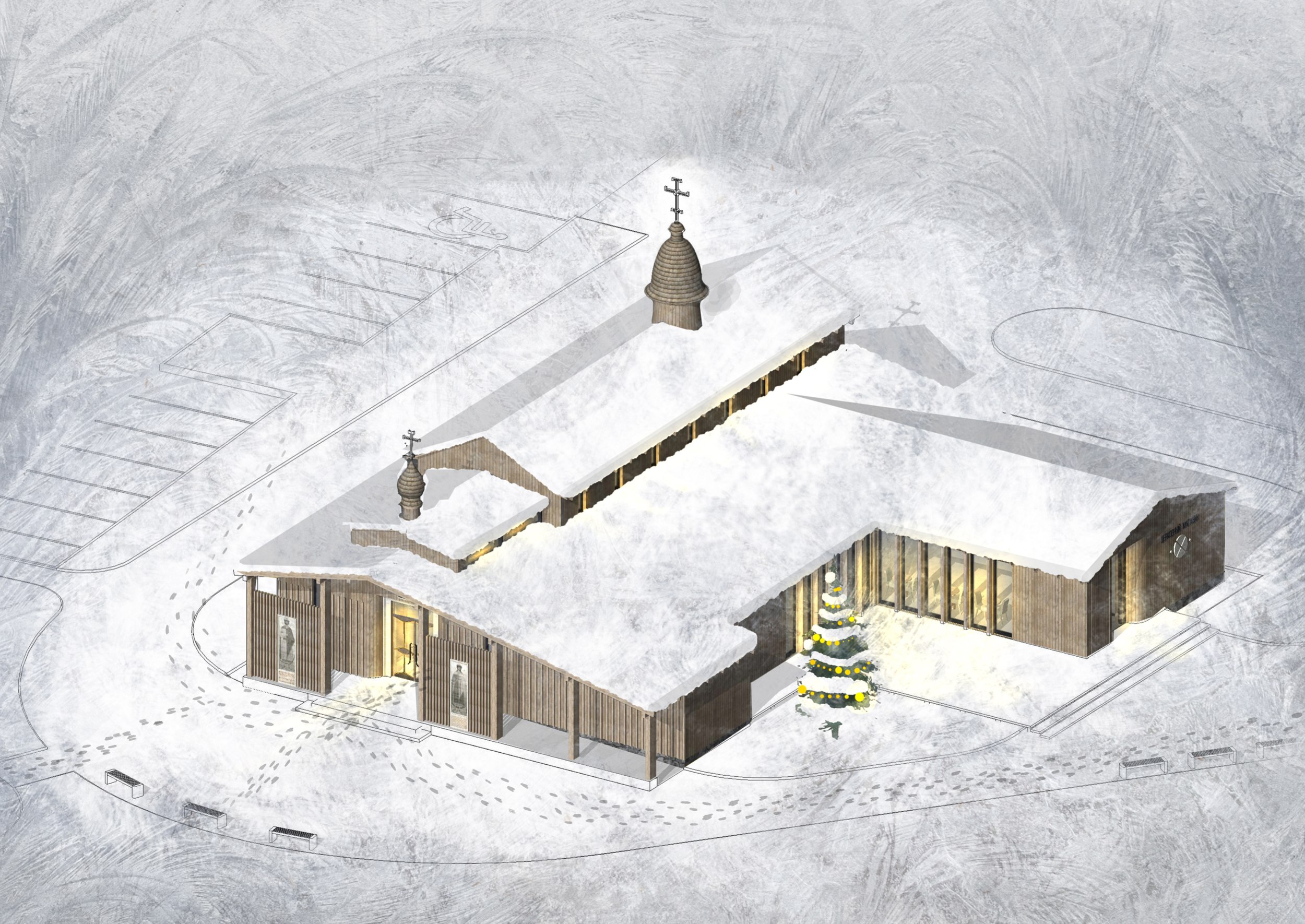 Здание одноэтажное. Архитектура лаконична и благодаря быстровозводимым каркасным конструкциям предполагает возможность его строительства в короткие сроки. Конструктивная схема разработана по принципу трехнефной базилики с большим боковым приделом. Архитектура храма дает отсылку к северным деревянным храмам, но с учетом ориентации на современные стилистические решения и конструкции.