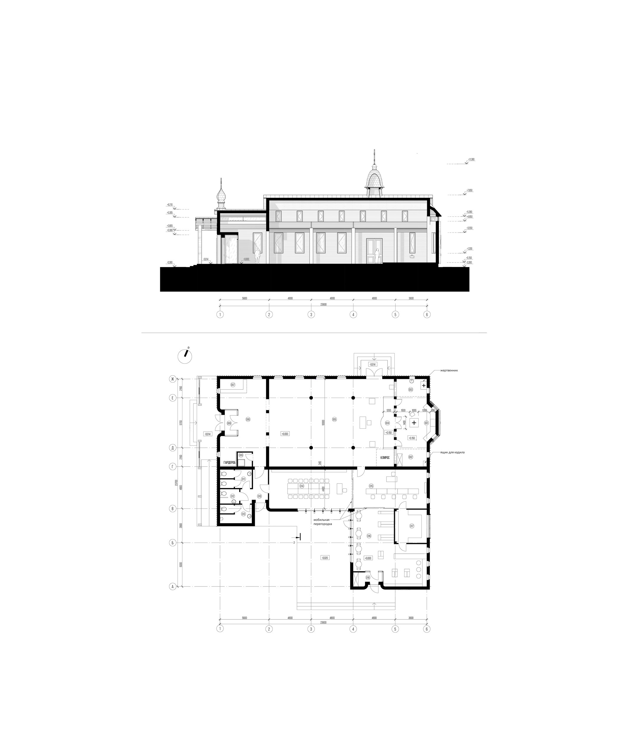 С южной стороны спроектированы помещения класса для занятий и многофункциональный зал, который может использоваться как трапезная. Южнее зала – церковный магазин с небольшим кафе. Все три помещения разделены между собой мобильными перегородками, которые позволяют объединить помещения в одно большое. Отдельно выделено помещение кухни. Организован свой выделенный вход с улицы в церковный магазин, а также спроектирован выход не летнюю террасу.