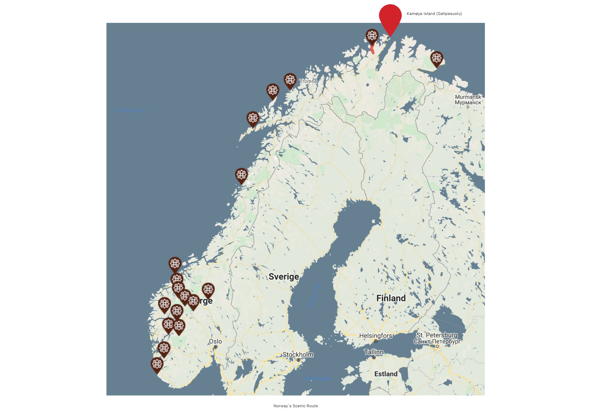 Остров Камёйя (Gahpesuolu) расположен на севере Норвегии, в муниципалитете Нордкапп. Хотя остров не является официальной остановкой на живописном маршруте Норвегии, он находится в непосредственной близости от него. Это место предлагает уникальный опыт для тех, кто стремится открыть для себя нечто совершенно новое. Проект направлен на раскрытие сурового природного ландшафта для посетителей, где архитектура выступает инструментом создания вдохновляющей и эмоционально насыщенной среды.