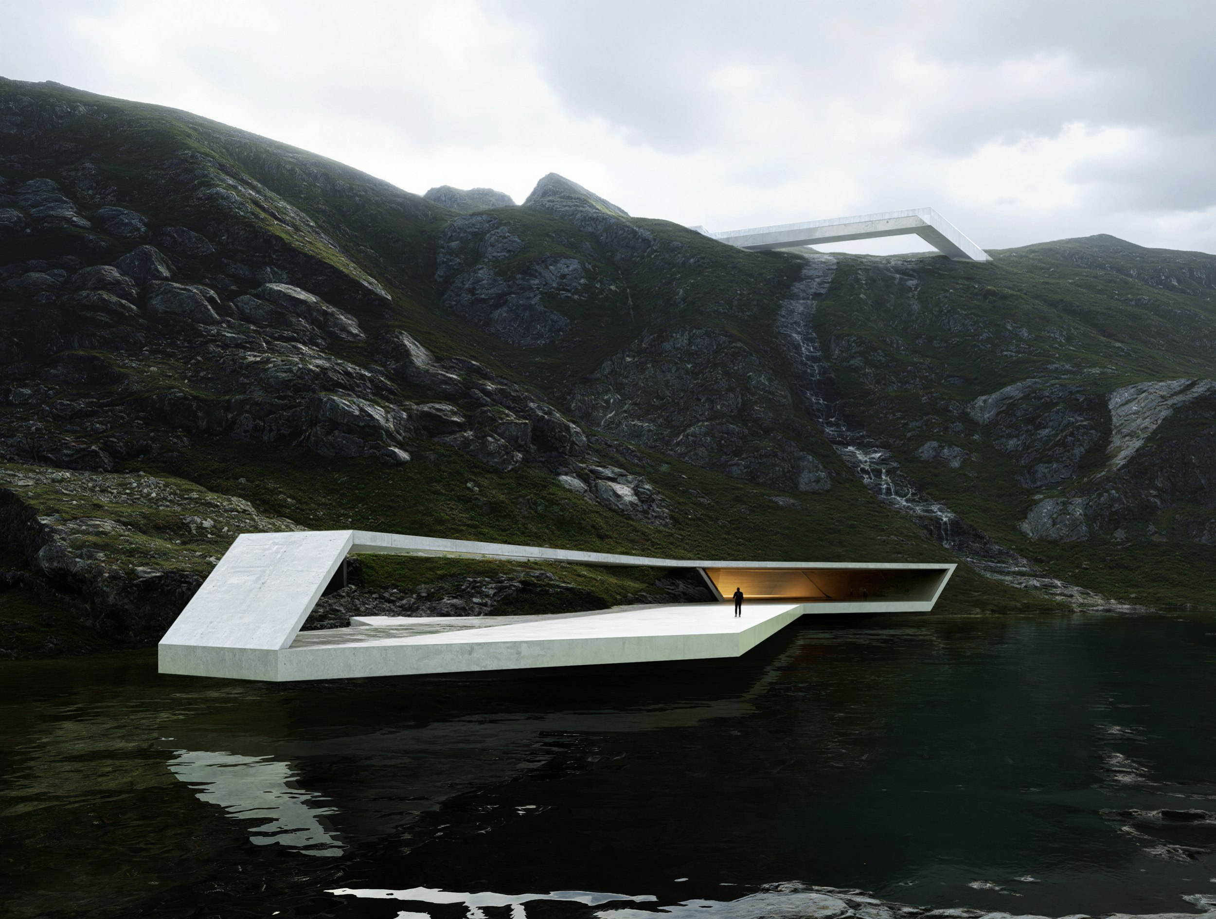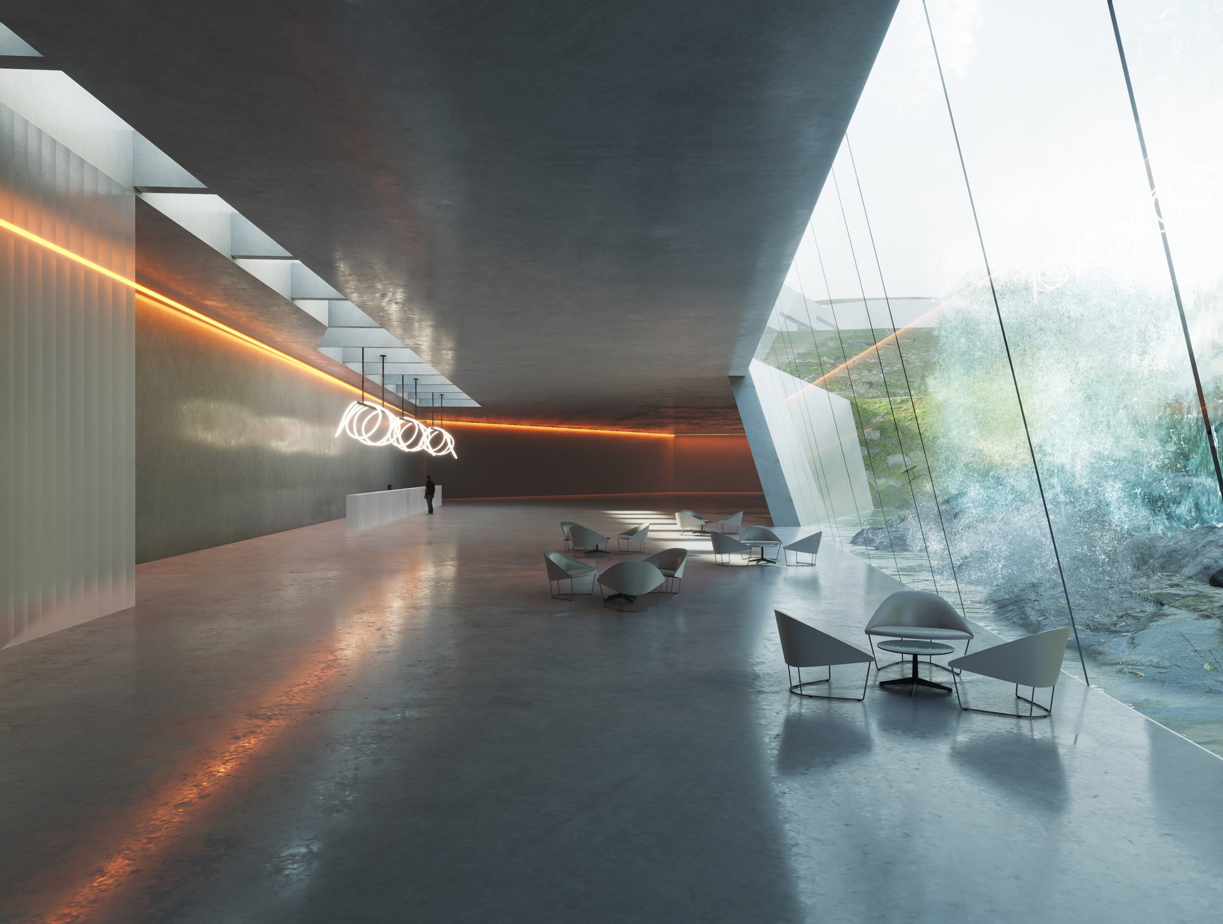 Культурно-рекреационный комплекс Камёйя. Визуализация входной группы, расположенной у водопада