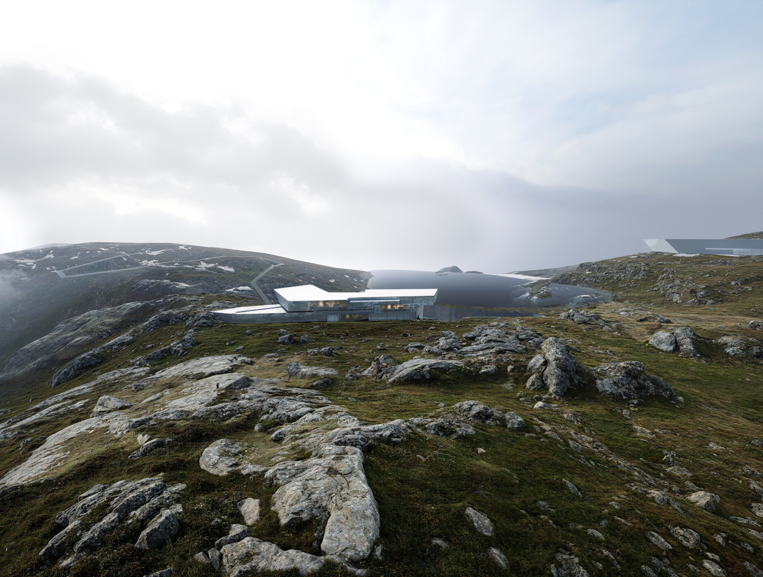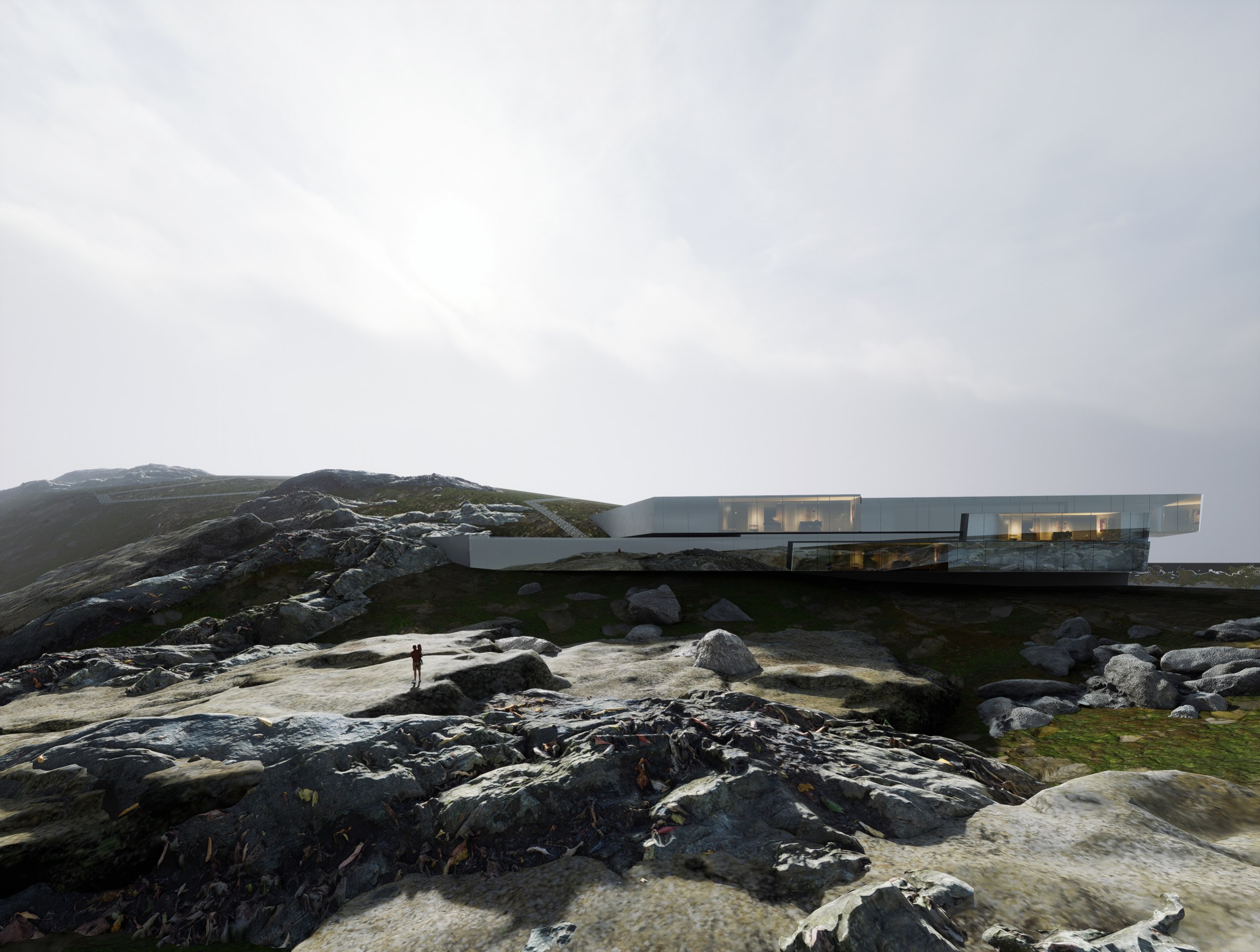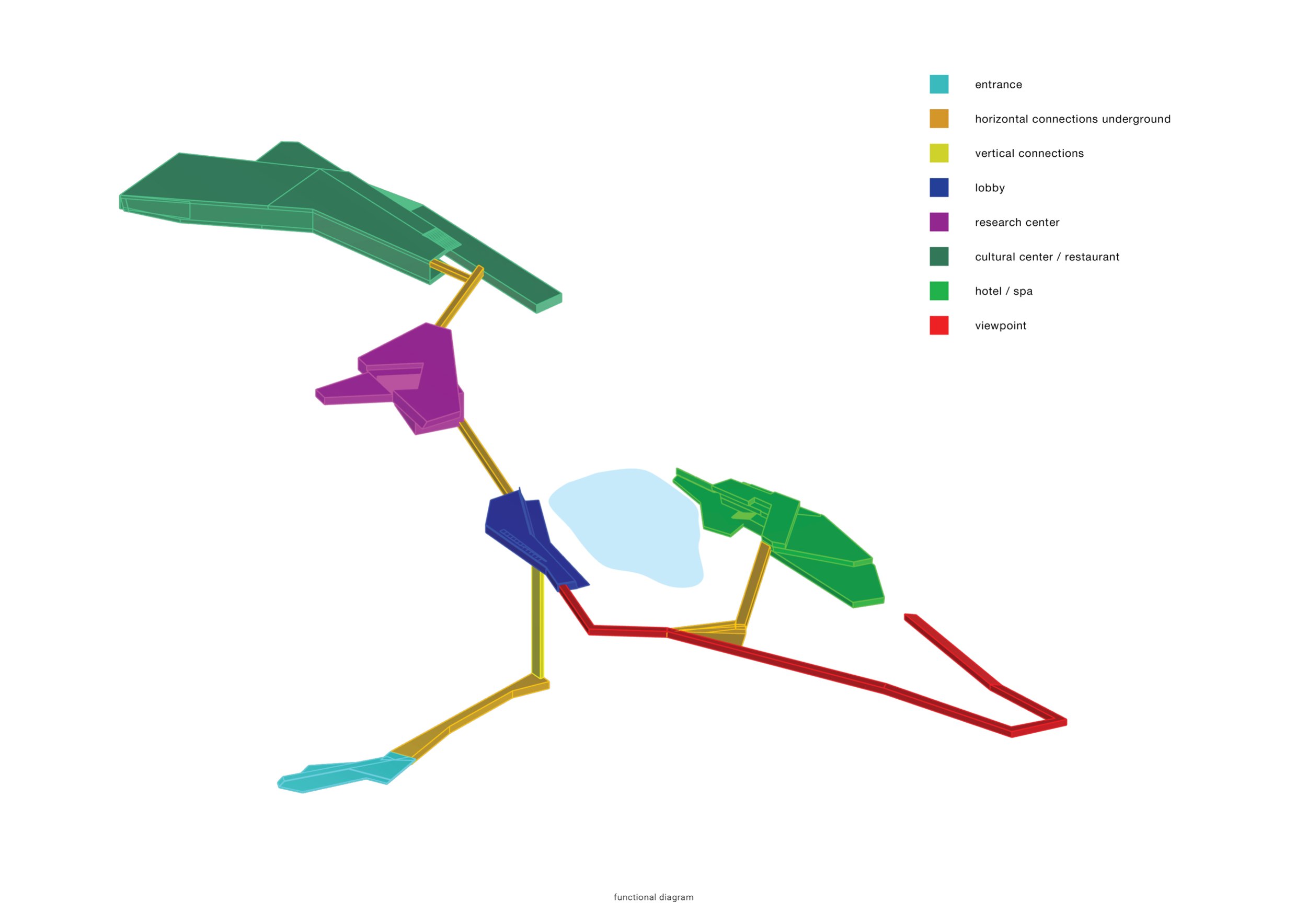 Поскольку остров имеет озеро в центральной части (110 метров над уровнем моря) и в соответствии с его топографией окружён существующей агорой, это место естественным образом становится главным узлом движения и точкой притяжения. Кроме того, верхняя часть острова обладает наилучшими видовыми характеристиками и подходит для наблюдения за звёздным небом и северным сиянием. Сама природа подсказывает расположение главного входа – рядом с водопадом, начинающимся в южной части озера.