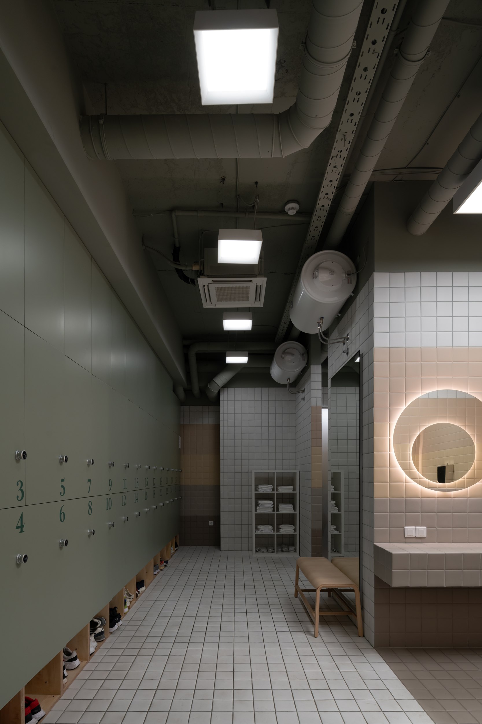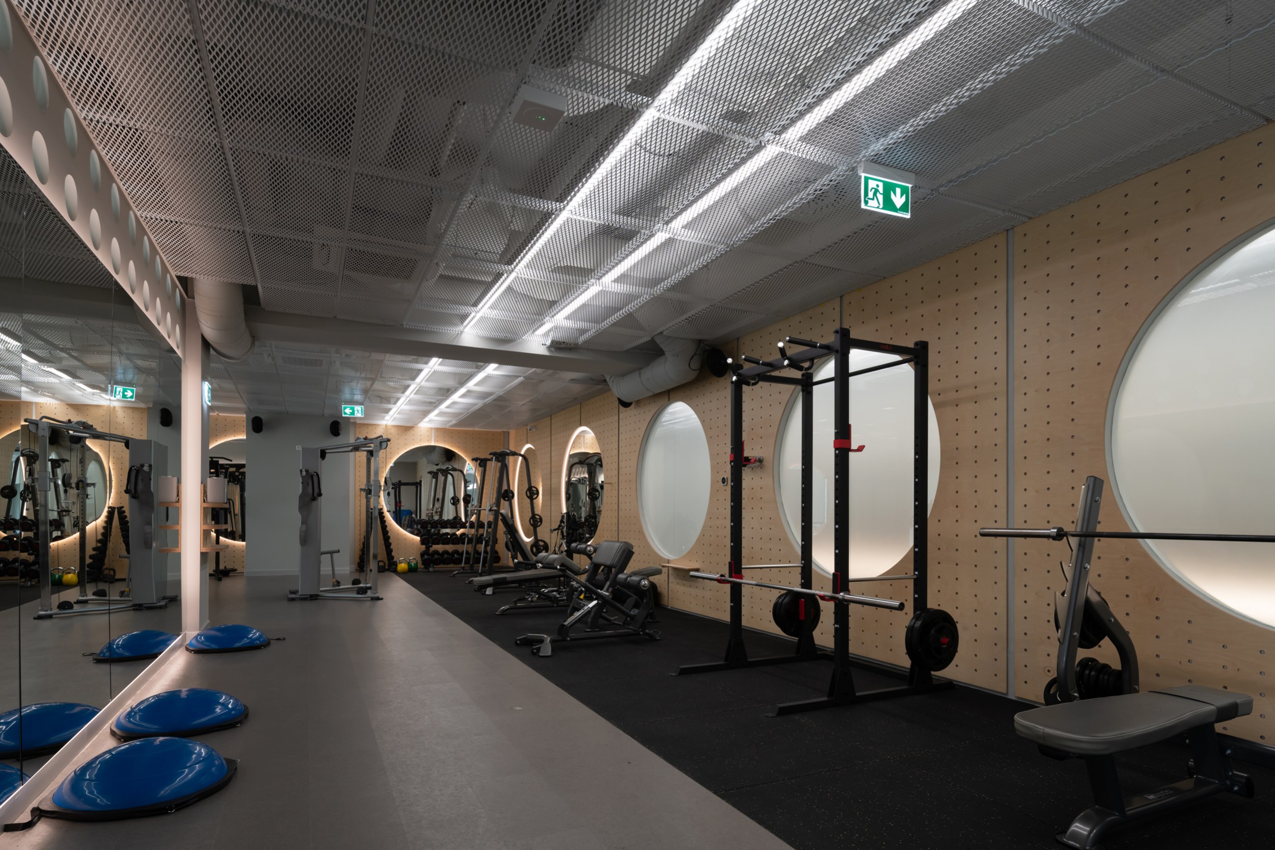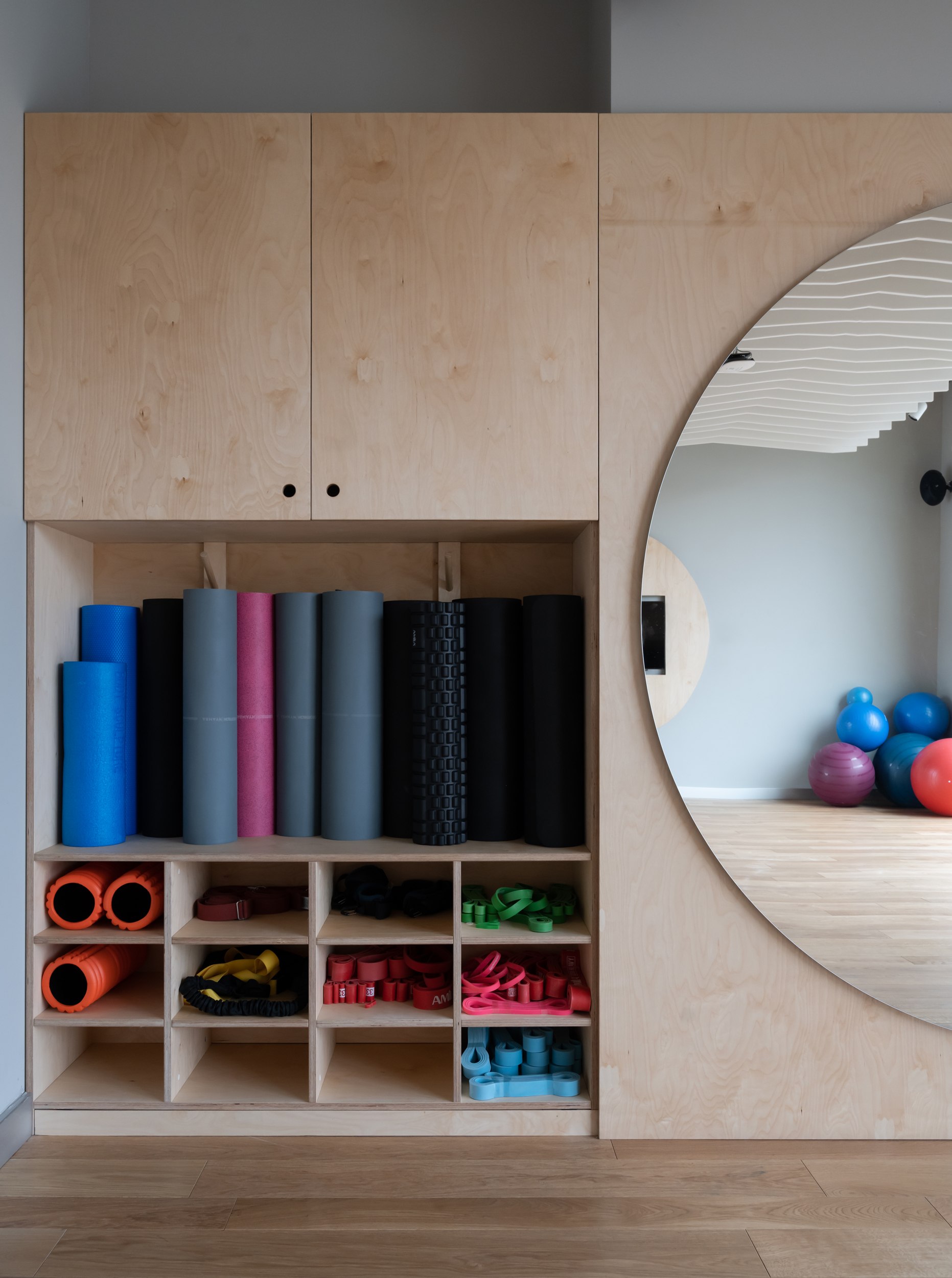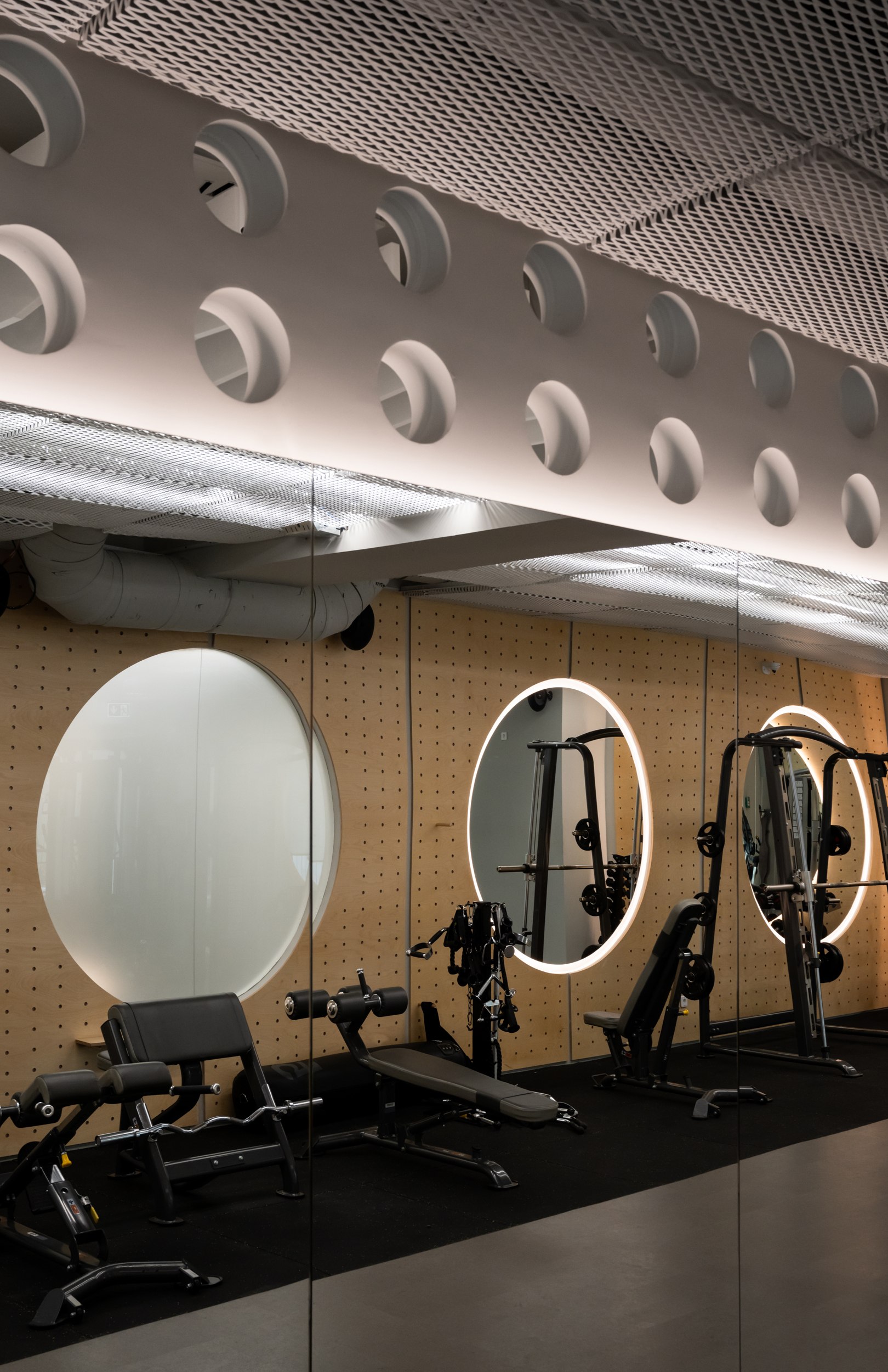 Главным архитектурным приемом стали круглые зеркала, установленные друг напротив друга. Они не только работают как инструмент контроля движений во время тренировки, но и визуально расширяют пространство, создавая эффект бесконечных коридоров. Этот прием позволил избежать ощущения тесноты и перегруженности, несмотря на компактную площадь.