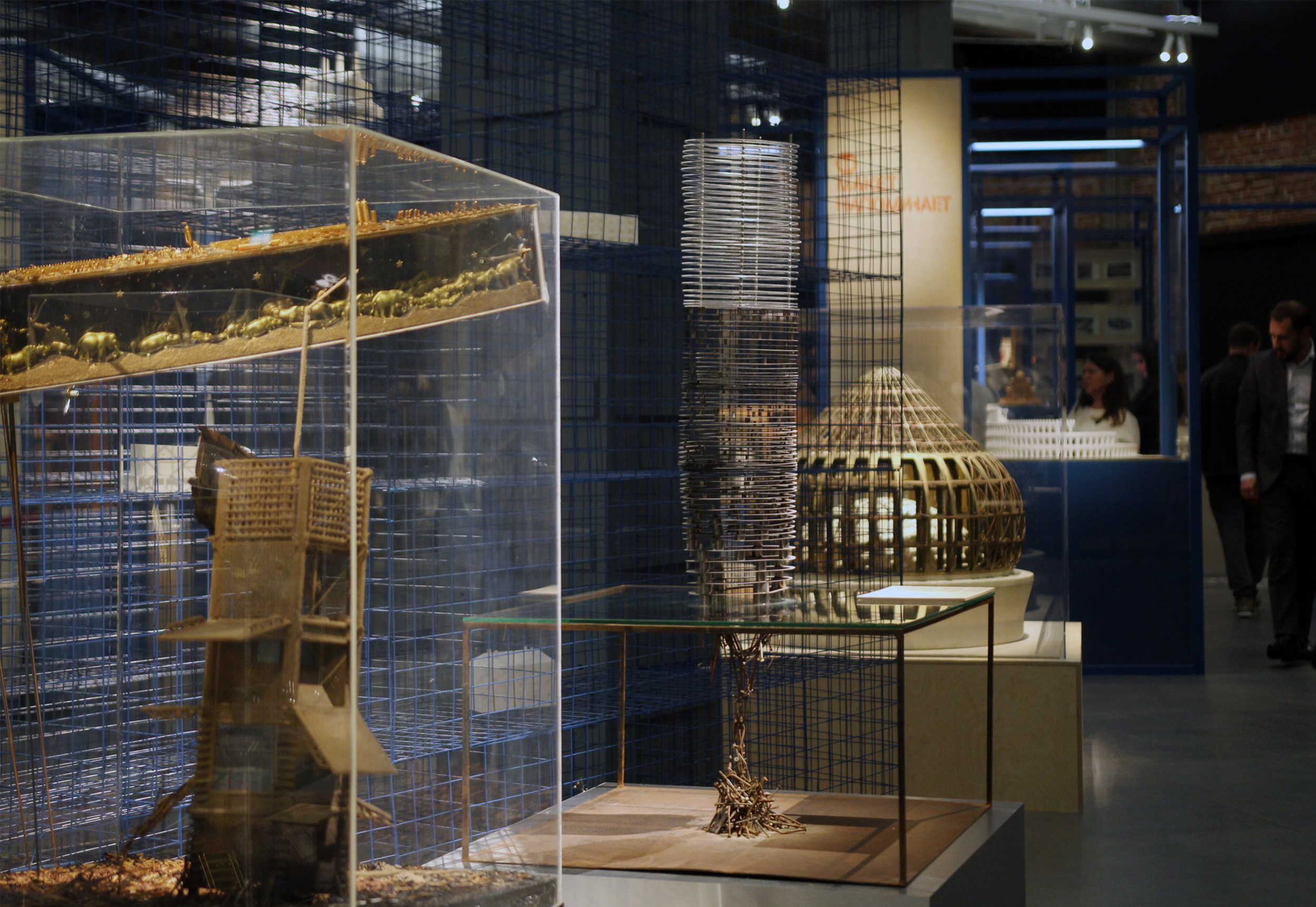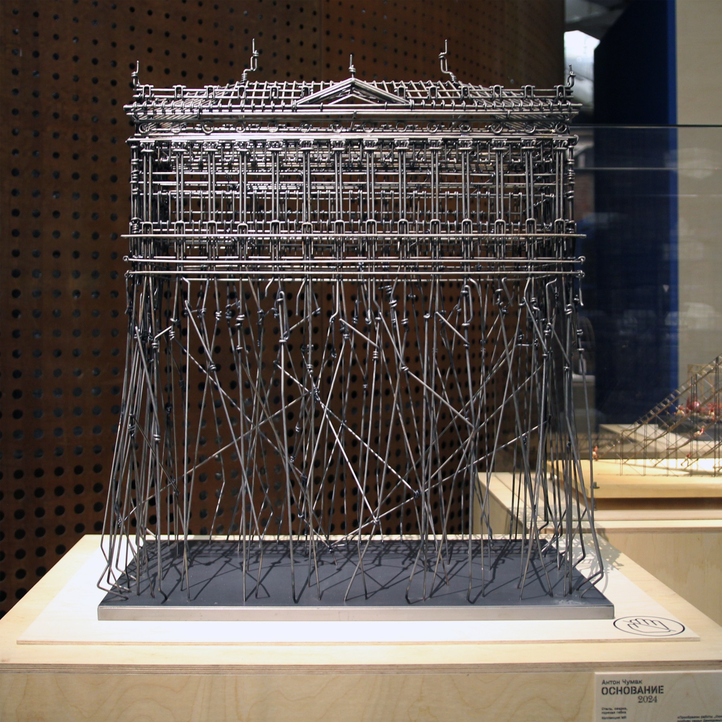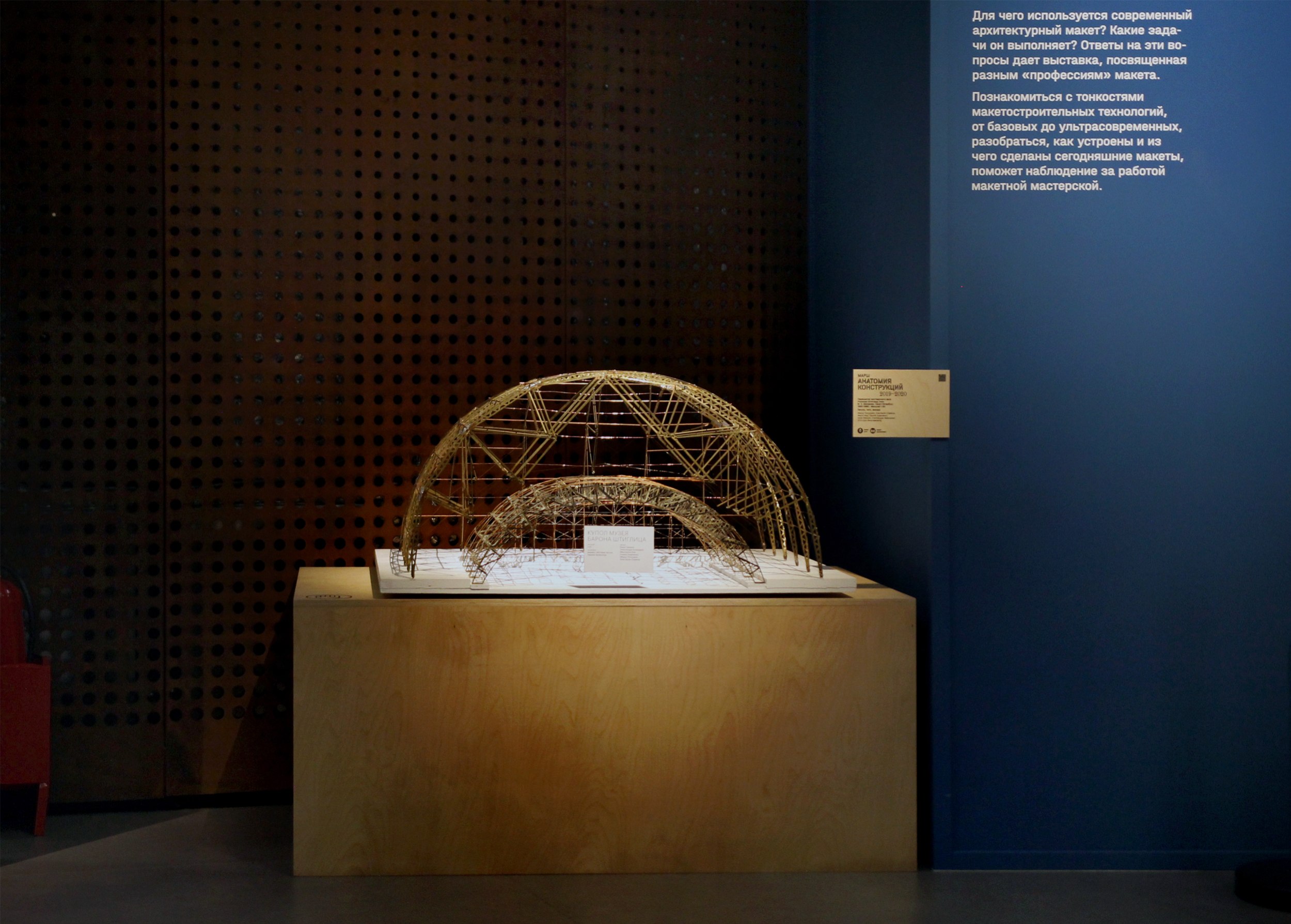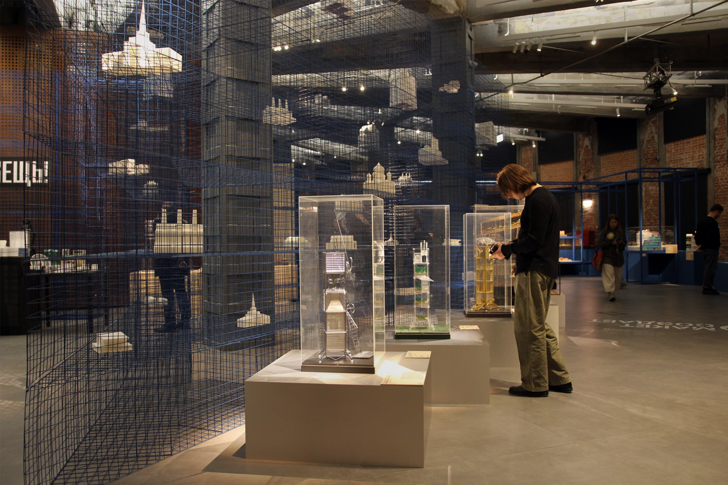 В часть новейшей истории архитектуры на «центральной площади» мы видим макет башни, спроектированной Сергеем Кузнецовым и Дмитрием Суховым на первом участке Москва-Сити. Она носит наследственное название One Tower. Макета даже два: один из упаковочного картона, уложенного слоями и вырезанного в объеме, а второй – прозрачный силуэт «силовых линий» из какой-то толстой проволоки.