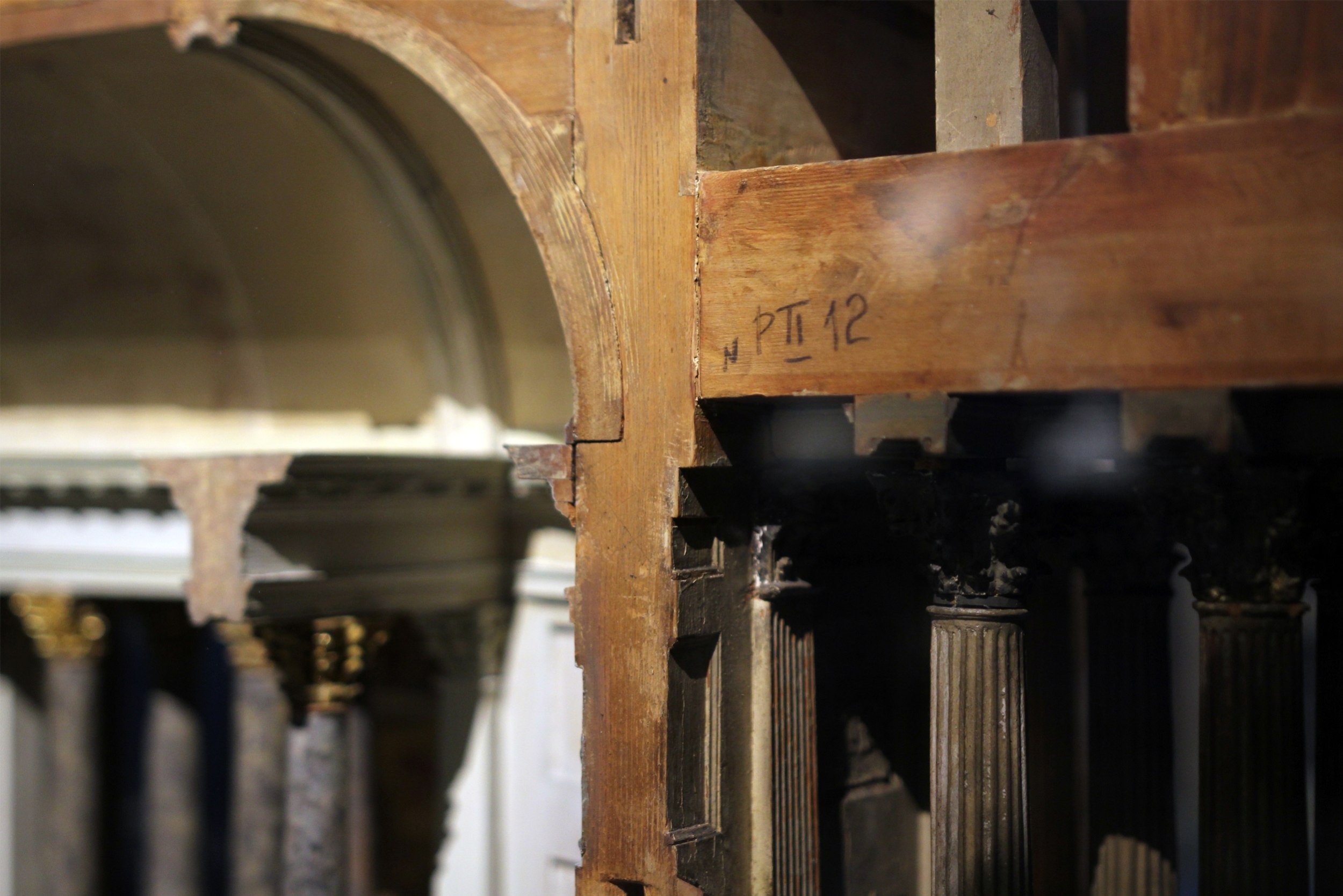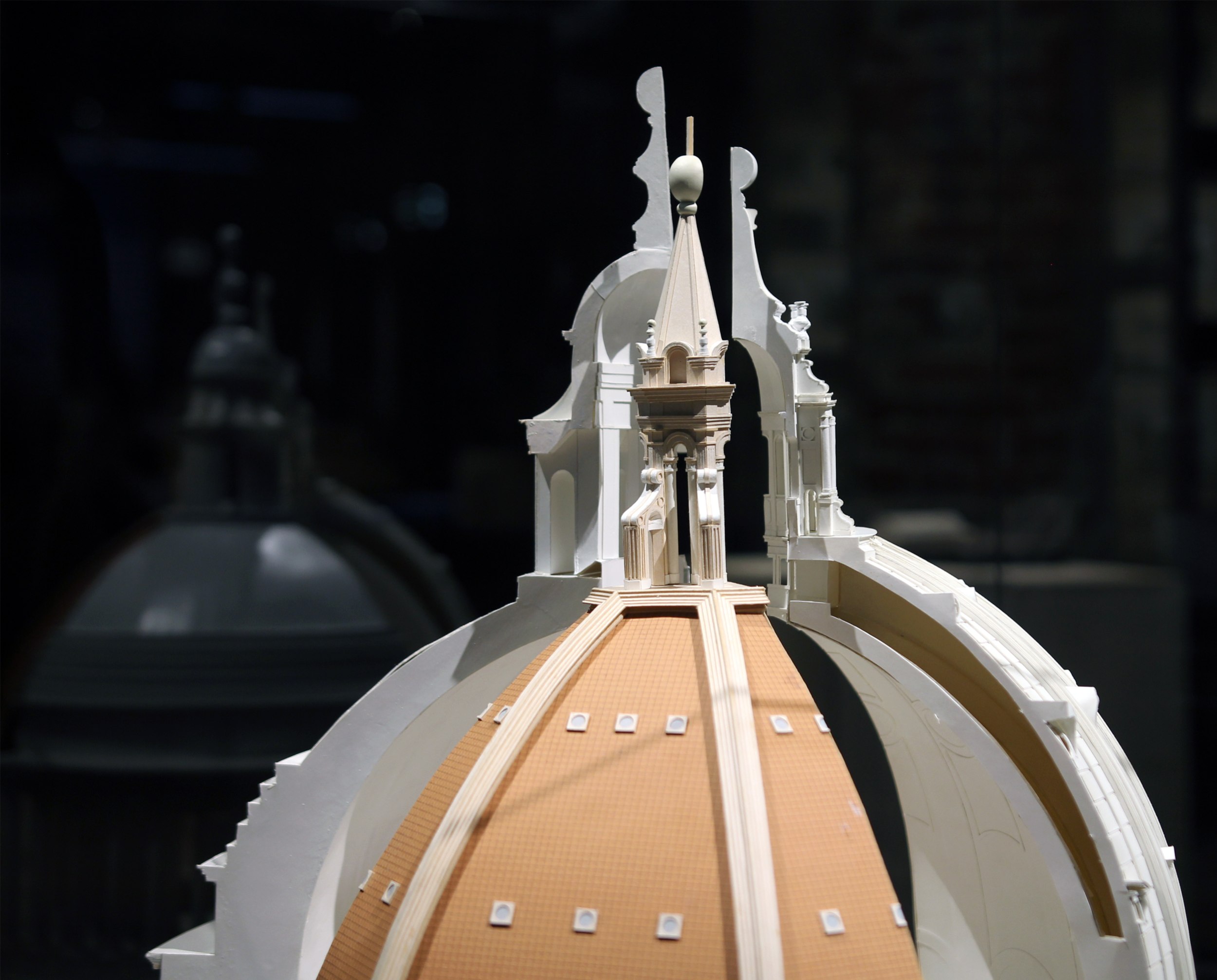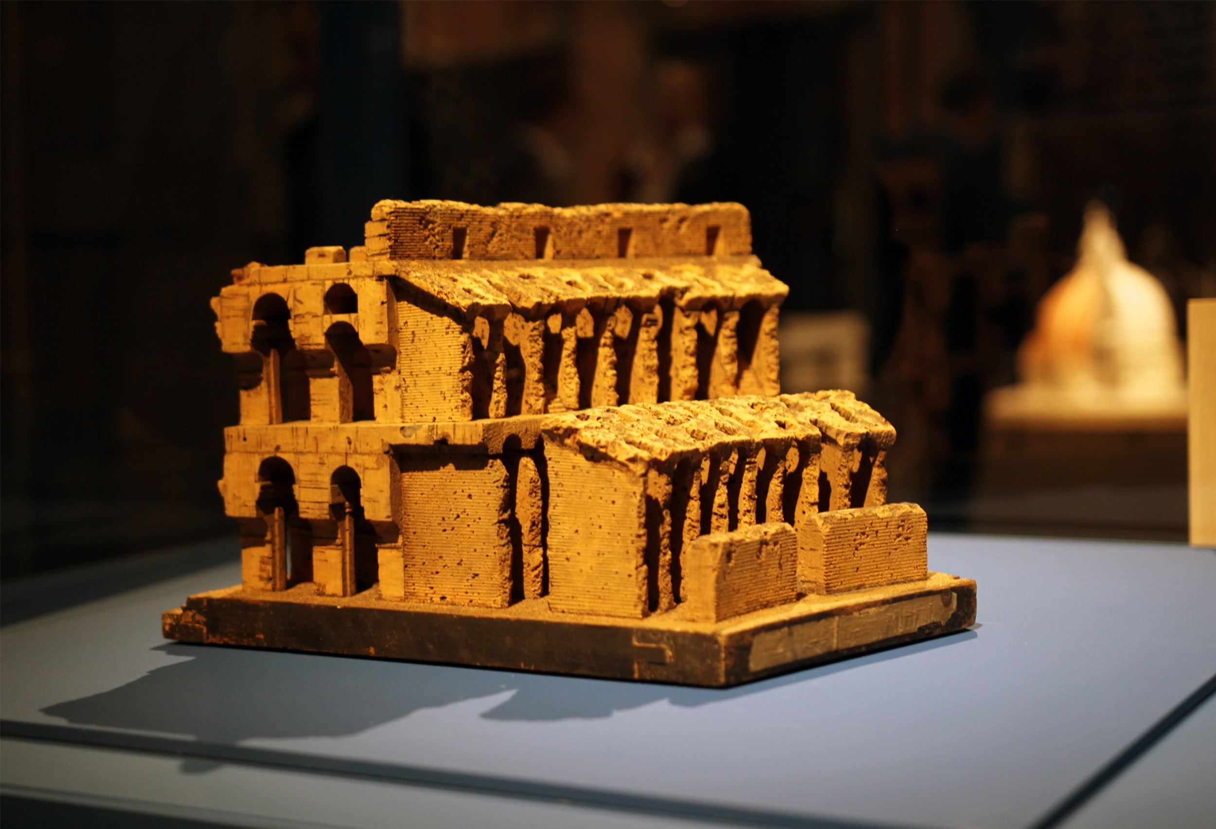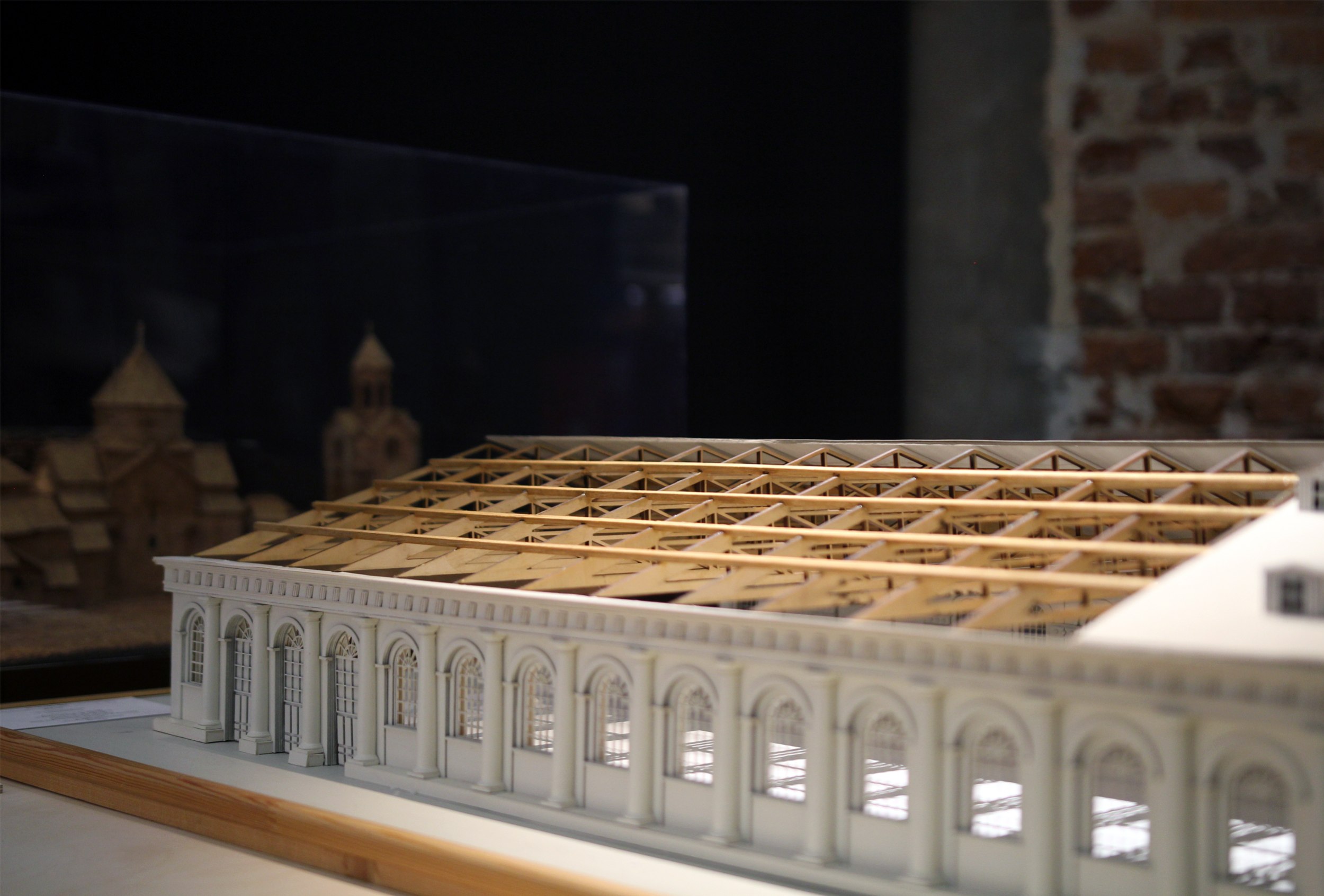 В каждой из двух половин экспозиции образуется небольшая «площадь» и на ней главный экспонат – этакая изюмина, вокруг которой «закручиваются» хороводы. Очевидно, что в исторической части это макет Колизея, сделанный итальянцем в конце XVIII века и, по легенде, заказанный Екатериной II для воспитания Павла I. Он – в центре, потому что самый старый на выставке. Вокруг вращаются: еще один Колизей, Казанский собор Воронихина, Санта Мария Дель Фьоре, ХХС и, как ни удивительно, Институт Генплана, а также старый позднесоветский (или постсоветский?) деревянный макет Москвы.