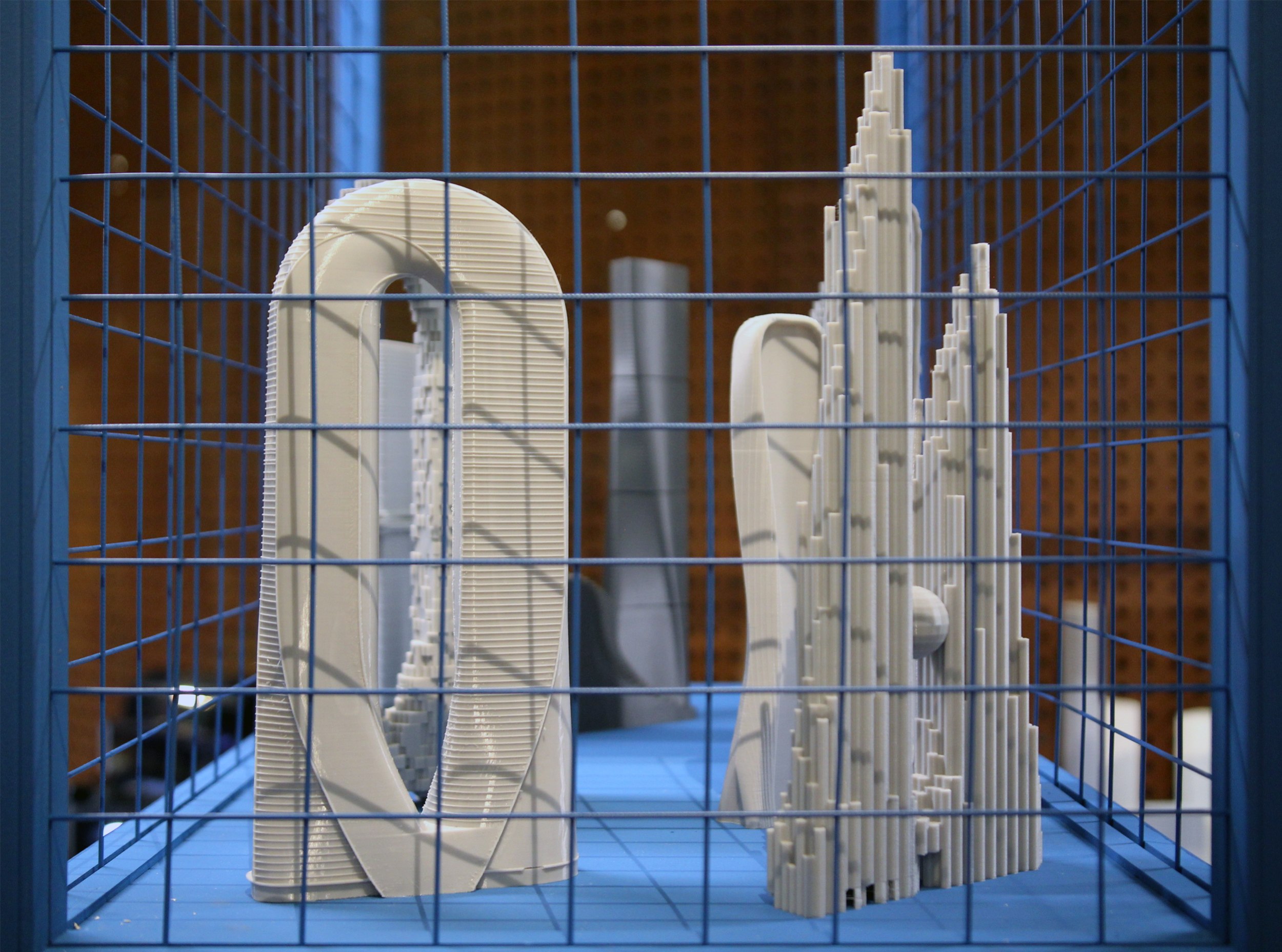 Не зря же оно так сложилось. Вдруг мы наблюдаем формирование нового образа величия Третьего Рима: исторически люди империи собирались в таких общественных пространствах, как Колизей, а теперь собираются в офисных башнях. Почему нет? В таком случае мы имеем дело с древней формой в новом, современном, высоко-технологичном воплощении, полноту которого поддерживают макеты здания, один скульптурный, но из картона, в чем можно увидеть креативный парадокс, свойственный, как мы видели выше, арт-макетам, а другой технологичный, металлический и прозрачный. Плюс – в виде распечаток указание на доступность 3D-принтера, то есть новых технологий, способных быстро и эффективно воспроизводить понравившийся образ в наше время в любом необходимом количестве.