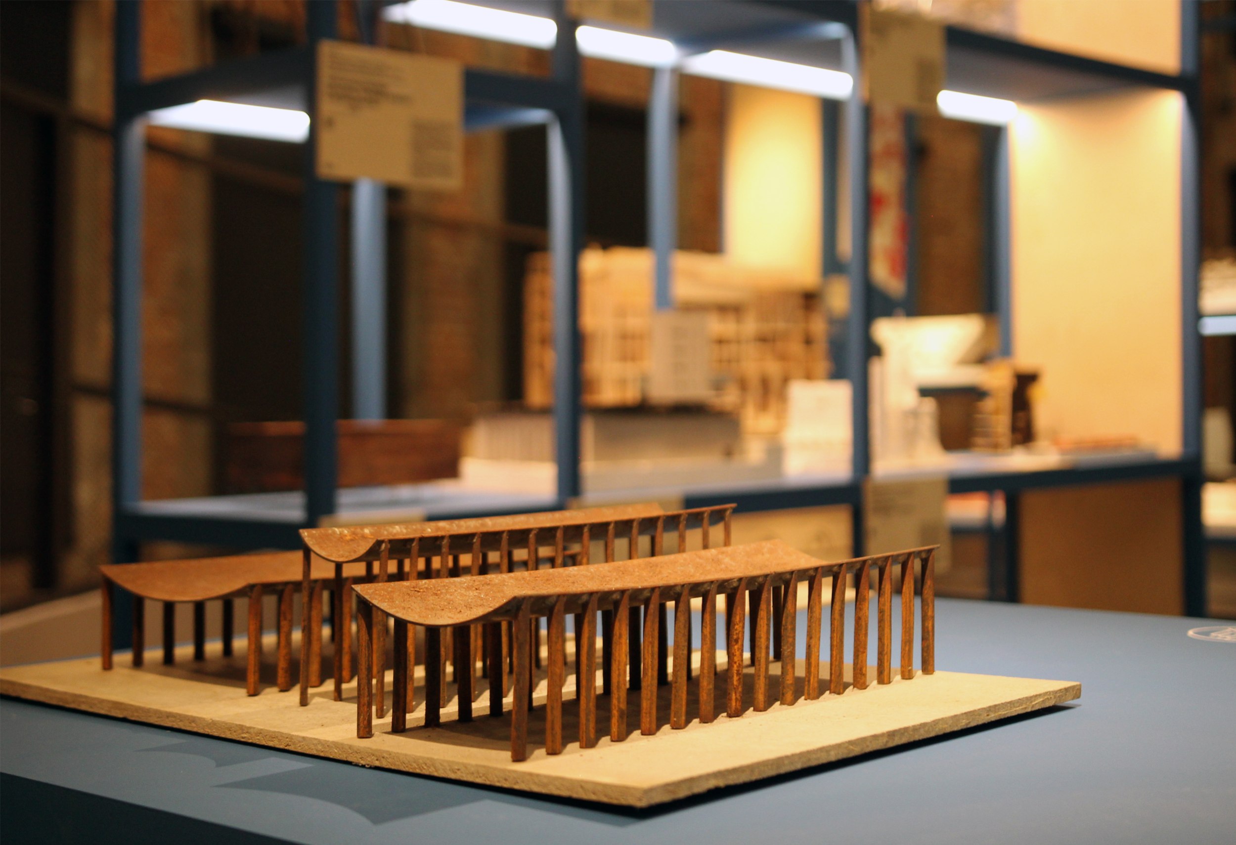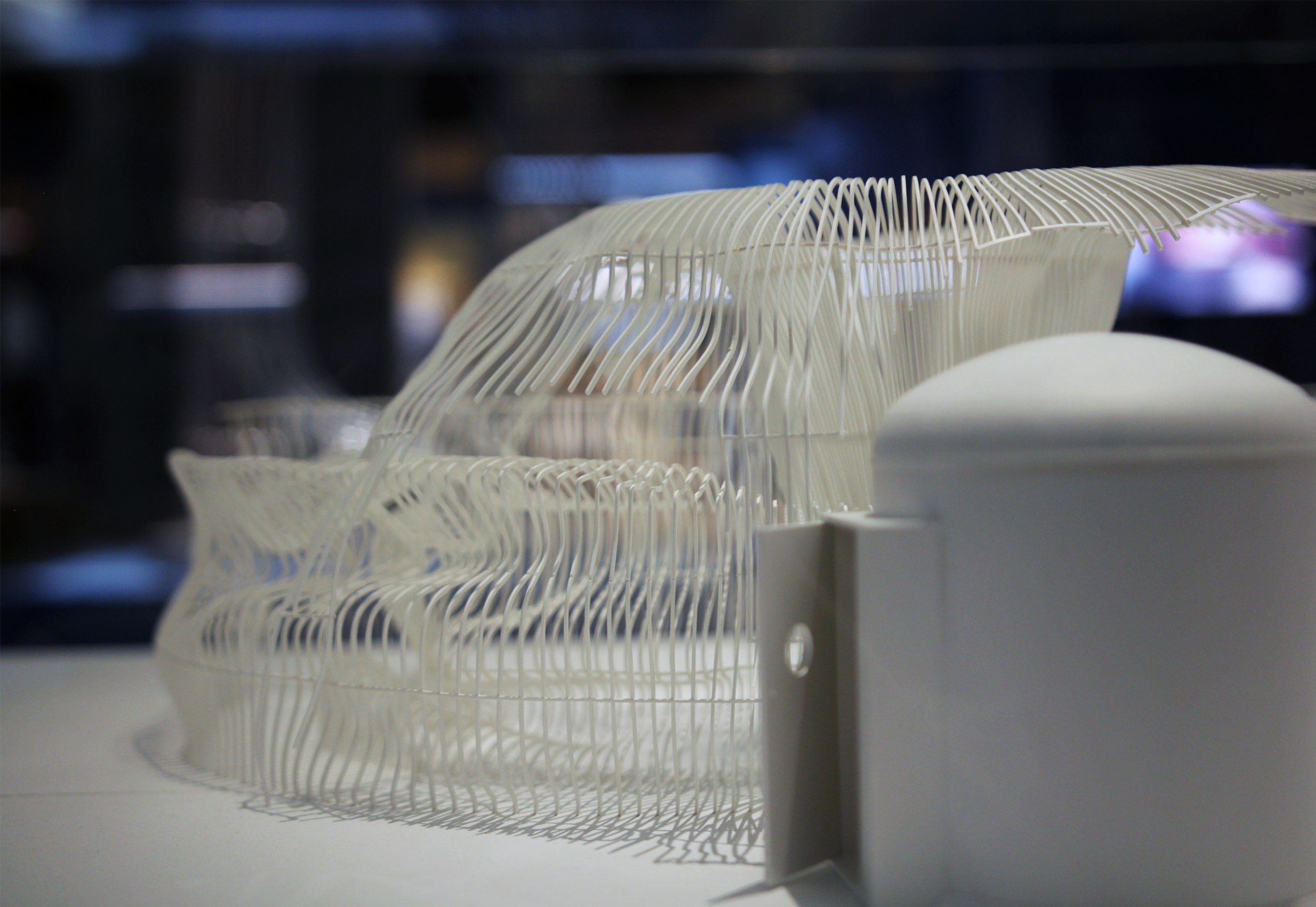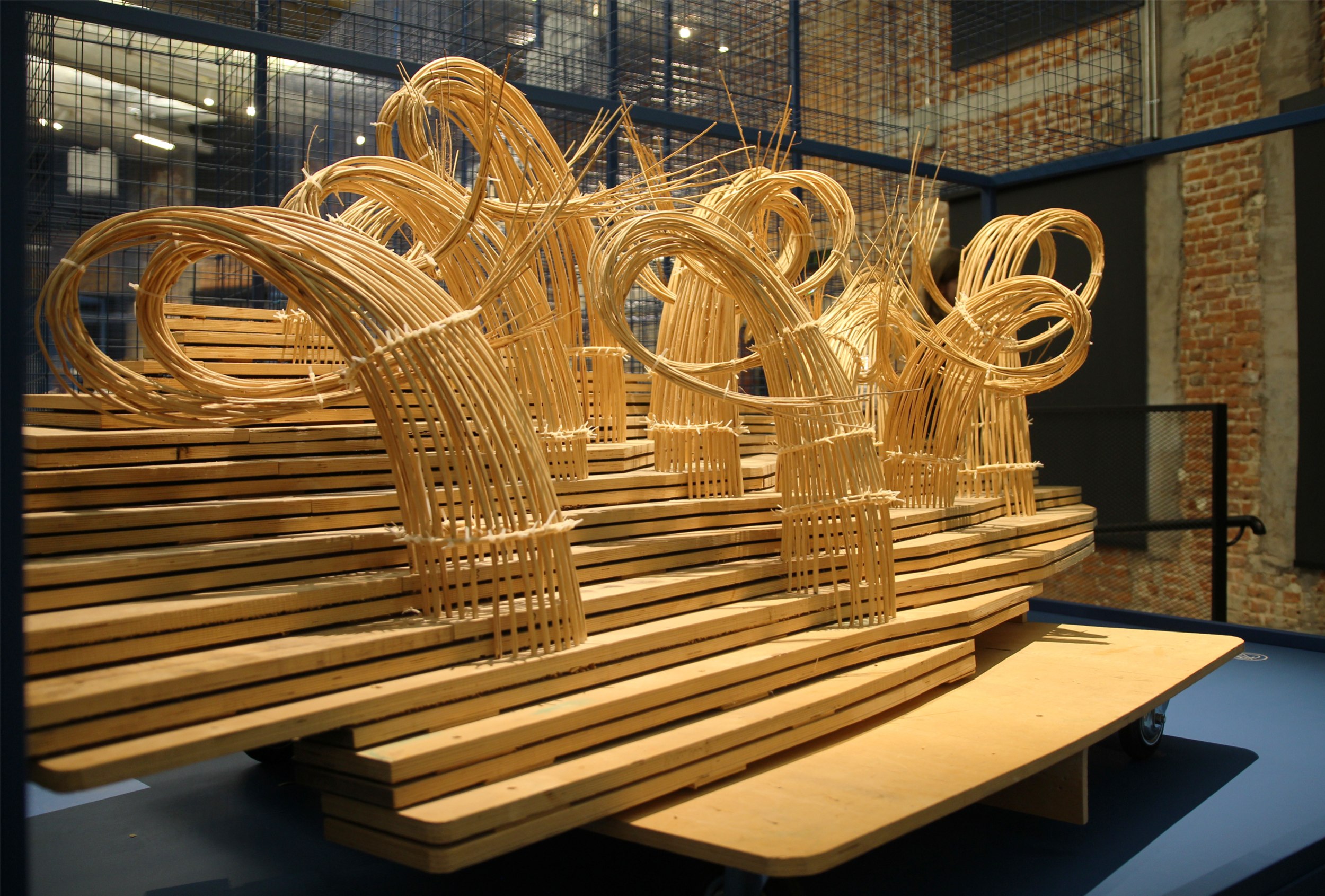 Куратор Илья Мукосей наполнил выставку материалом – да так, что тот едва поместился. Тут важно обследовать все уголки. Отбирали макеты не-«девелоперского» формата. Артистичные. Художественные, фактурные высказывания, родственные «арт-объектам». Есть и собственно объекты. На входе нас встречает рабочий макет «Волн», сделанных Николаем Полисским для Японии.