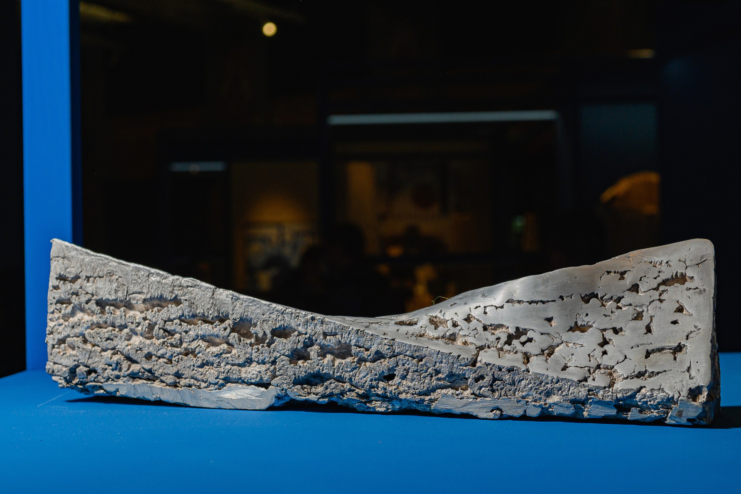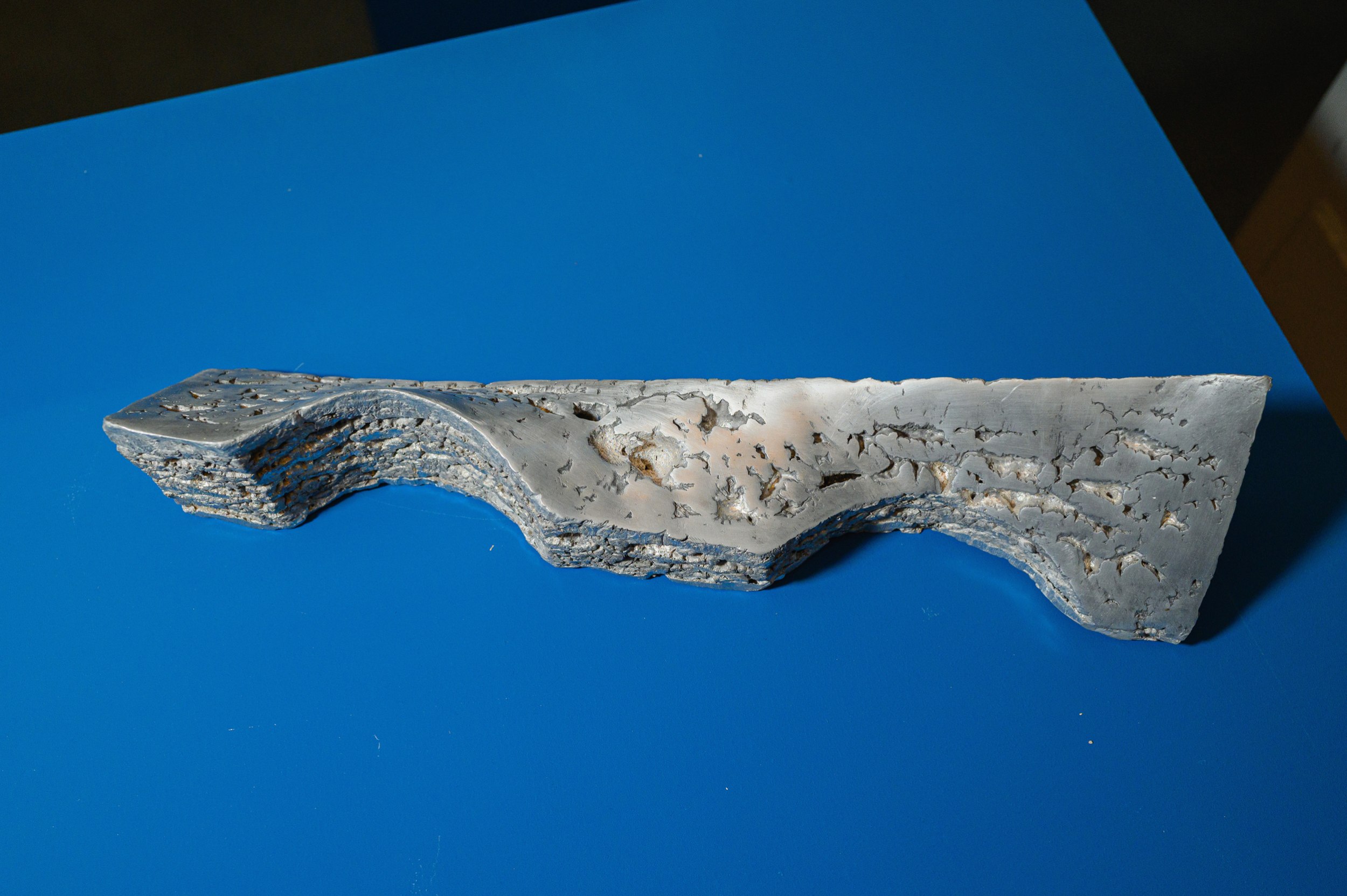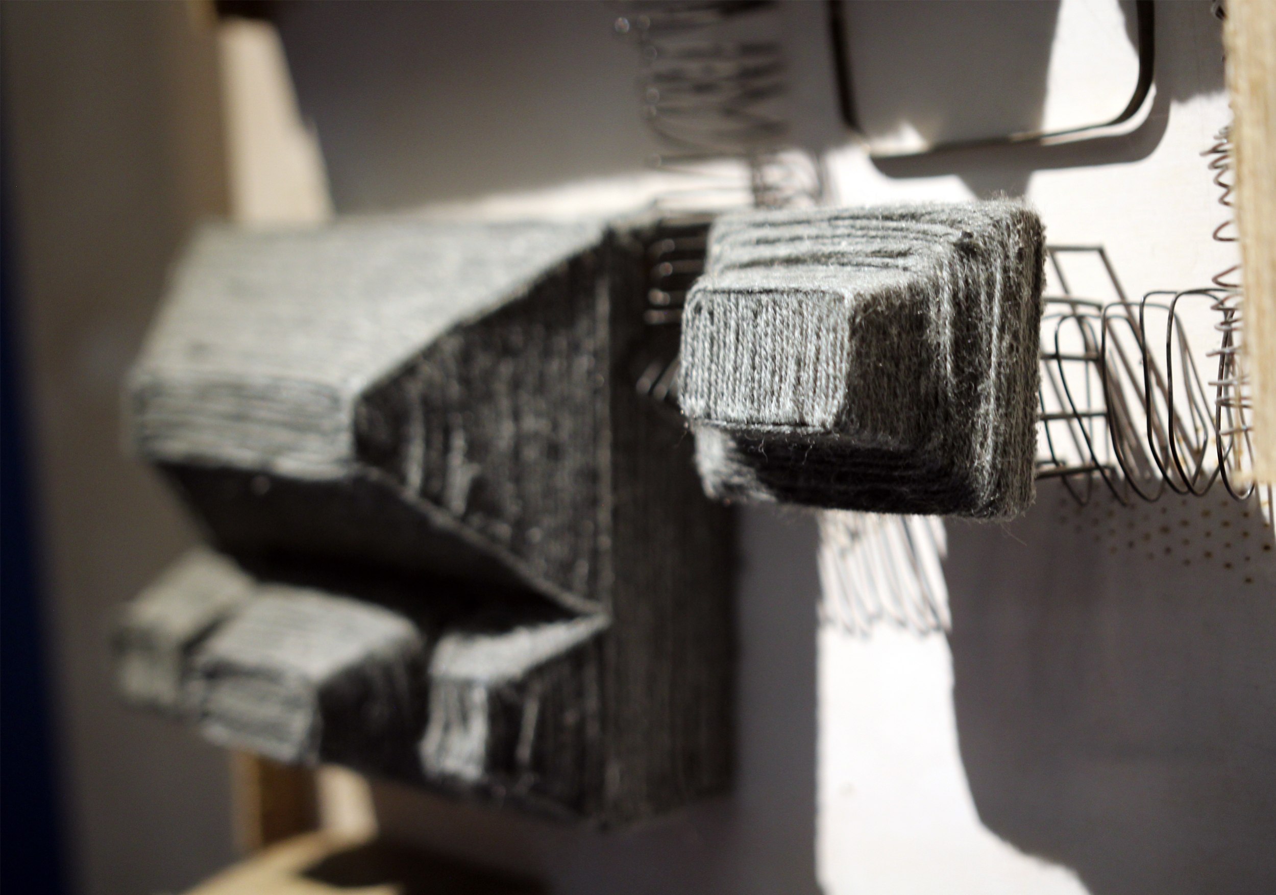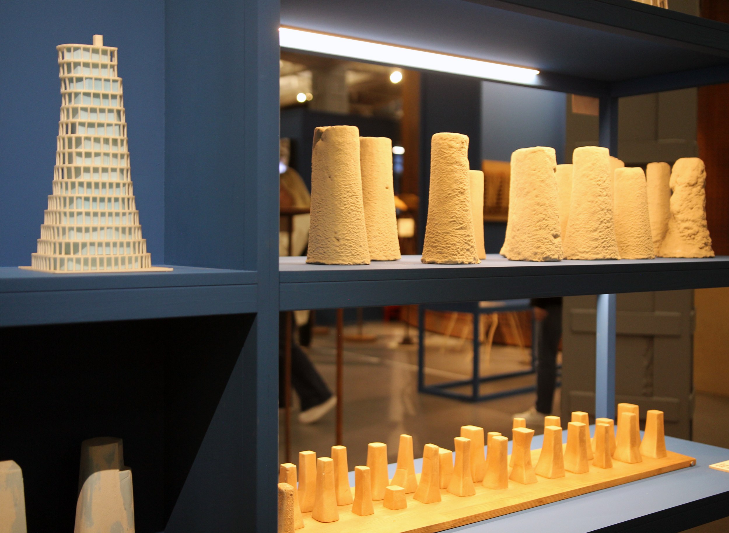 Куратор Илья Мукосей наполнил выставку материалом – да так, что тот едва поместился. Тут важно обследовать все уголки. Отбирали макеты не-«девелоперского» формата. Артистичные. Художественные, фактурные высказывания, родственные «арт-объектам». Есть и собственно объекты. На входе нас встречает рабочий макет «Волн», сделанных Николаем Полисским для Японии.