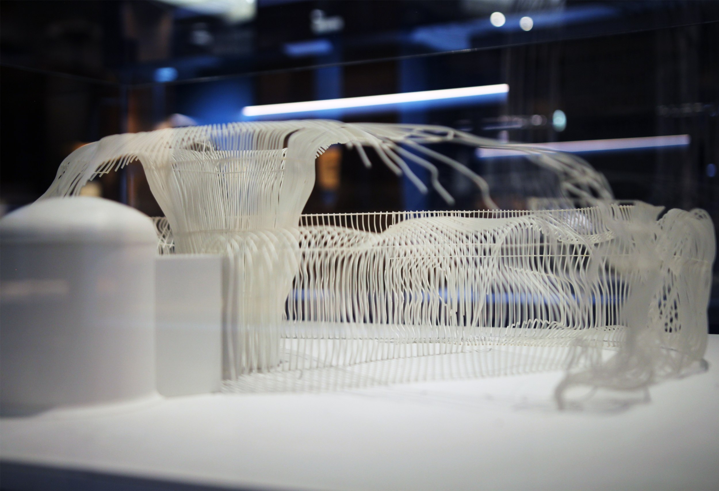 Если подумать, макетов башни первого участка тут даже и не два, а больше, поскольку есть еще блок «Макетной мастерской ГЕНПРО» с воркшопами. И там, в решетках двух стоек, башня выставлена в виде 3D-распечаток, причем не только итоговая версия, а еще несколько других. «...Сергей так быстро предлагал варианты, что мы едва успевали распечатывать», – говорит в день открытия женский голос у меня за спиной, не знаю чей...