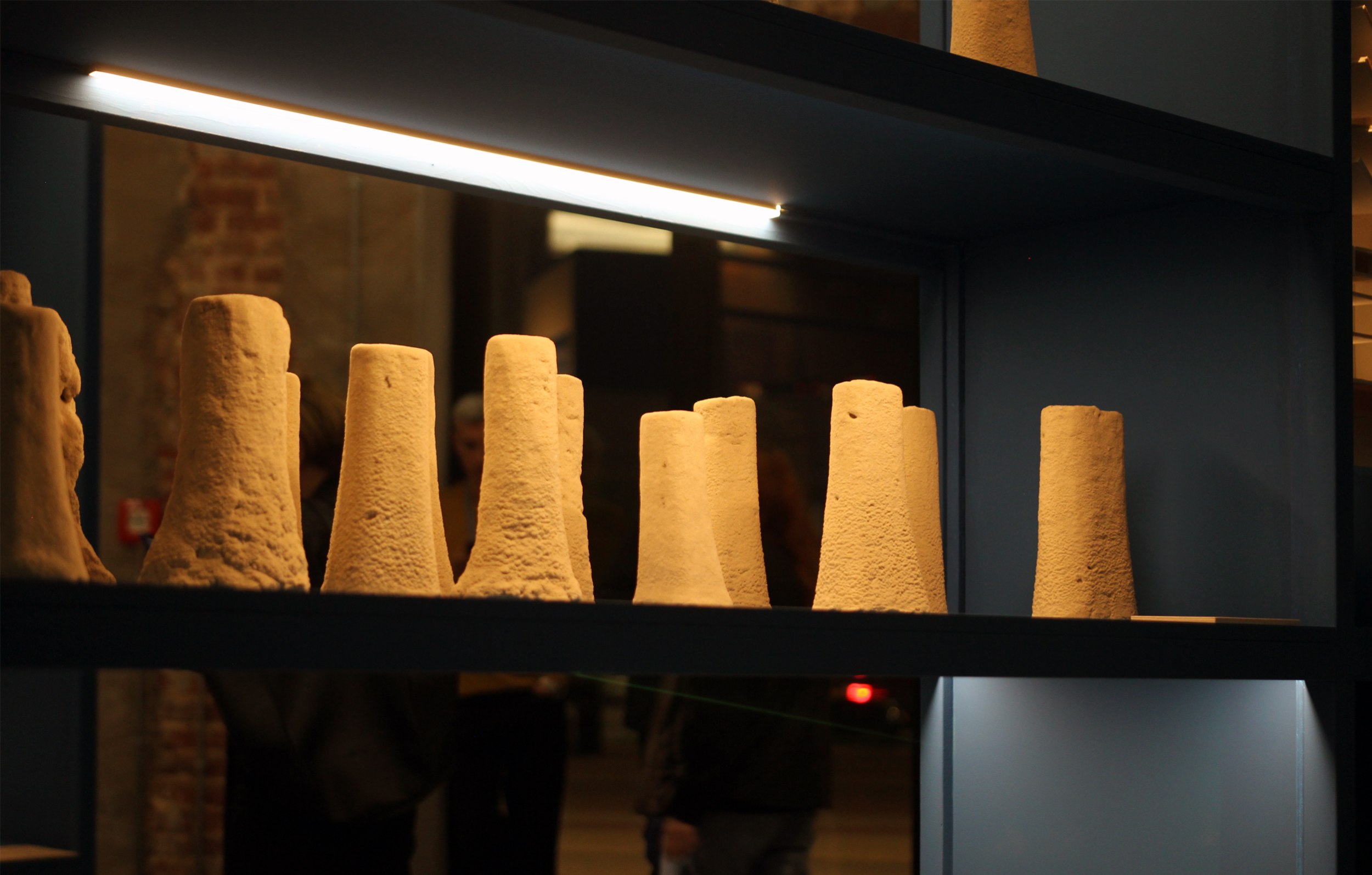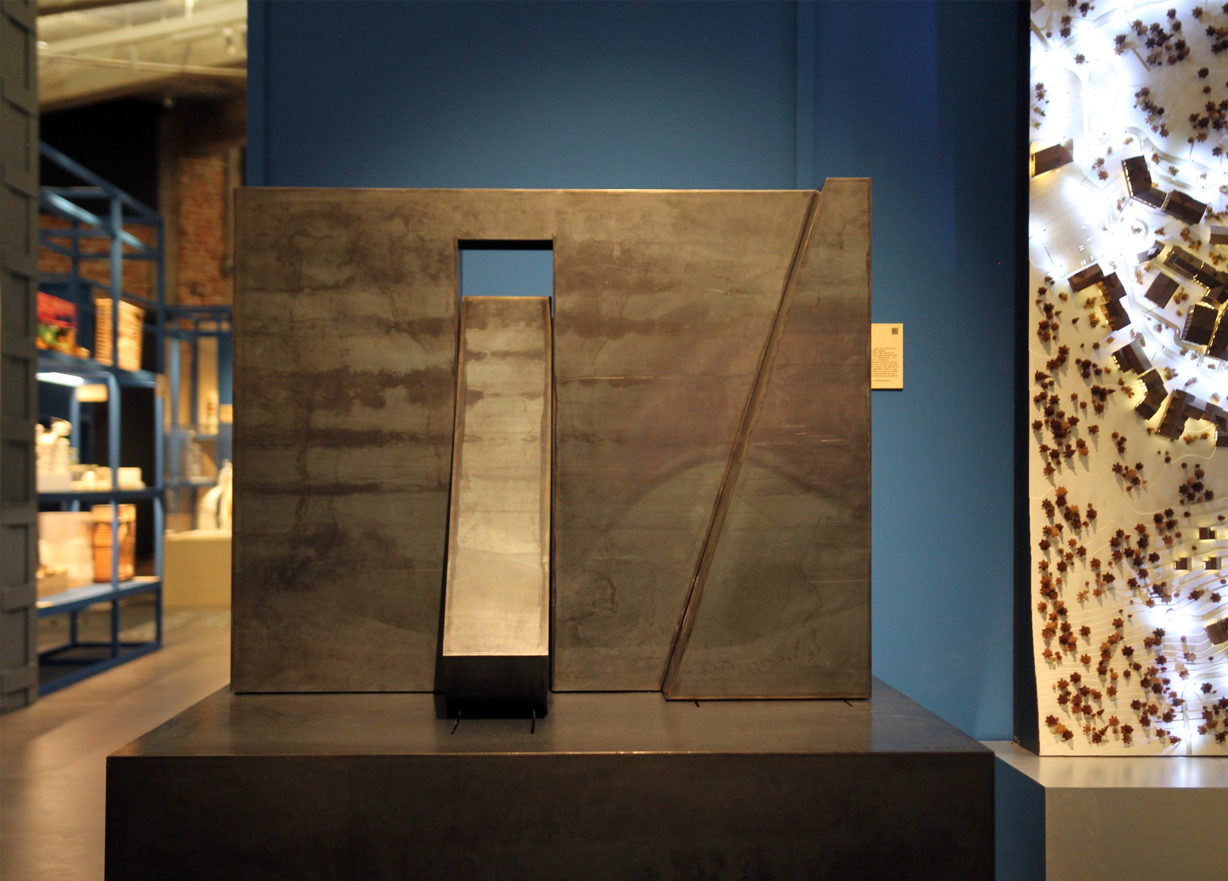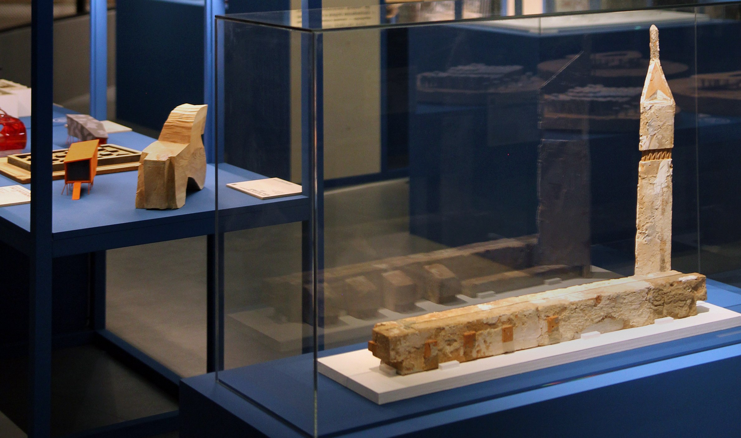 Еще один факт истории – НКЦ Юлия Борисова: хайтечное стеклянное здание, показанное в макете через подчеркнуто архаичную лепную глину. Макет был сделан для выставки Museum Loci куратора Анны Мартовицкой – и оказался одним из тех редких экспонатов, которые ГНИМА взял впоследствии в фонды.