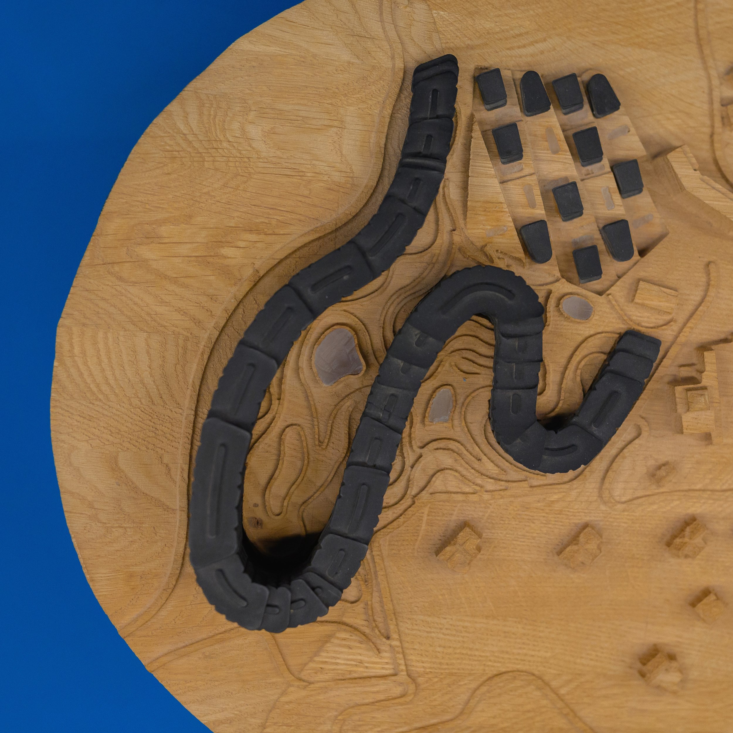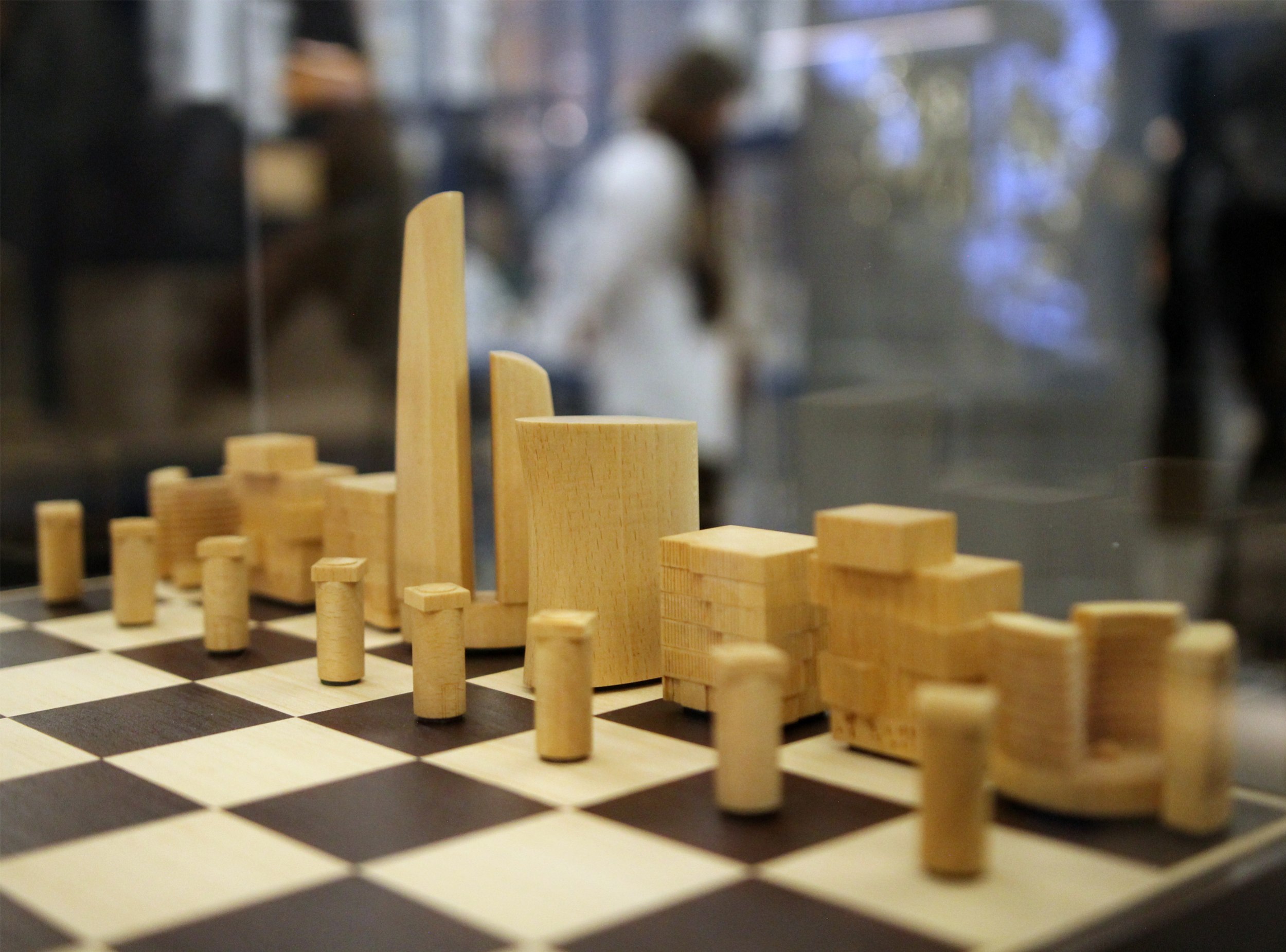 Отдельная тема – игрушки, они тоже могут срастаться с макетами. А те могут двигаться, как заводные: например, макет ЖК во 2-м Силикатном проезде Ивана Грекова и KAMEN из «сырого» железа. СПИЧ показывает юбилейные шахматы 2017 года, где фигурки – проекты бюро.