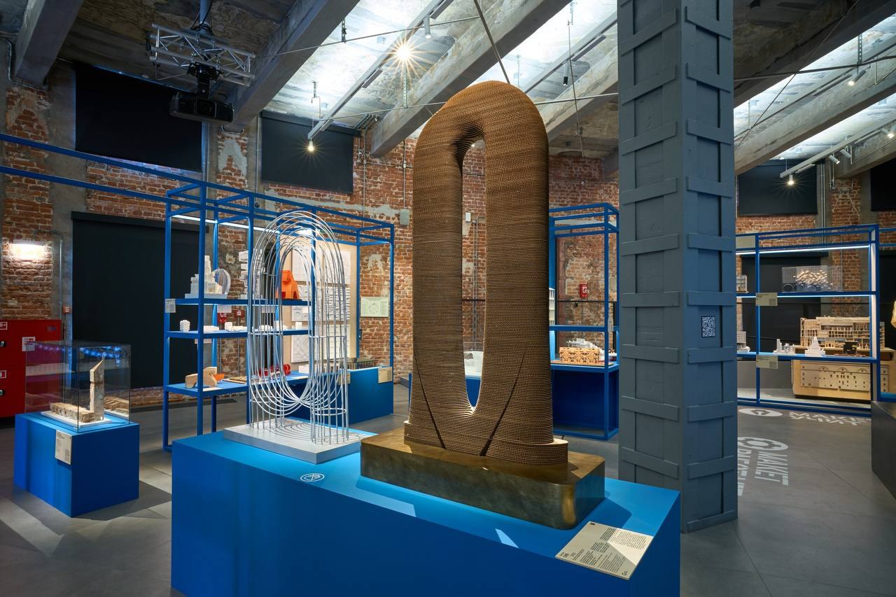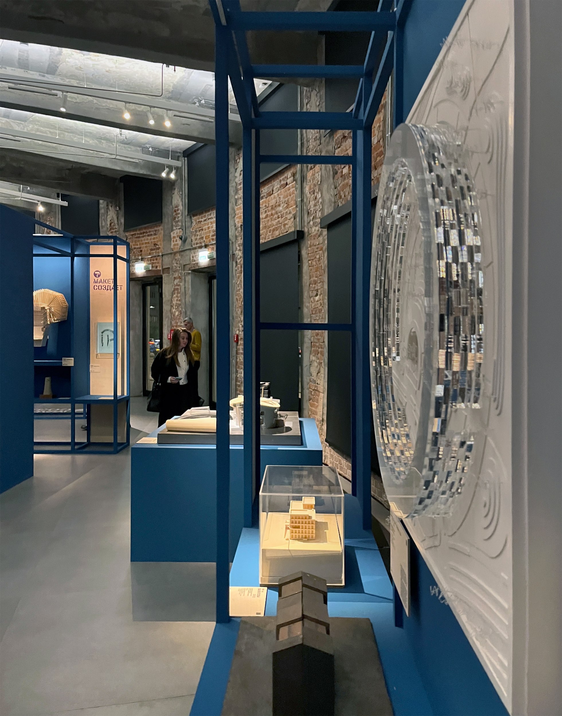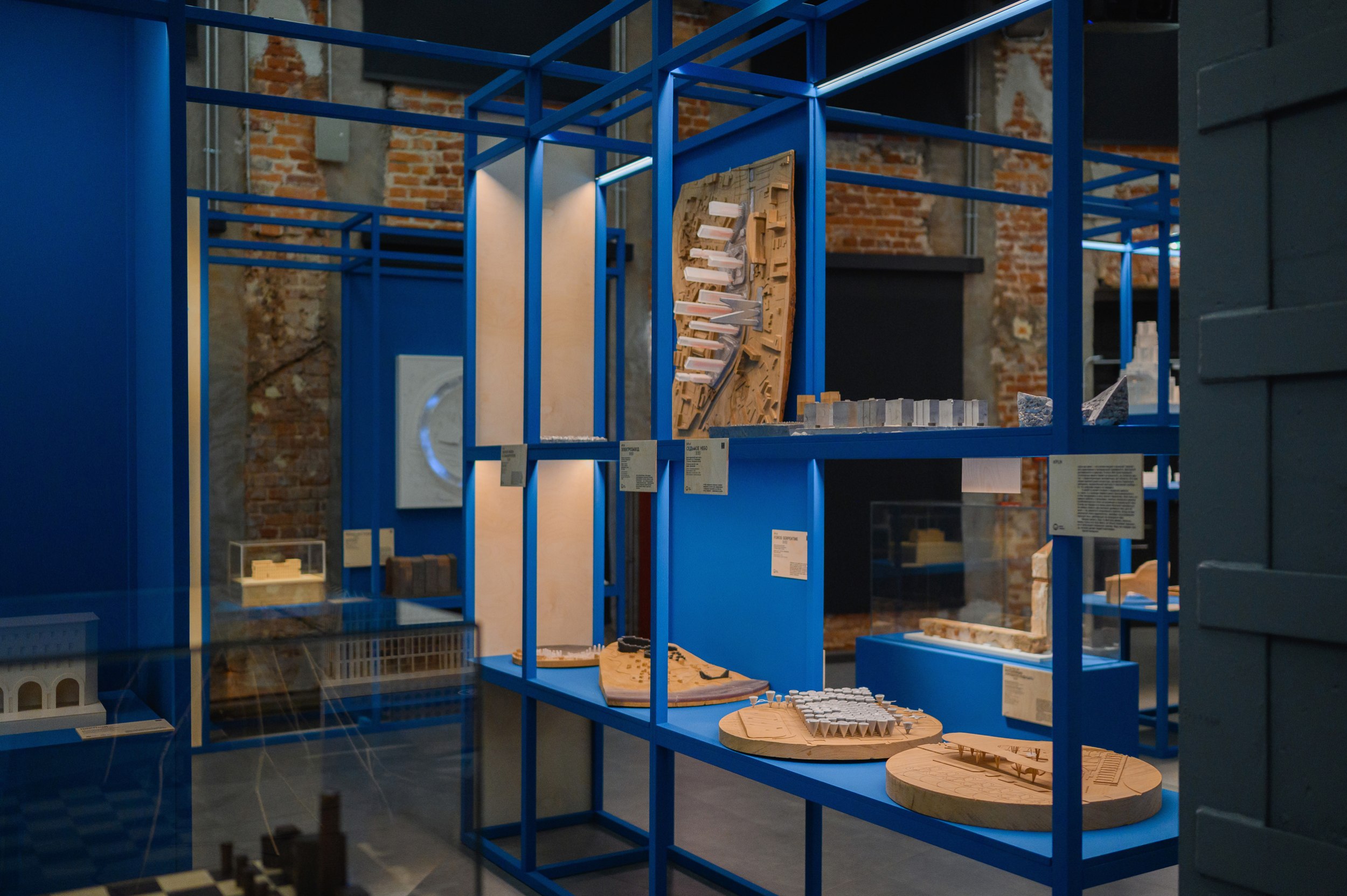 О выставке «Внутри города. Искусство архитектурного макета» мы уже рассказывали. Организовал ее Даниил Катриченко, основатель и руководитель компании Генпро, поддержал главный архитектор Москвы Сергей Кузнецов. Дизайн экспозиции сделала Юлия Наполова и ее бюро PS Culture. От них – синий цвет стеллажей, на таком фоне деревянные и глиняные макеты получаются на фотографиях красными – и металлические сетки со схематическими трехмерными распечатками известных зданий внутри.