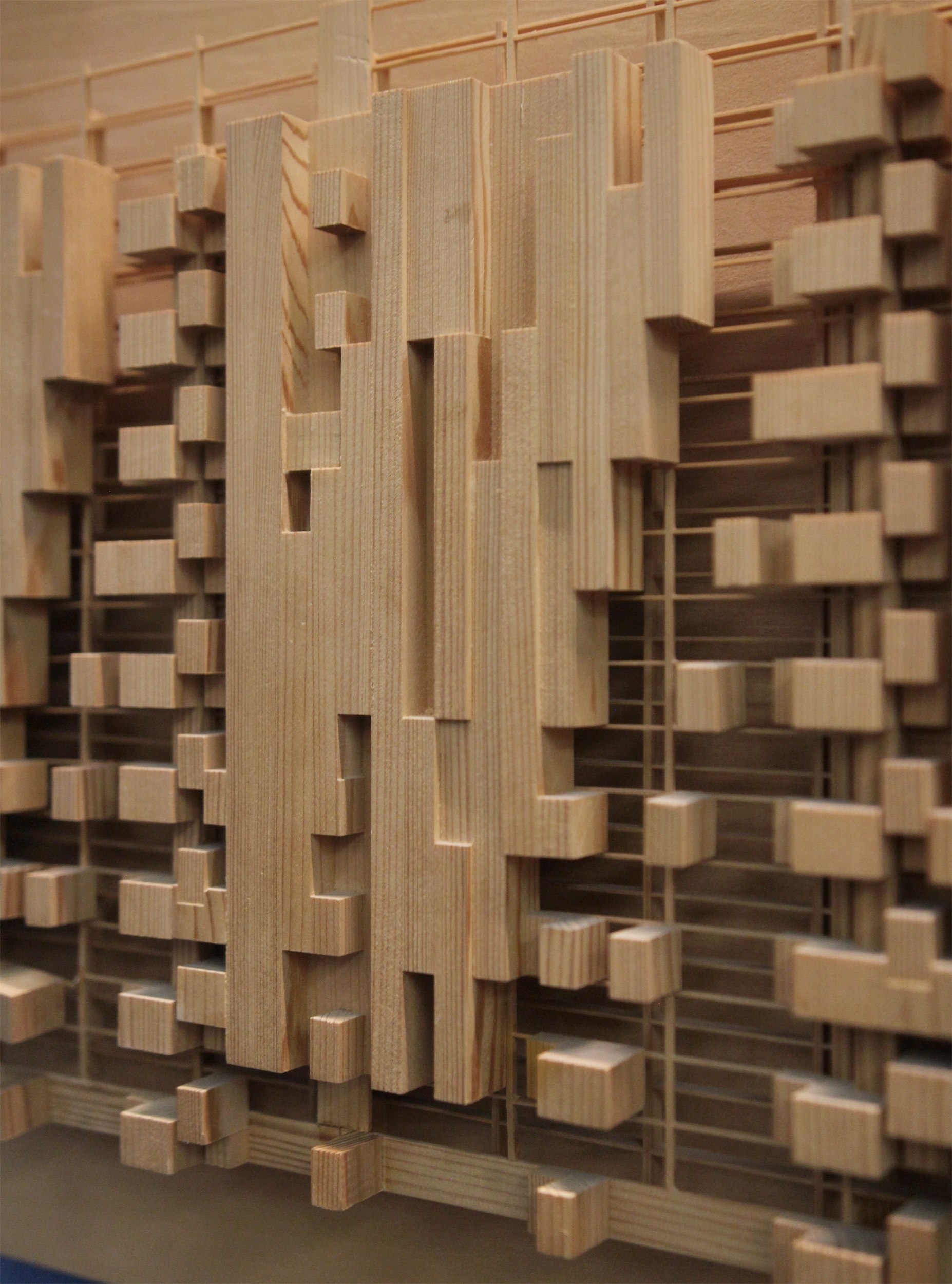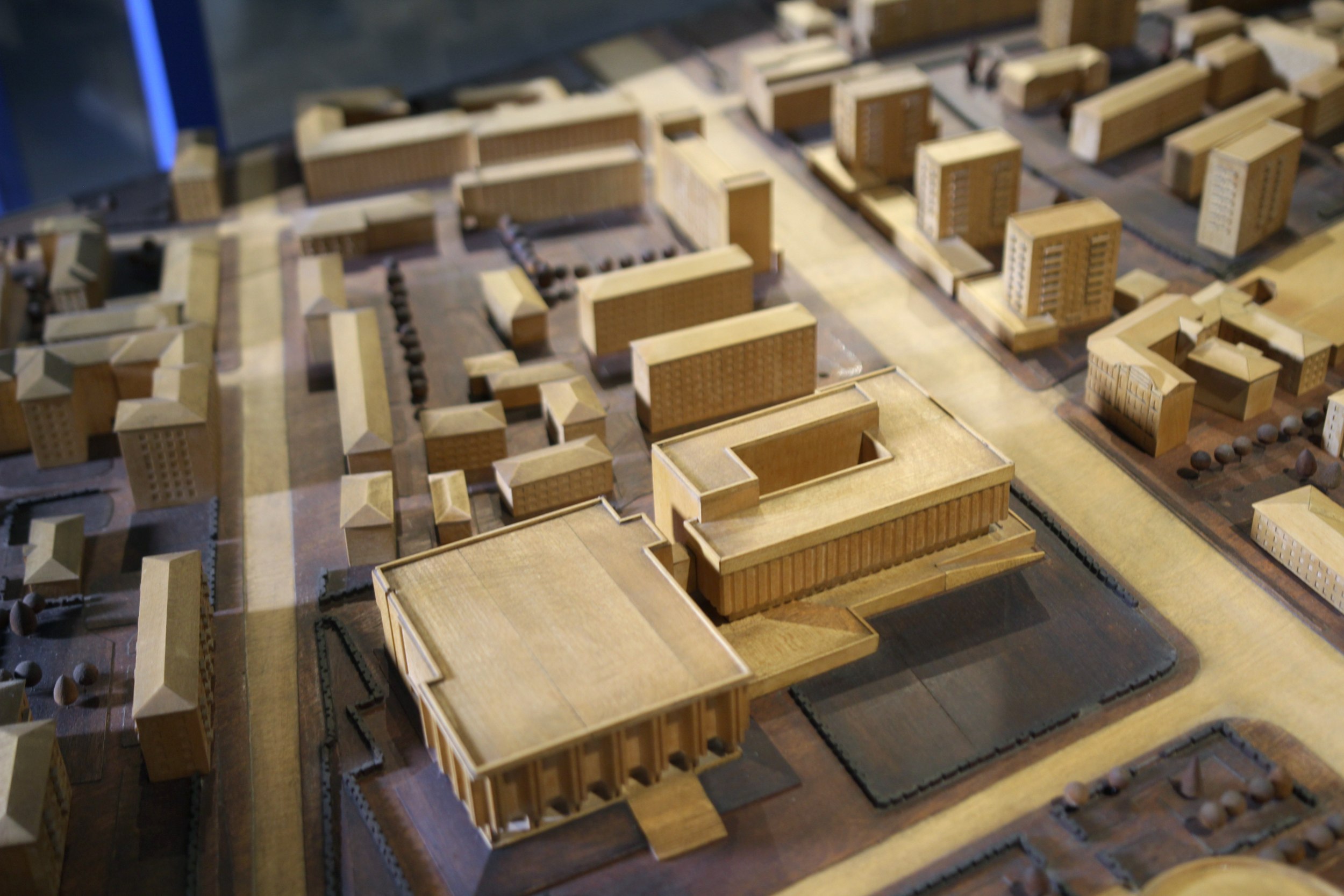 Если же исследовать архитектурный макет более целенаправленно, то можно вспомнить, что в почти каждом архбюро на стенах и столах полным-полно макетов и для поиска формы, и для предварительной, не художественной, презентации. Для рассмотрения проекта в ткани города. Обычно это фрагмент застройки, выполненный с сером или коричневом тоне, куда вставлен белый такой новый объектик – и вот его-то, или их, можно менять, устанавливая на одно и то же место.