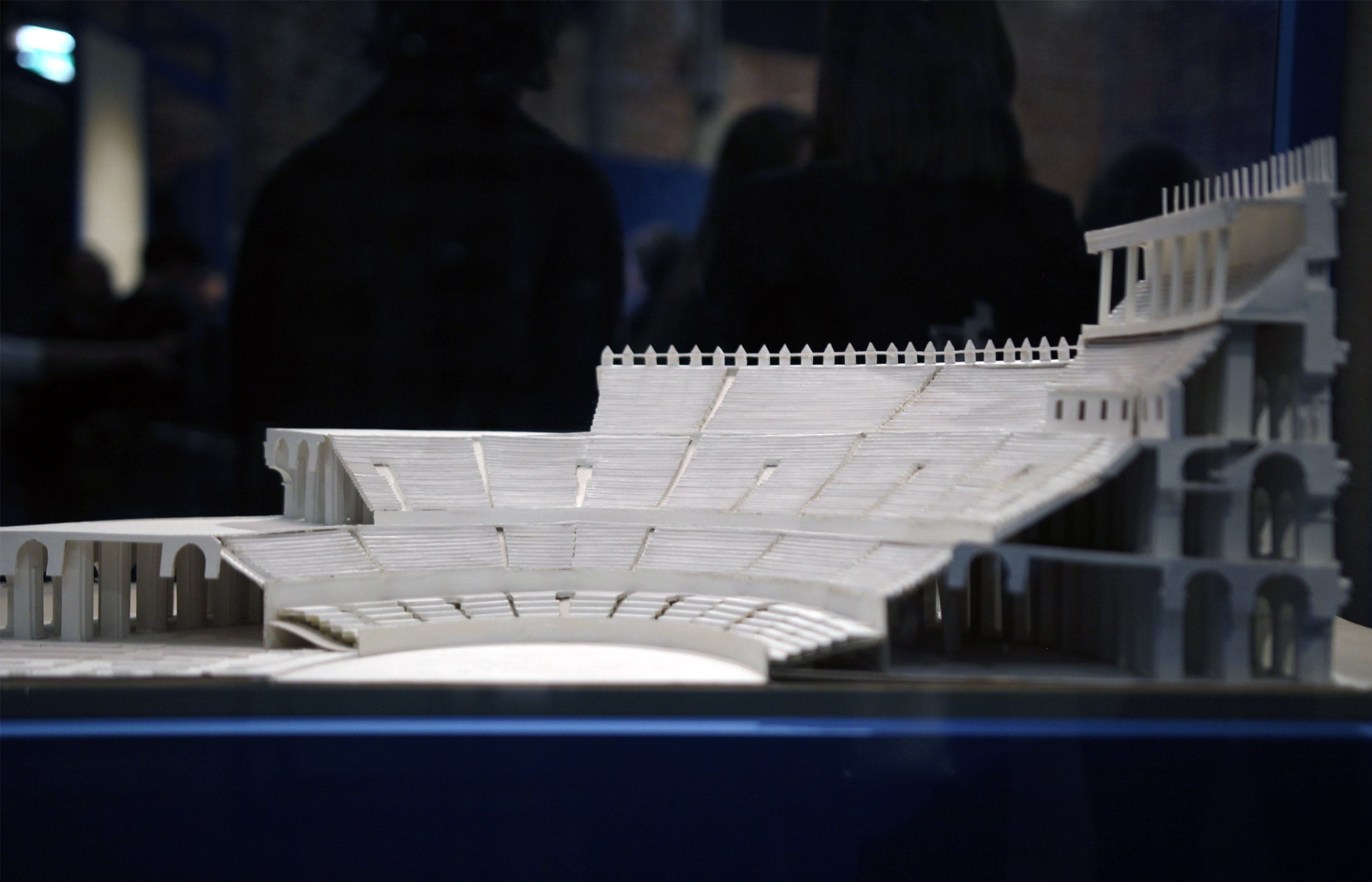 Так или иначе, а Колизей (не Яцеки и не Меганом) – ну, если подумать – кажется в контексте выставки самой очевидной парой новой башне One. В исторической половине от Колизея раскручивается смысловая и пространственная пружина, он в начале хронологии. В половине Новейшего времени вся диалектика приходит к макету башни One Сергея Кузнецова, Дмитрия Сухова и Генпро. Они на разных концах некоей цепочки, как начало и конец.