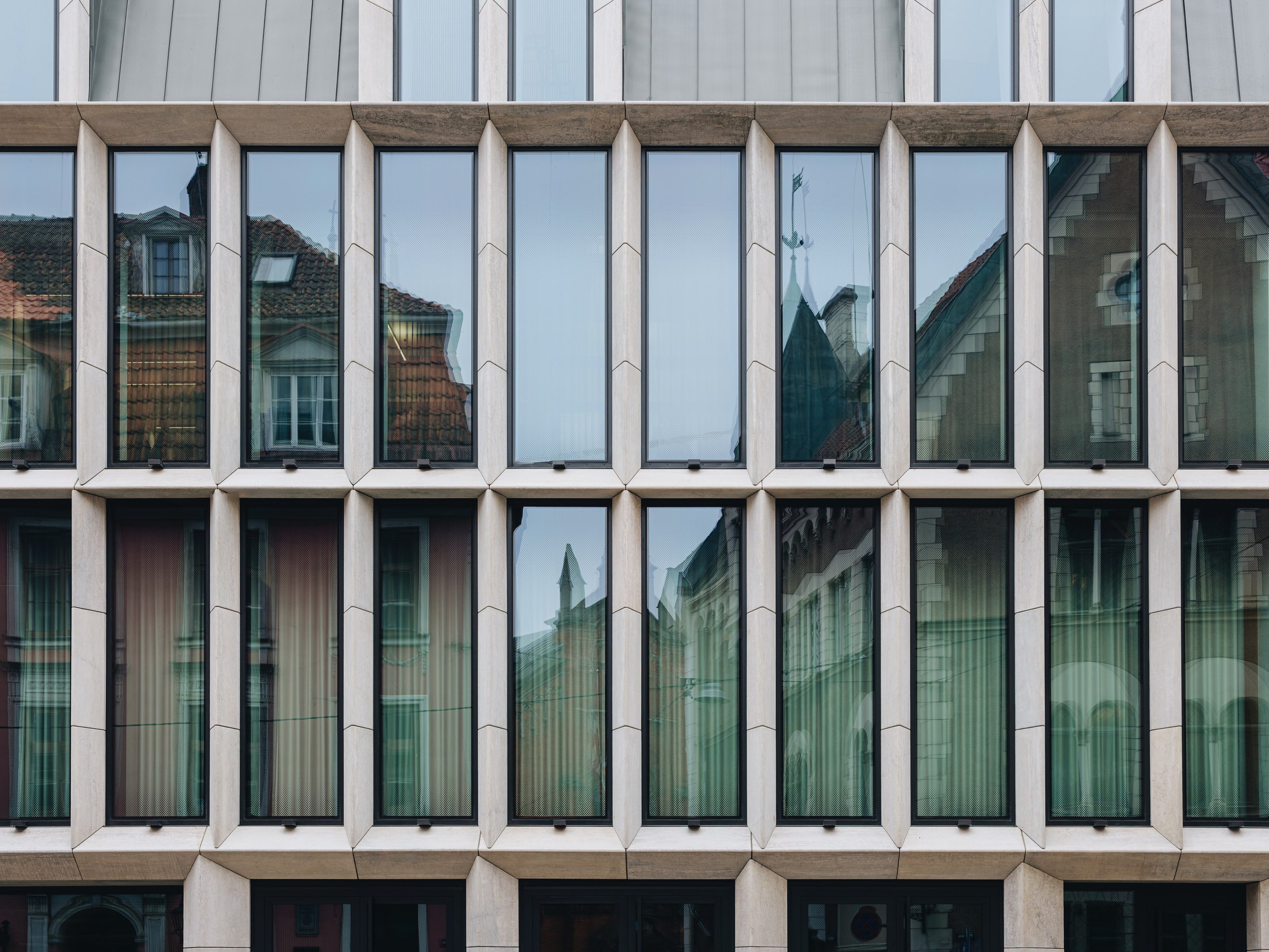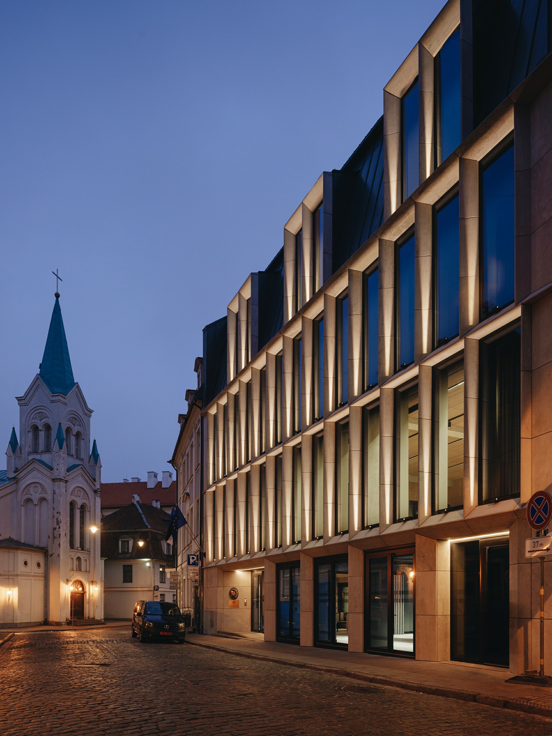Здание деликатно вписано в историческую застройку, высота и рисунок фасада соответствуют масштабу улицы, в вечернее время архитектонику подчеркивает дизайнерская подсветка.