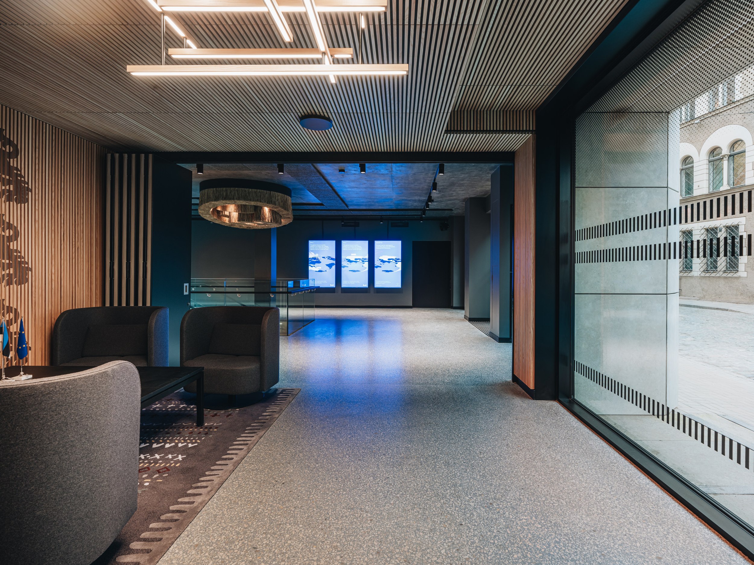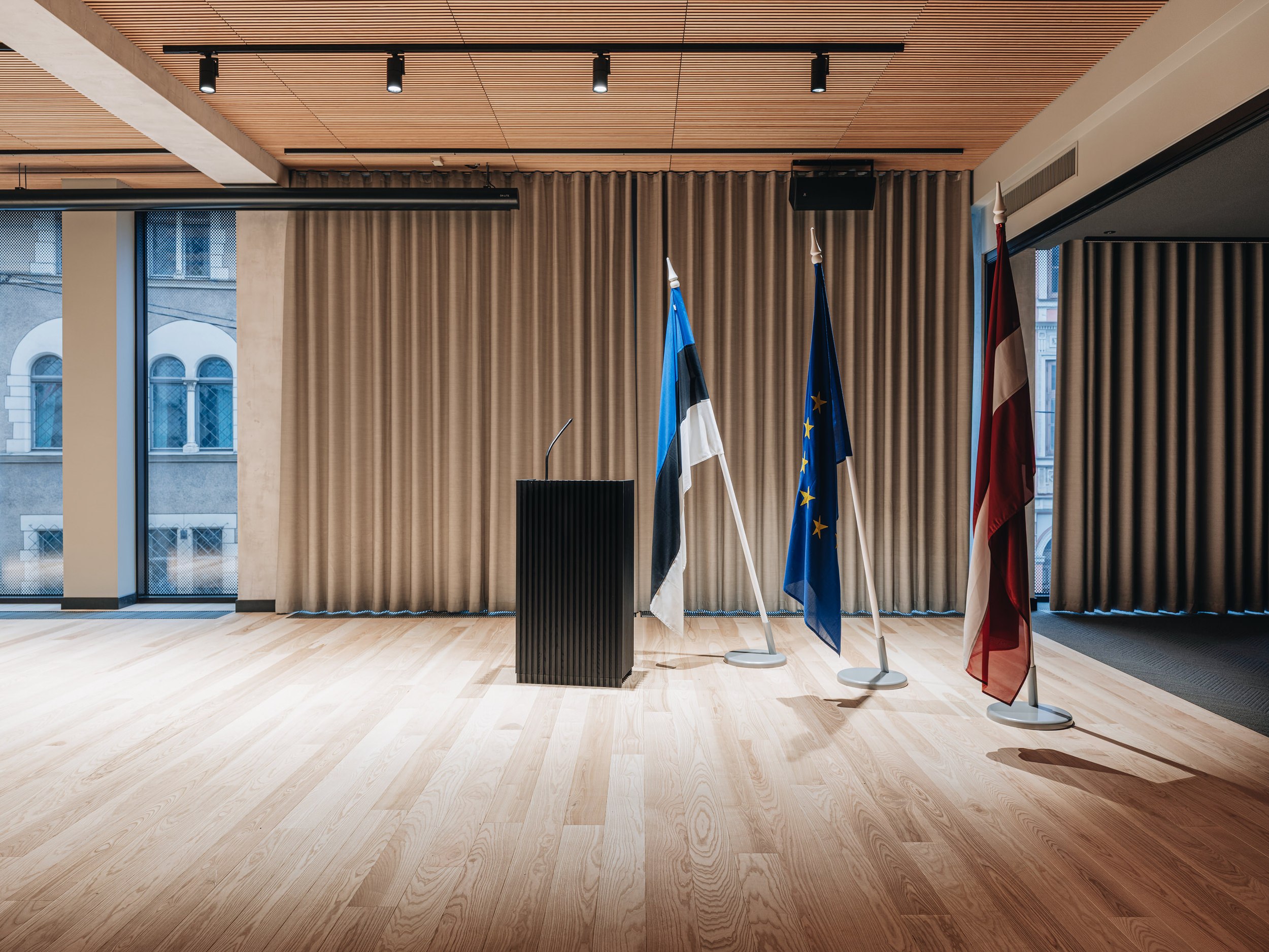 Камень для облицовки выбран не случайно. Это Каарма – серый известняк с голубоватым оттенком, который считается национальным символом Эстонии, и это подчеркивает статус и функцию объекта.
