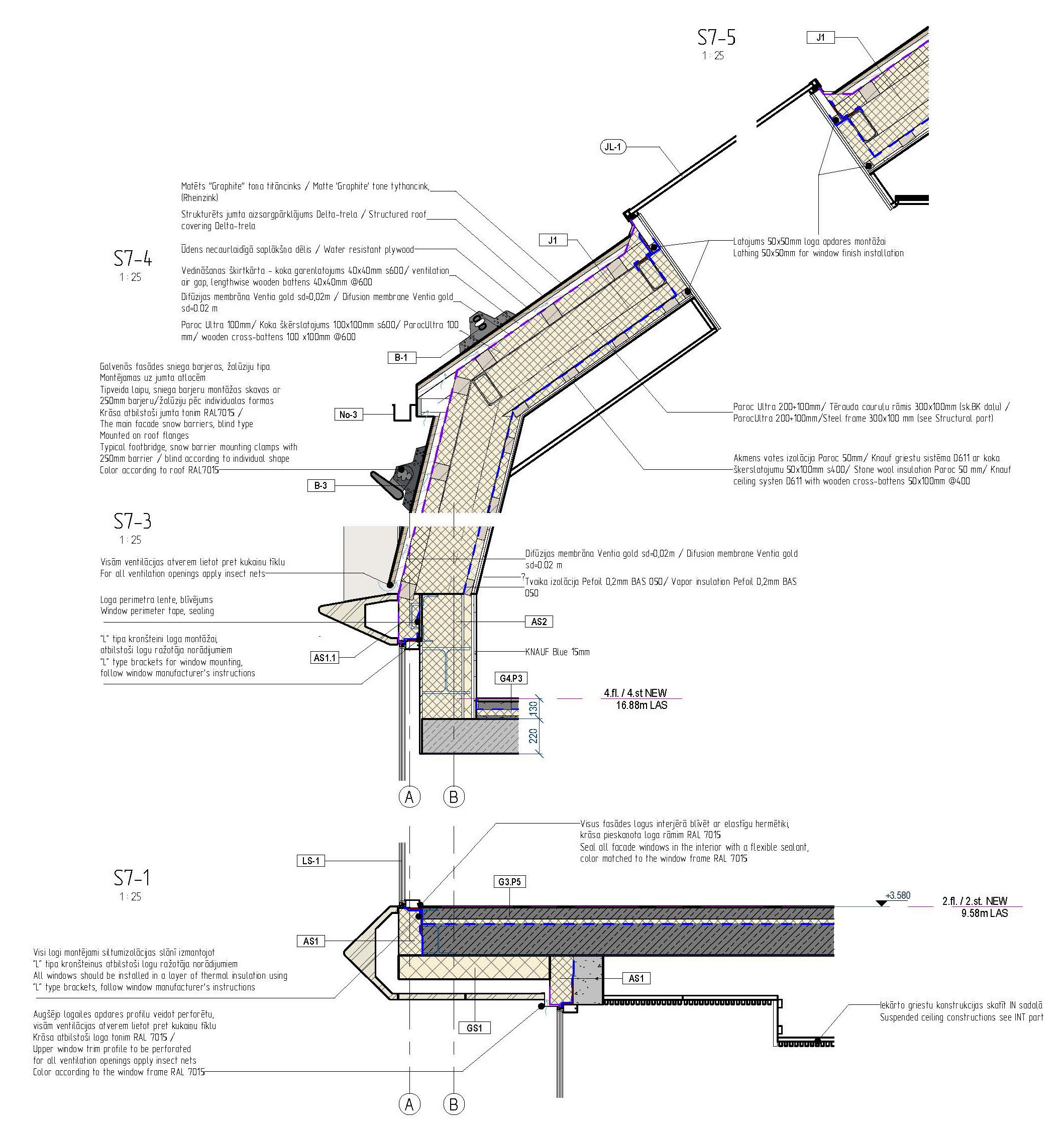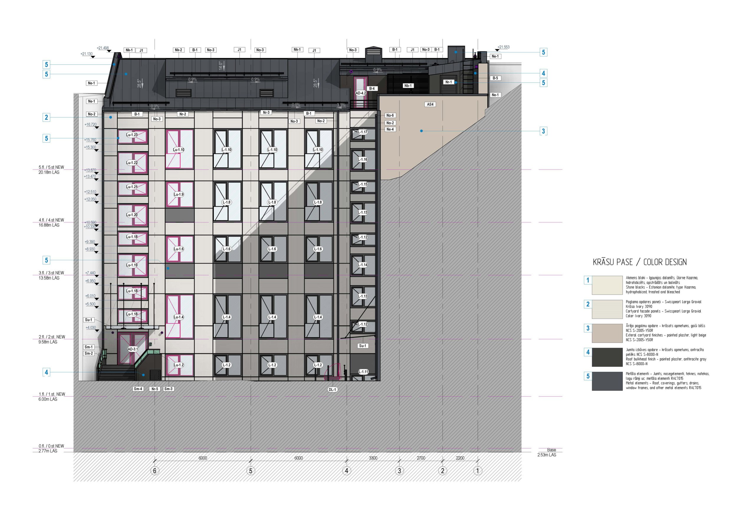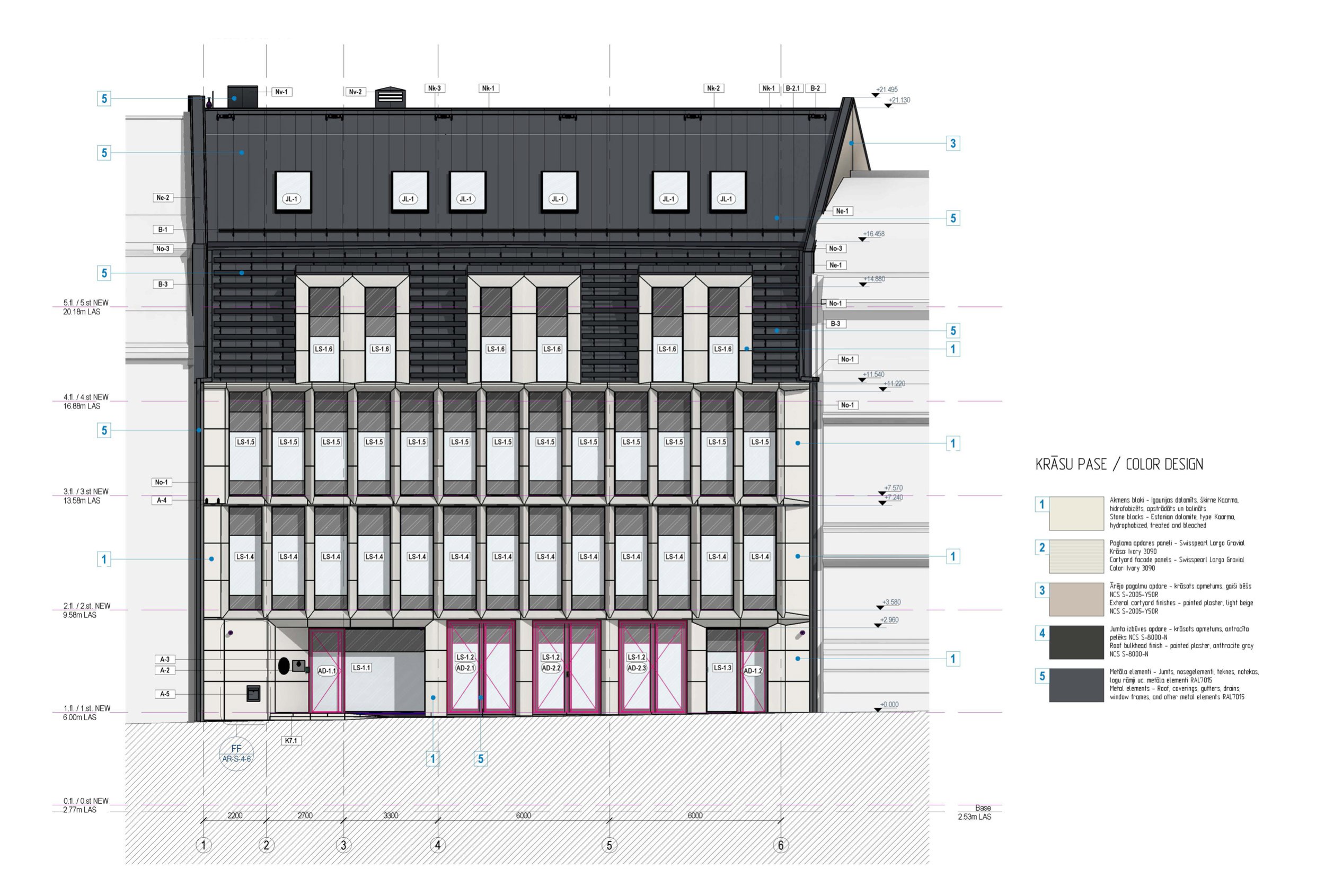 Архитектурной особенностью проекта является стеклянный фасад с большими окнами-витринами. Общим геометрическим рисунком фасад повторяет своего советского предшественника, но совершенно в ином, современном ключе. Окна обрамлены сильно выступающими карнизами и ламелями сложной трехмерной формы, вырезанными из цельных каменных блоков, что стало первым примером трехмерной резки массивов камня в фасадной отделке в странах Балтии. Все ламели различаются по профилю и установлены таким образом, что при движении вдоль фасада создается впечатление набегающей волны.