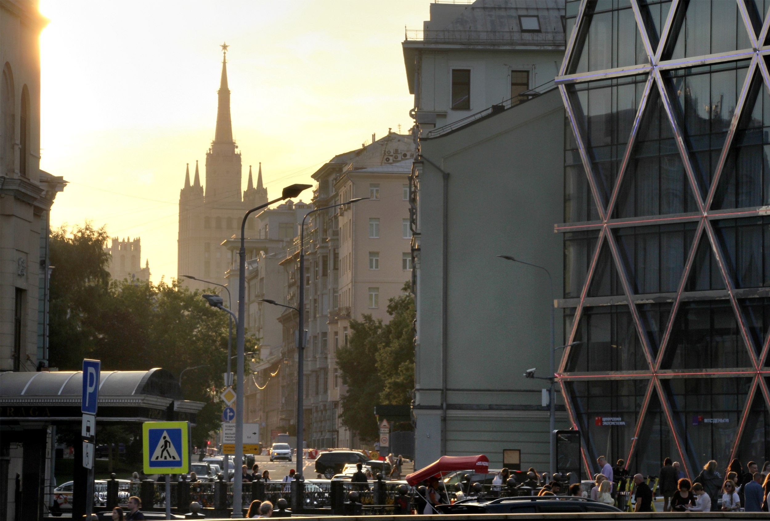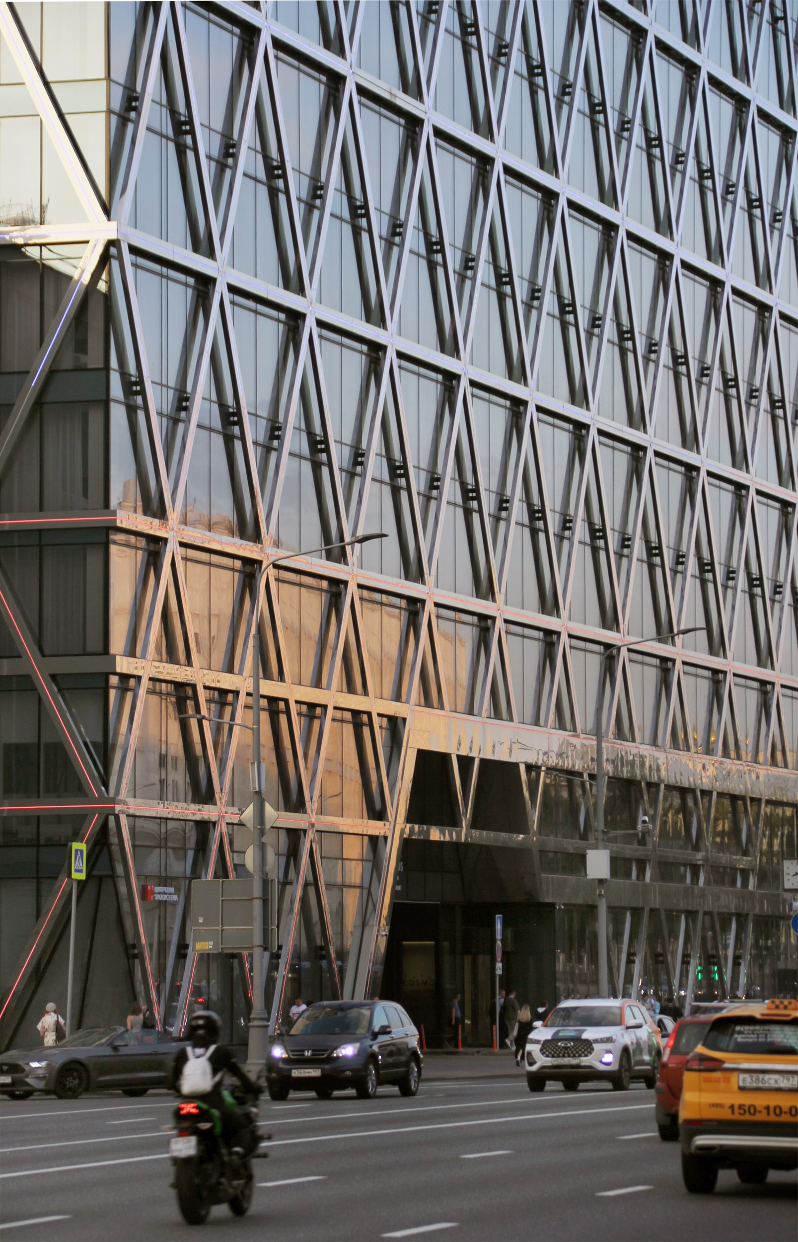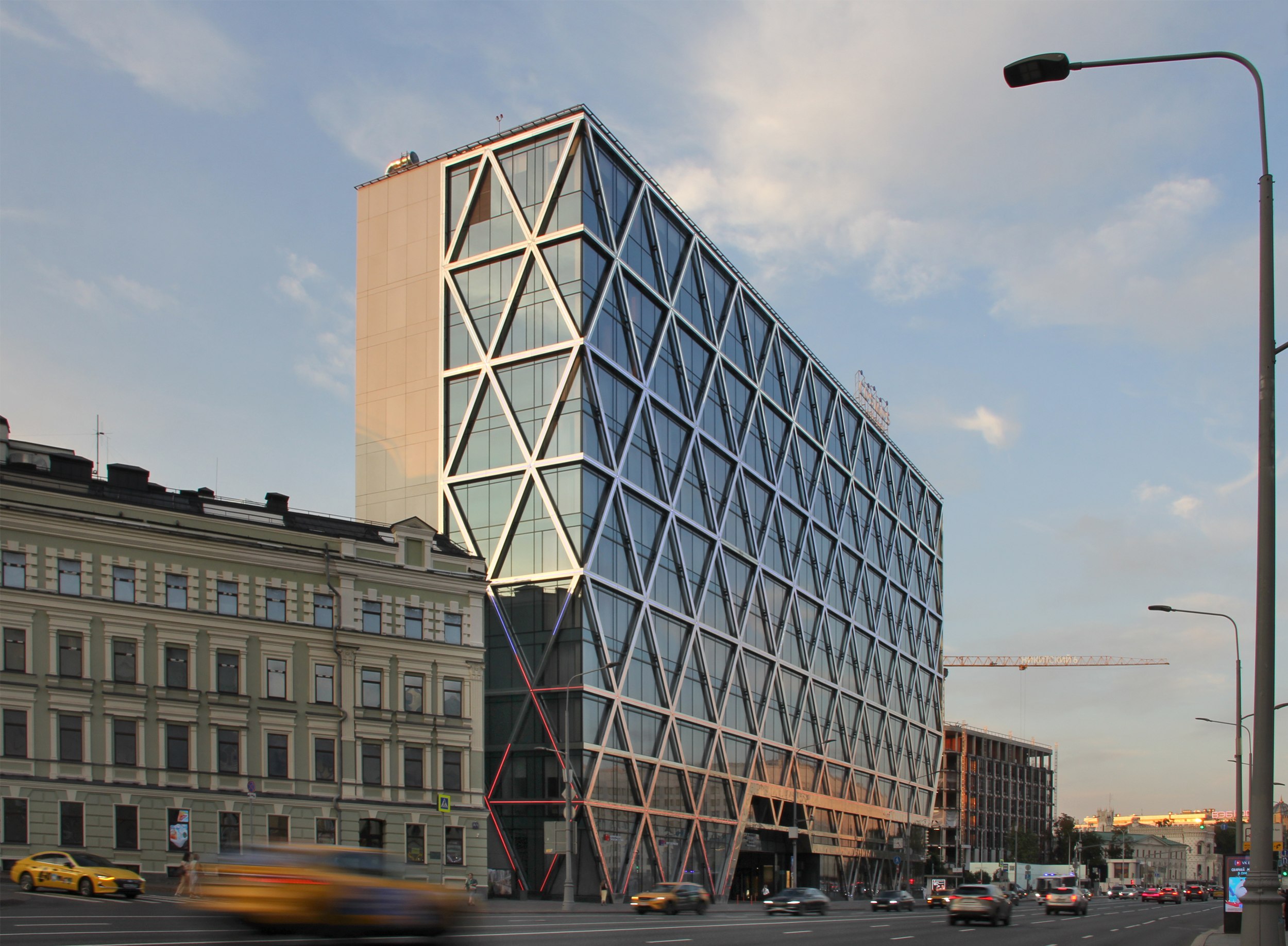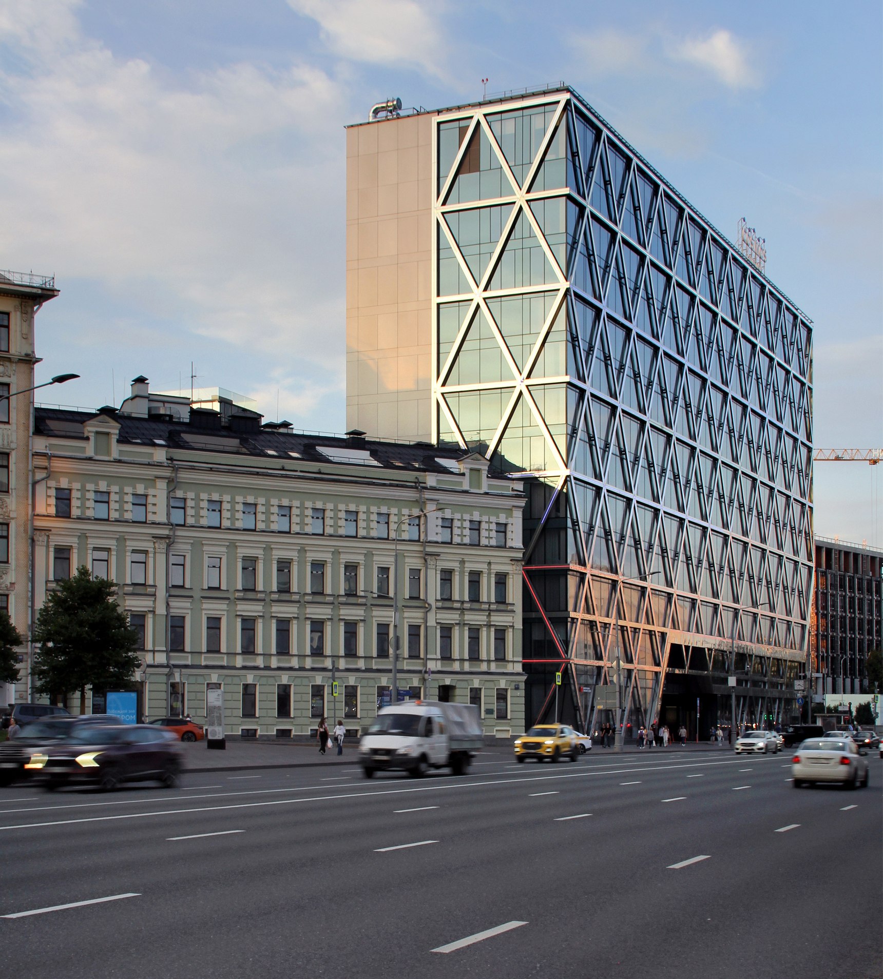 Но. Удивительно, насколько в данном случае сетка линий, пусть и не ставшая экзоскелетом, вытягивает всё, делает неправильности реализации не особенно заметными. Говорят, бывают в физике силовые линии, так вот и в архитектуре они тоже бывают. Супер-графика работает сама по себе, с разных расстояний – замысел считывается, говорит, работает акцентом как площади, так и проспекта. Создает достойную современную пару ротонде «Праги», образуя вместе с ней пропилеи выезда из центра на запад – которых раньше не было. Несложно тут увидеть символ-обозначение, ну или если избегать громких слов – то намек – на двойственную природу Москвы, города контрастов, непринужденно сочетающего историю с, в широком смысле, авангардом. Москва определенно не собирается останавливаться на этом пути.