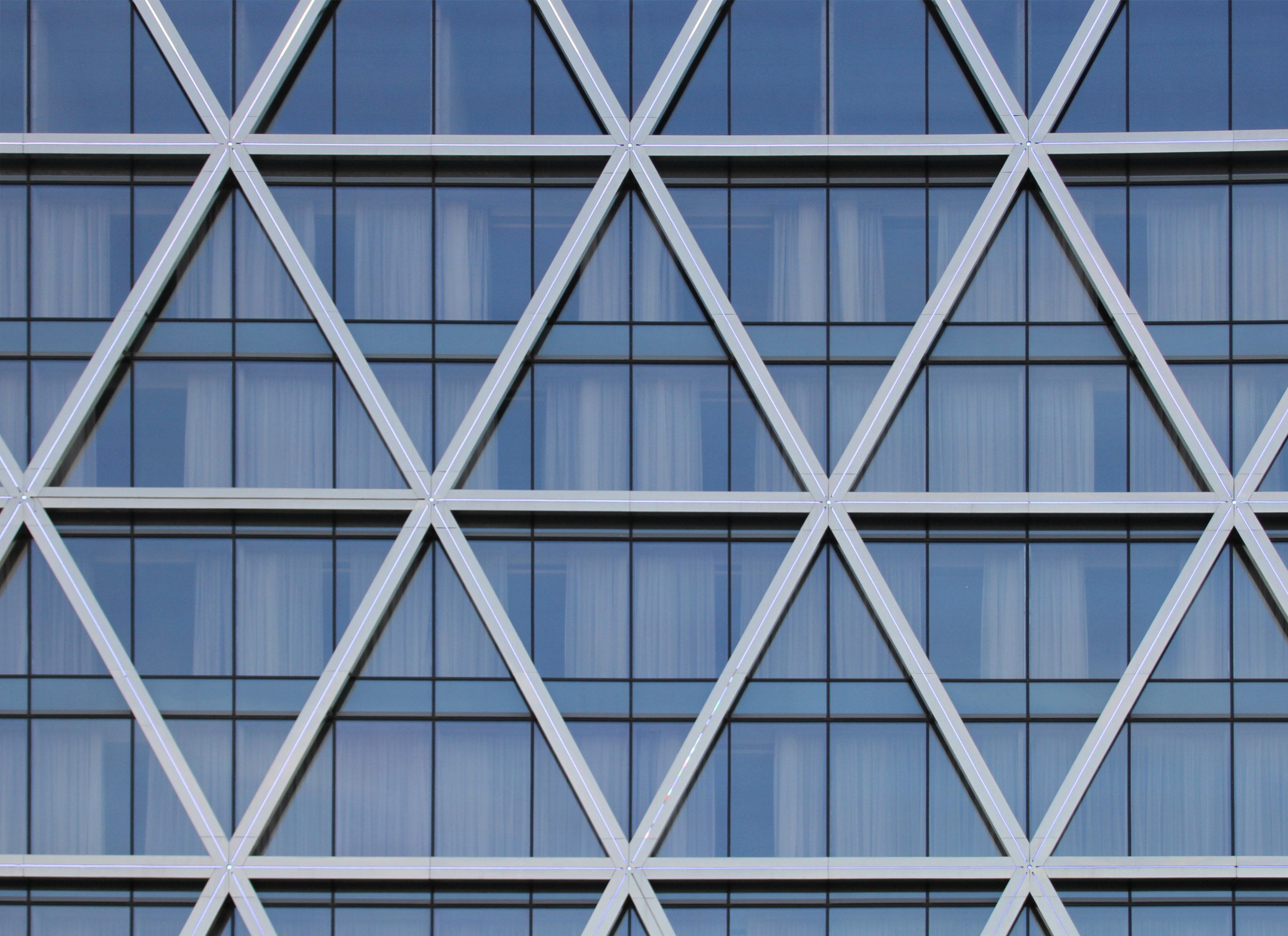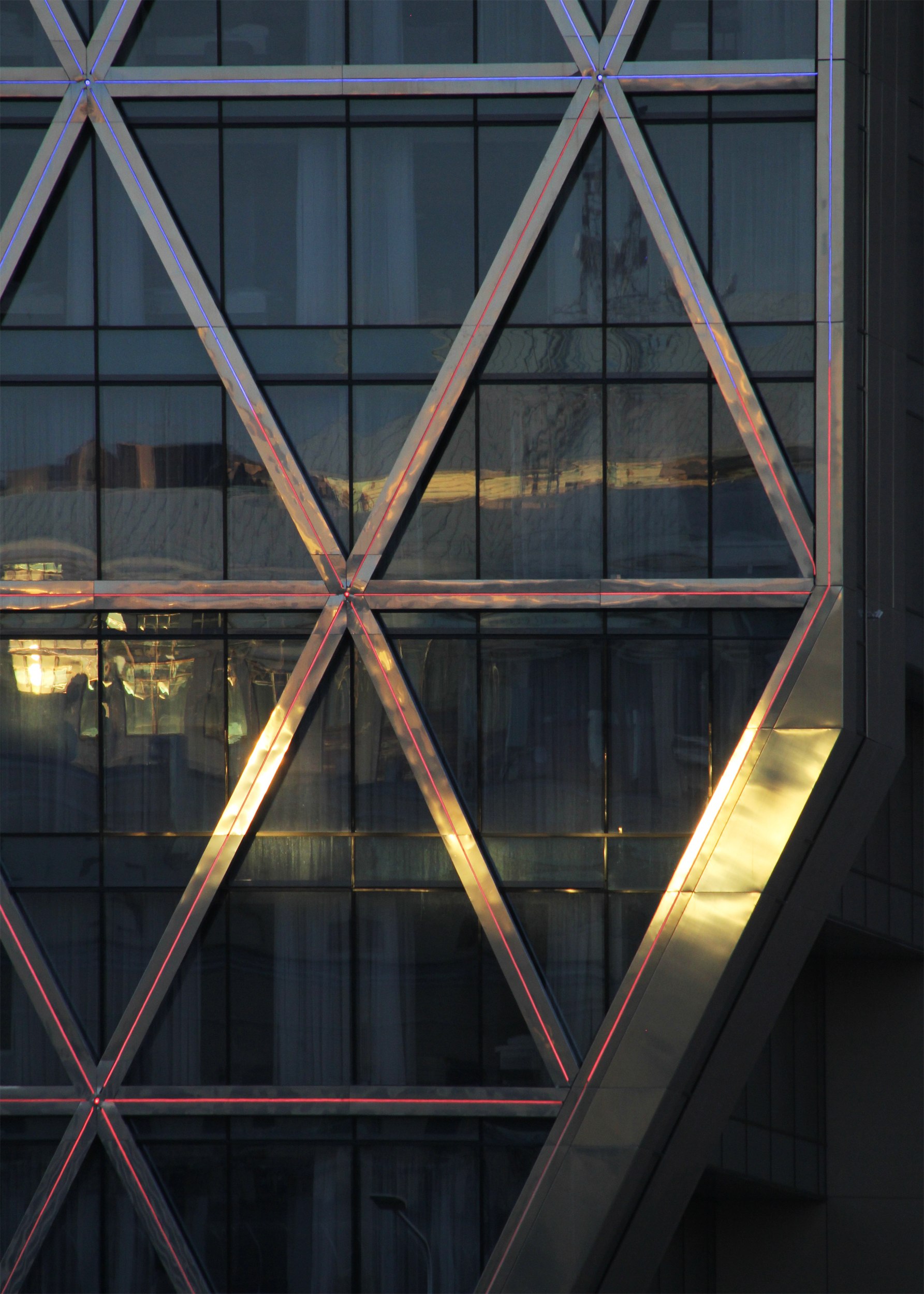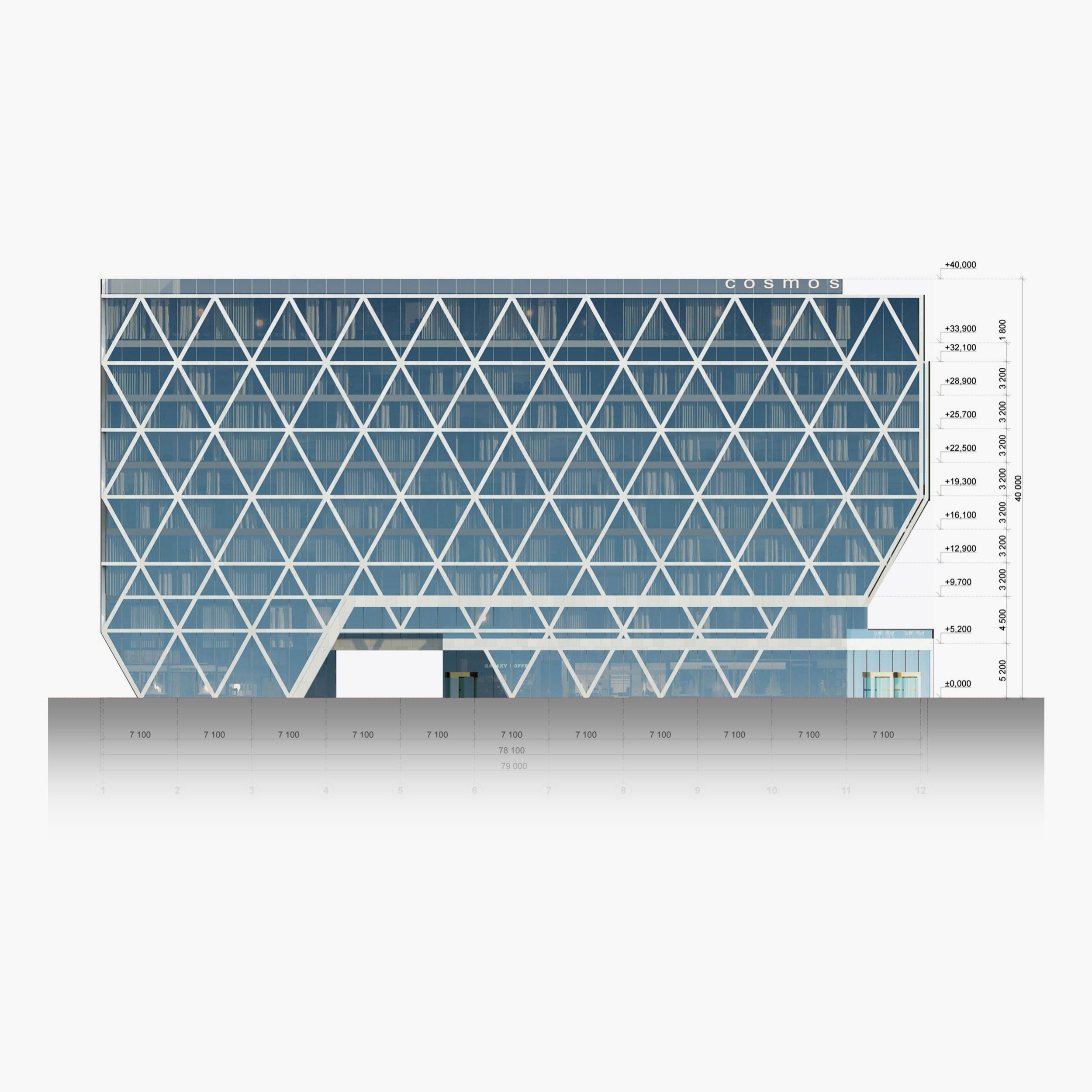 Немалую – даже очень большую – роль в сложившейся композиции играет сетка диагоналей. Она подчеркивает намеченную зооморфность, но позволяет избежать буквализма; задает зданию модуль и зрительно уменьшает его объем, так как каждый треугольник объединяет по два этажа, а каждый ромб по четыре. Глядя на новую гостиницу Cosmos, мы, строго говоря, видим, прежде всего, сетку – стеклянное заполнение отходит на второй план, а вместе с ним вопросы инертности простого стеклянного объема. Она работает как суперграфика с эффектом экзоскелета, визуально организует массу одним приемом, который в остальном лишь слегка оживлен авторским асимметричным отчеркиванием – полосами, соединяющими арку переулка с торцевой консолью.