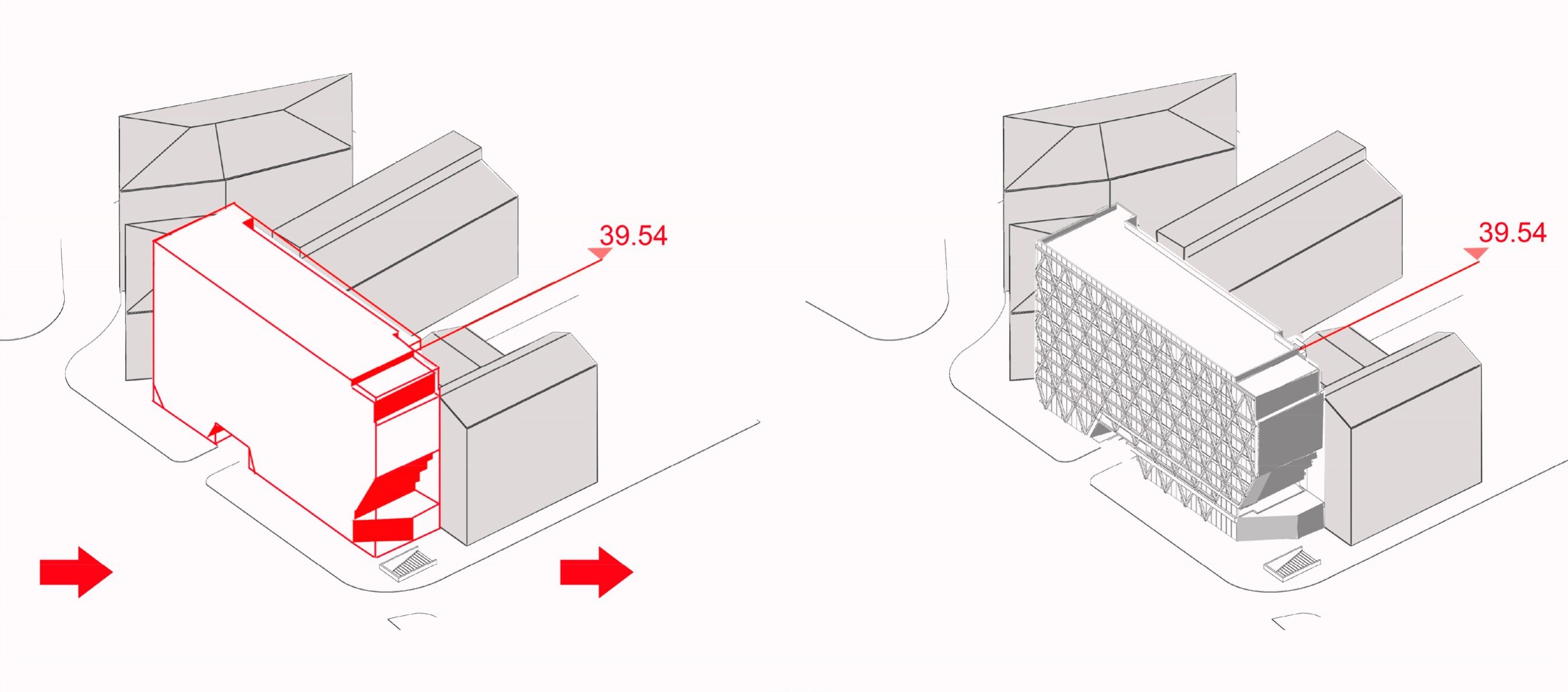 Сетка подает идею, заложенную в объеме, зрителю, и позволяет быстро «прочитать» ее – как «иконку»-логотип. Отсюда качество знаковости, запоминаемости с первого взгляда. Она также наделяет форму собранностью, заостроенностью, и даже некоей целеустремленностью, заметно отличая его от всех окружающих зданий.
