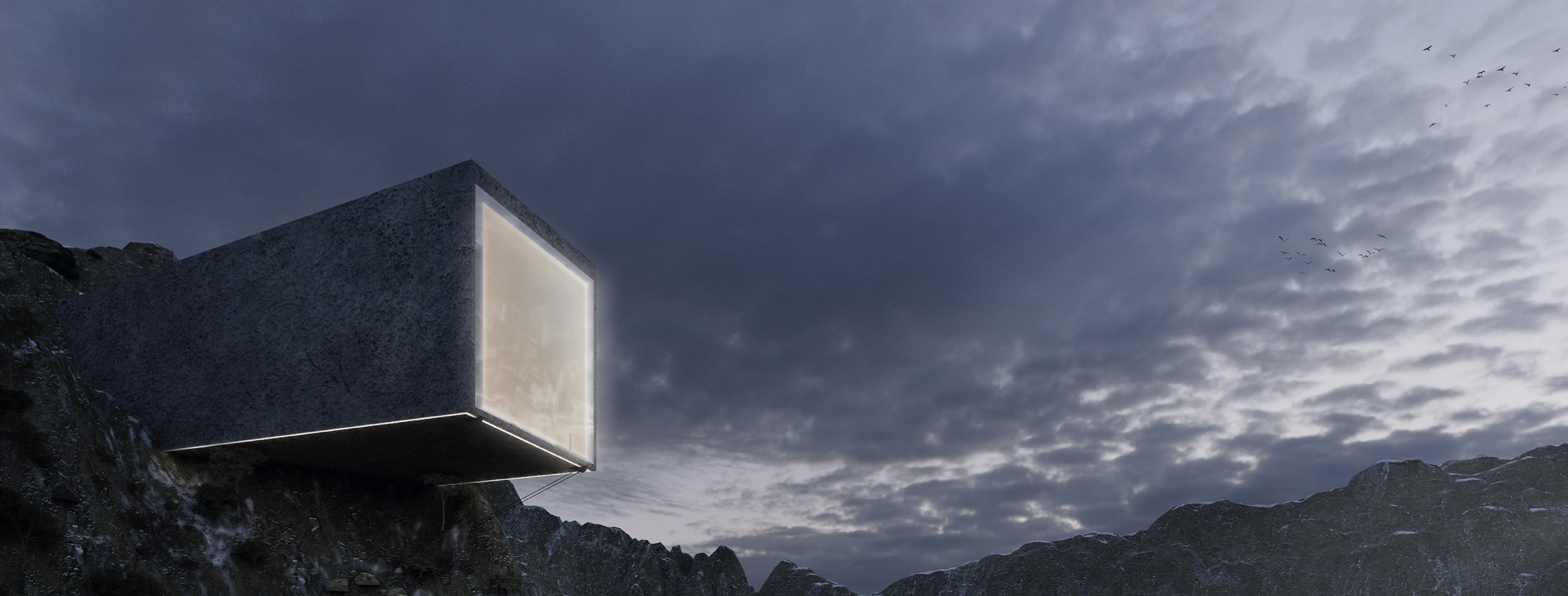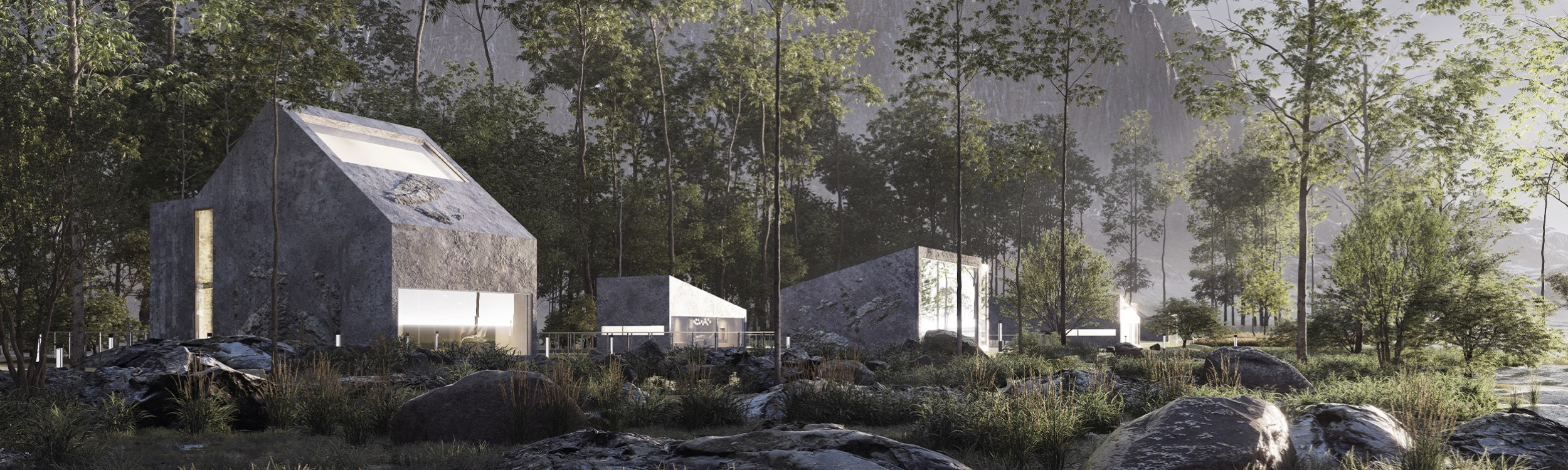 Третий объект – домики на берегу фьорда. Разработано пять типов, различающихся по форме и планировке, но объединенных общей концепцией. Здания разбросаны по берегу, объединены мостом и возведены из горного среза камня. Каждый дом ориентирован индивидуально – на фьорд, горы или звездное небо.