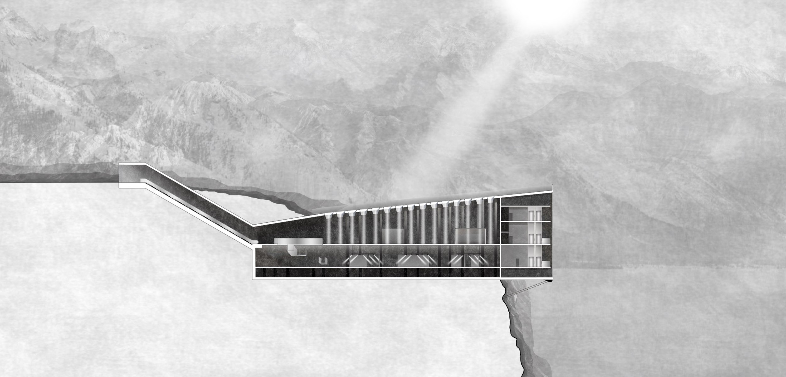 Пятый и завершающий объект – музей на вершине скалы. Здание музея расположено на высоте 1400 метров и органично вписано в склон горы благодаря своей вытянутой форме с так называемым «хвостом», в котором находится эскалаторы для подъема, что позволяет посетителям подняться на вершину и продолжить пеший маршрут по горам.