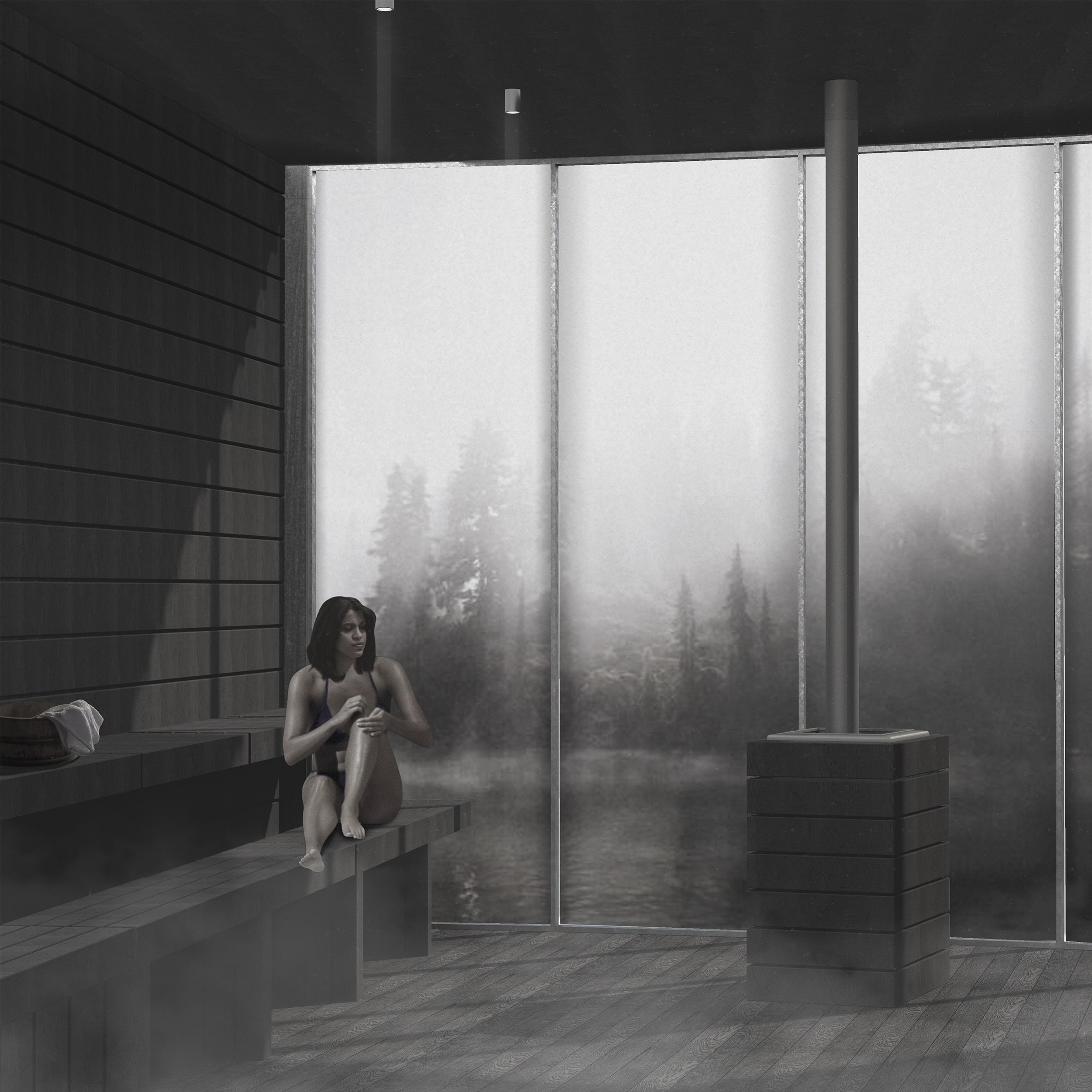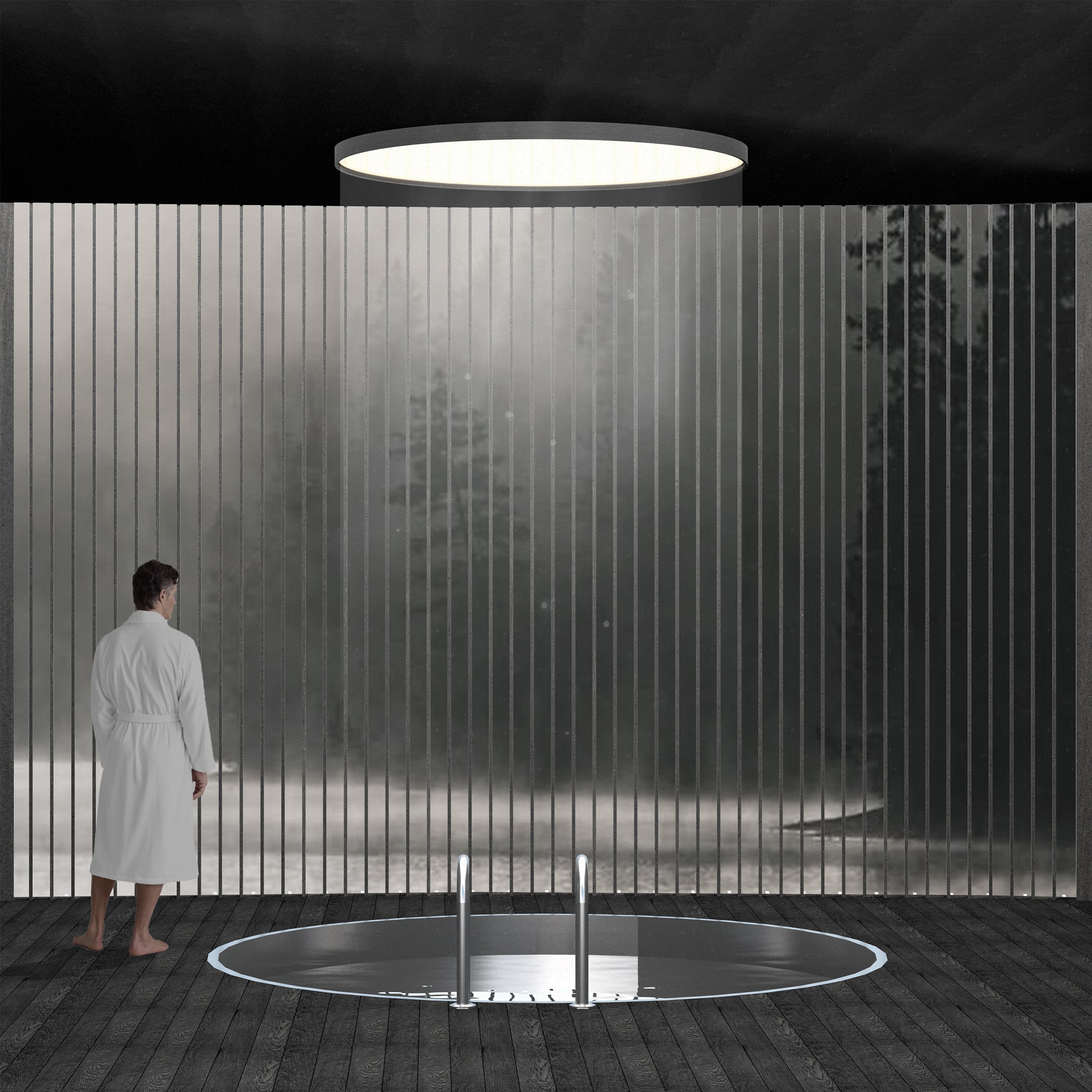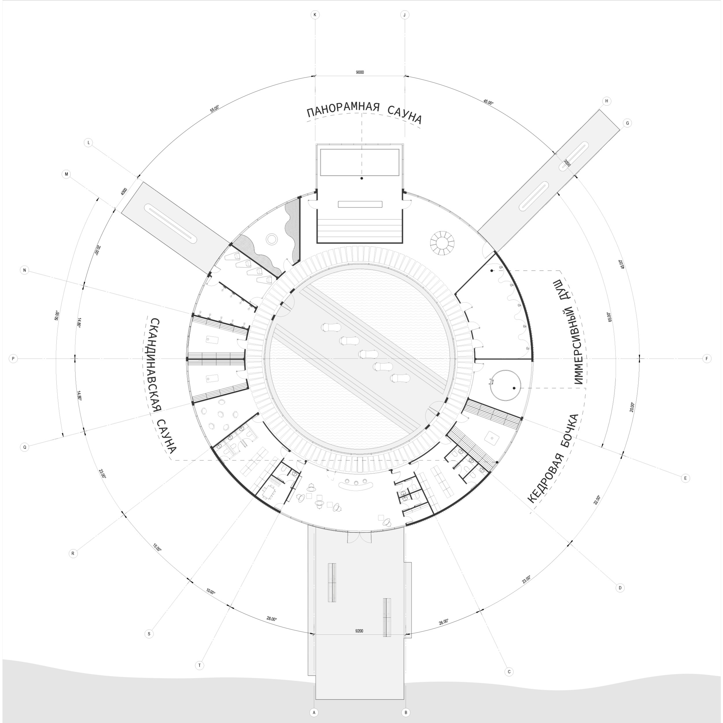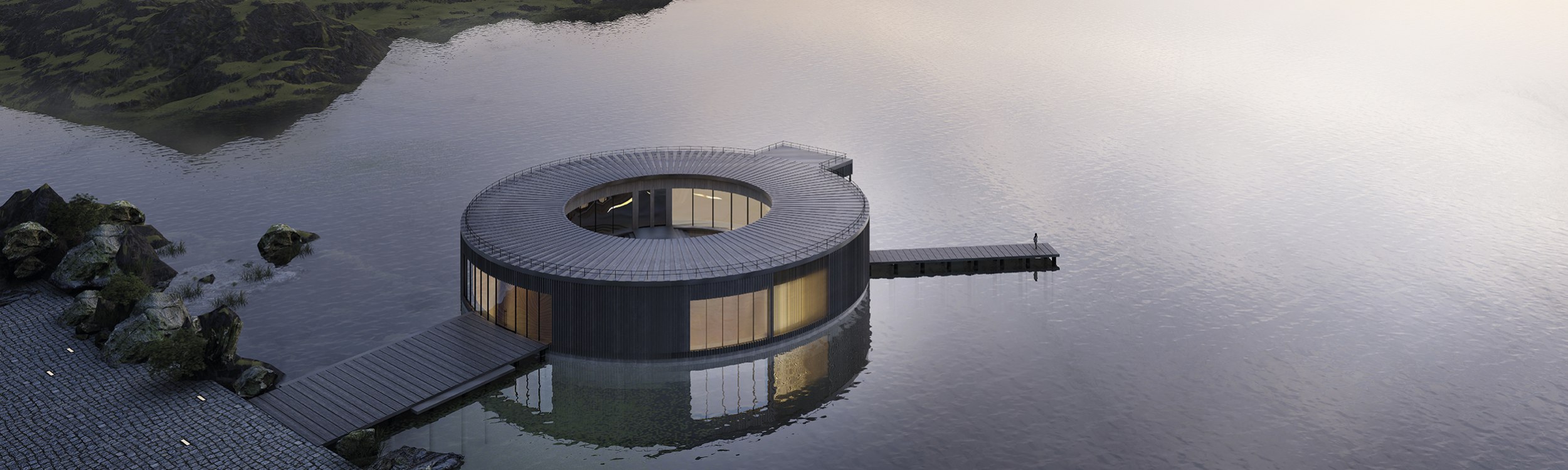 Второй объект – спа на фьорде. Баня в Норвегии – это не просто архитектура, а часть философии, в которой важна природа, баланс и внутреннее спокойствие. Круглая форма здания отражает глубокую символическую и культурную связь с традициями Норвегии. Помимо базовых и нормативных помещений, в здание СПА-комплекса входят: панорамная сауна с бассейном, иммерсивный душ, помещение с кедровой бочкой, скандинавская сауна, а так же главная особенность – два пирса и внутренний бассейн для купания во фьорде.
