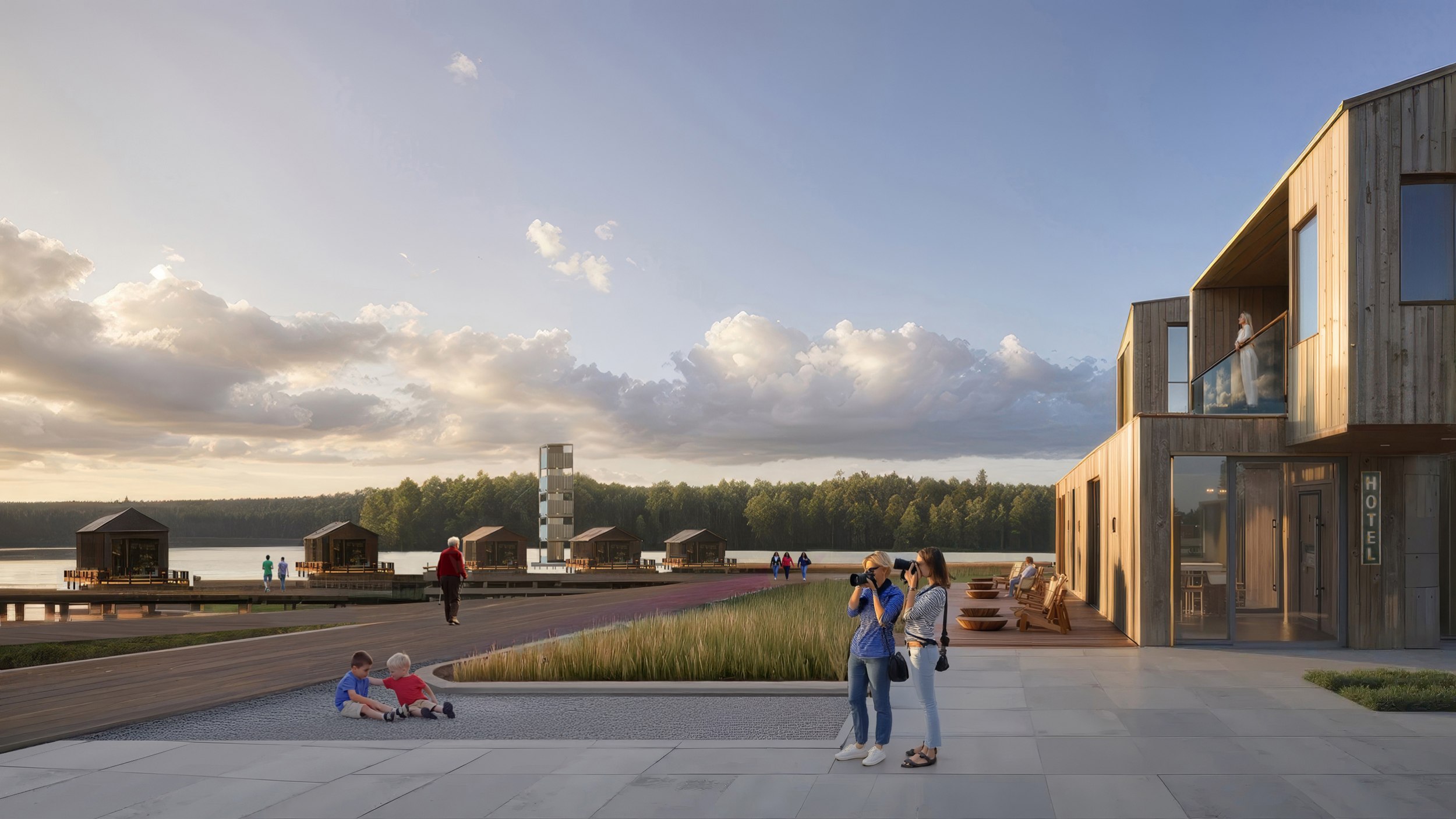 На территории проложены экологические тропы и пешеходные маршруты, где гости могут наслаждаться прогулками, исследуя уникальные северные ландшафты и наблюдая за закатными панорамами города. Зоны банного отдыха способствуют полному погружению в атмосферу уединения и восстановления: природные материалы и гармоничный дизайн дополняют расслабляющую среду у воды. В рамках проекта создается инфраструктура для водного туризма которая усилит связь двух берегов, обеспечит доступ к реке и создаст возможности для водных прогулок и досуга на воде.