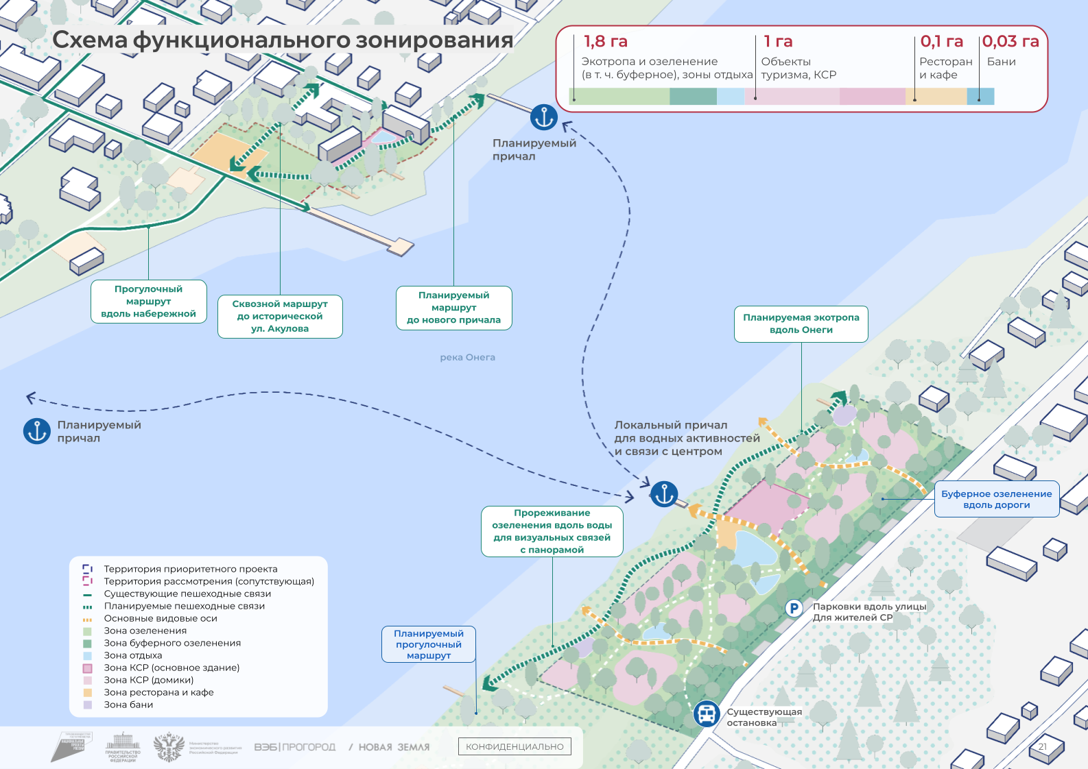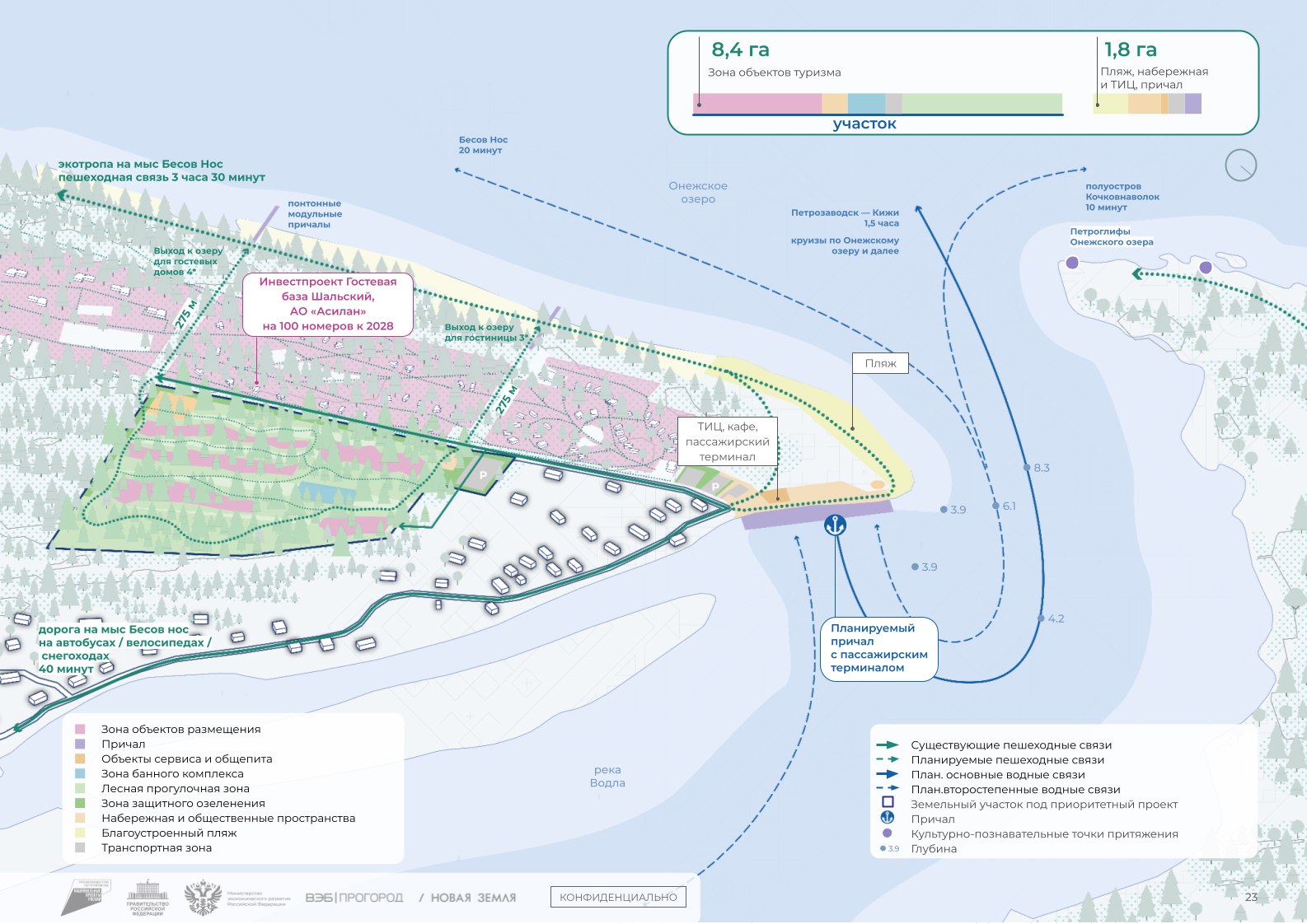 Приоритетный проект охватывает участок на берегу Онежского озера в районе поселка Шальский, включая зону строительства причала длиной 160 м для круизных судов и СПК, пассажирского терминала (700 м²), гостевых баз (вместимостью до 180 человек), ресторана, банного комплекса и спортивной зоны. Территория функционально разделена на зоны размещения, сервиса, лесных прогулок и озеленения с пешеходными и транспортными связями к мысу Бесов Нос. Банные комплексы и причалы, являющиеся важной частью быта, традиционно располагаются ближе к берегу, что позволяет максимально использовать природные ресурсы водоемов.