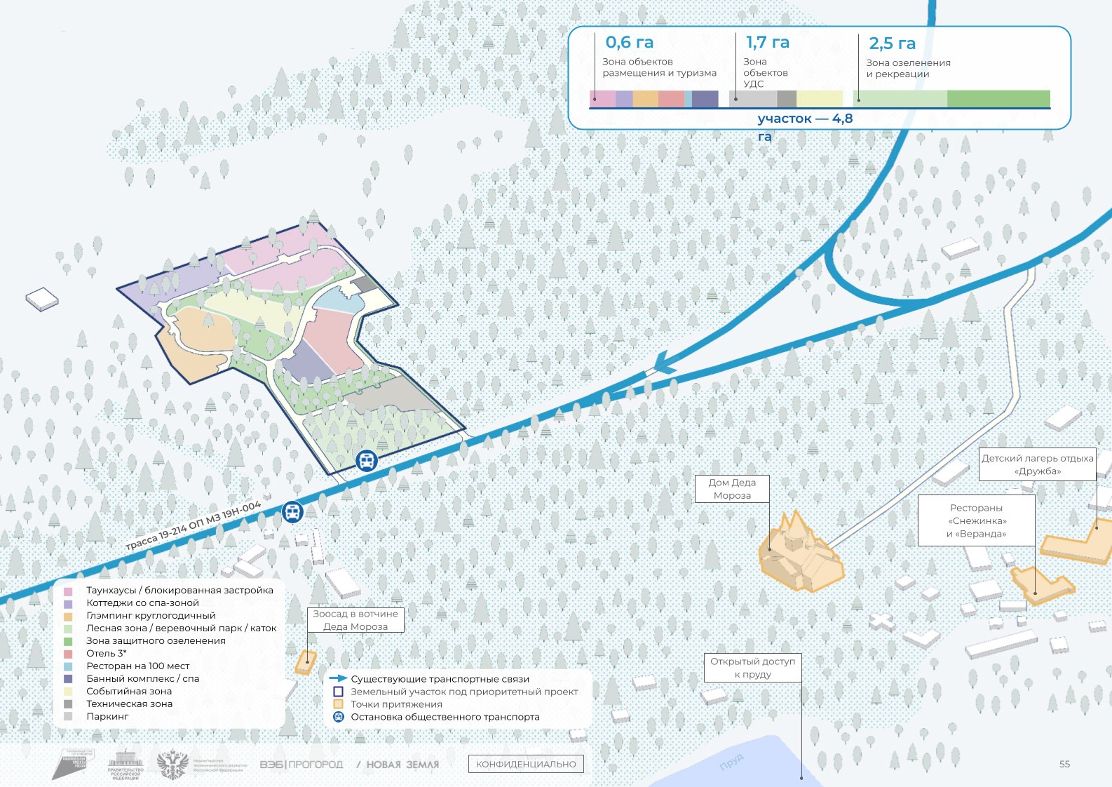 Вблизи участка проектирования находится крупный туристический кластер «Вотчина Деда Мороза», включающий гостиницы «Сказка» и «Усадьба Деда Мороза». Этот кластер предлагает уникальные условия для семейного отдыха и доступ к водоемам, включая небольшие пруды. Территория отличается разнообразием типов мест размещения, но низкой концентрацией объектов общественного питания и сопутствующей туристической инфраструктуры.