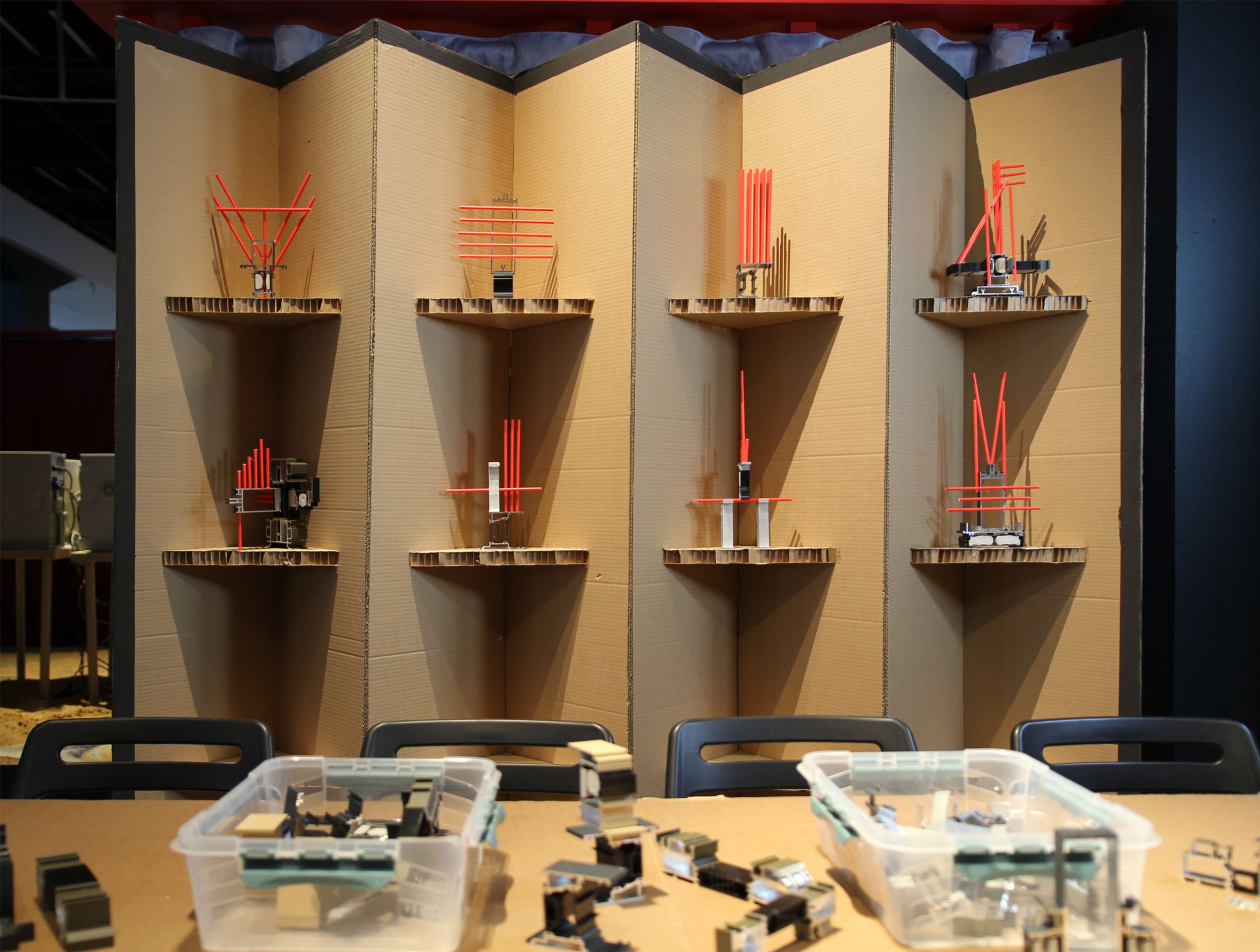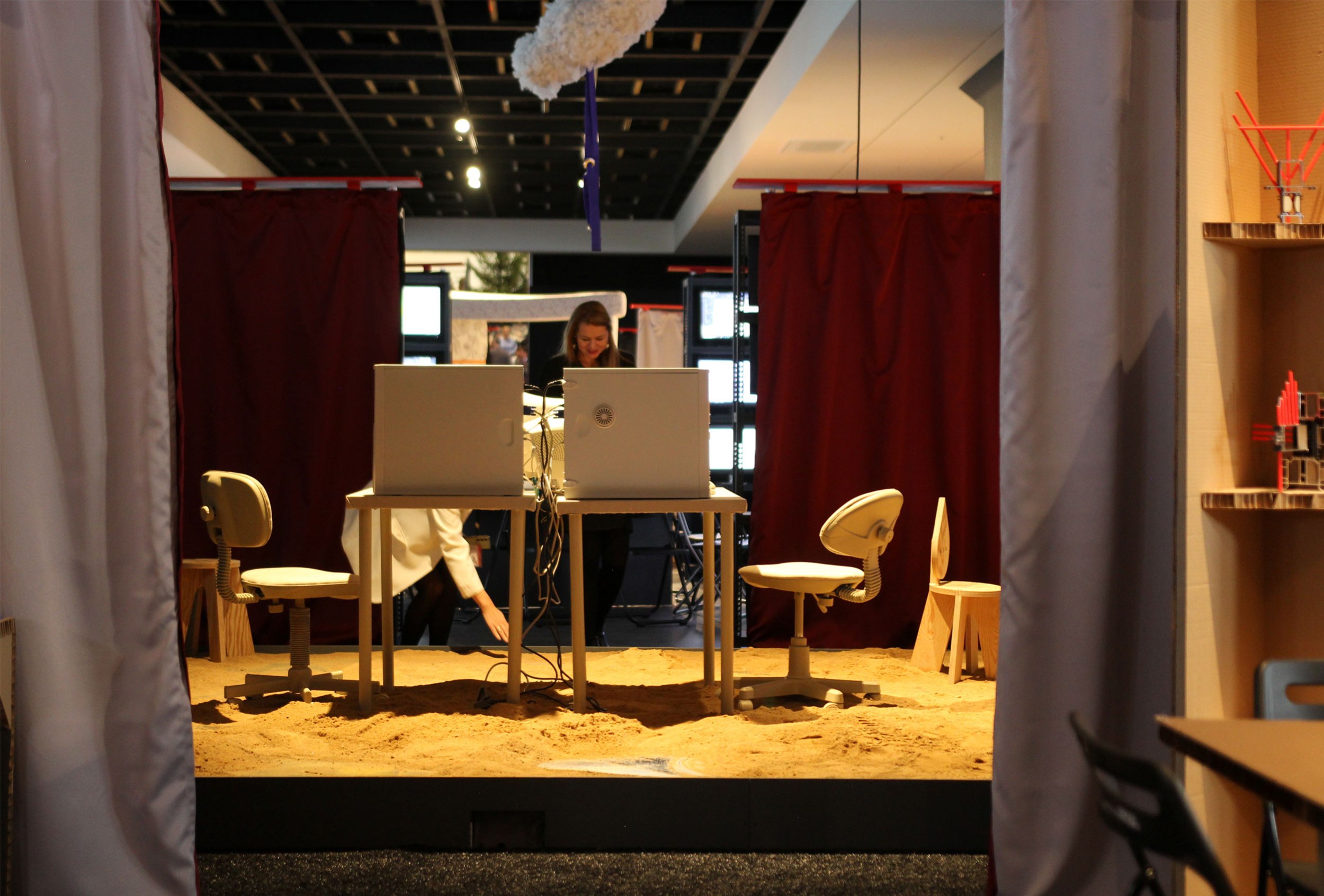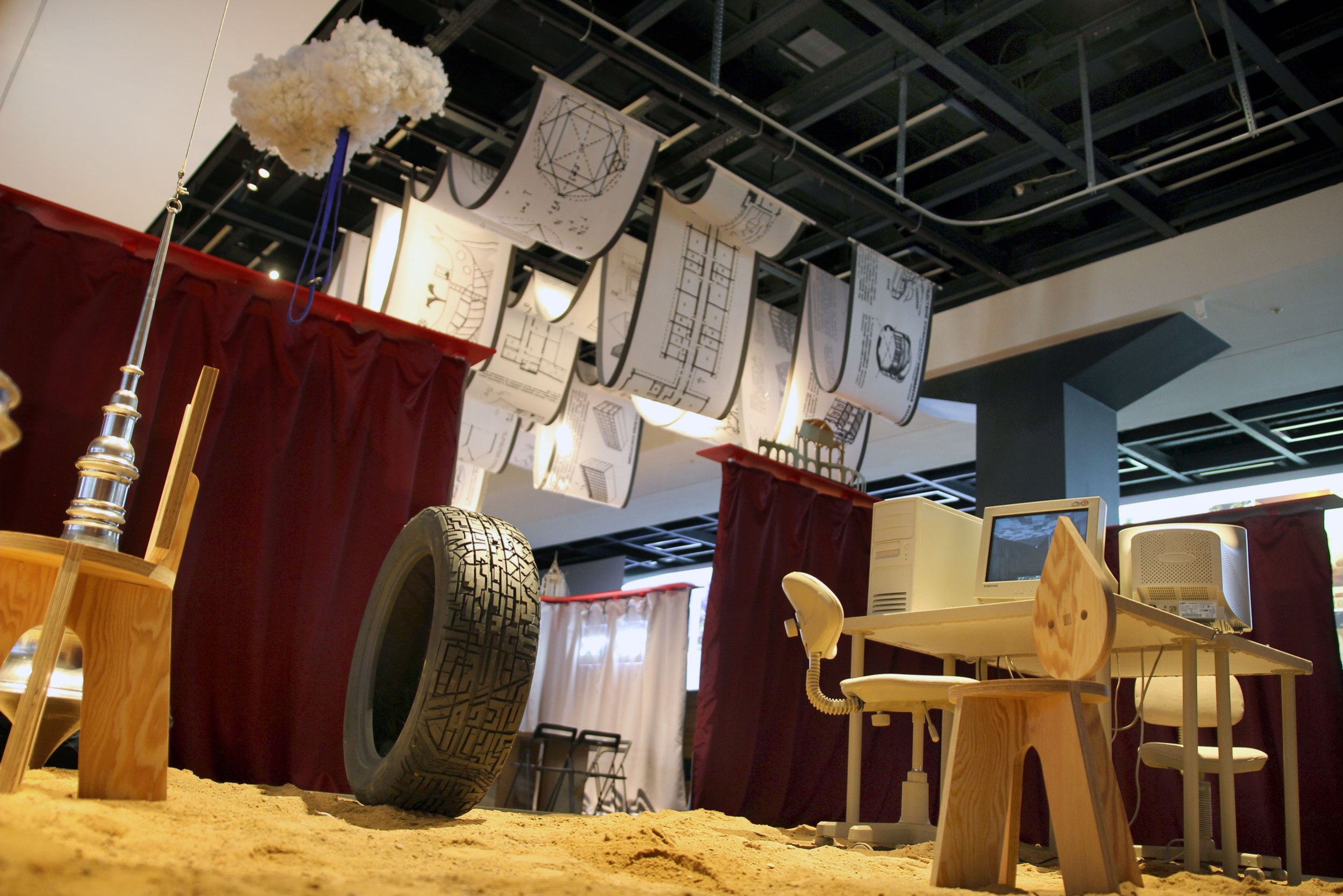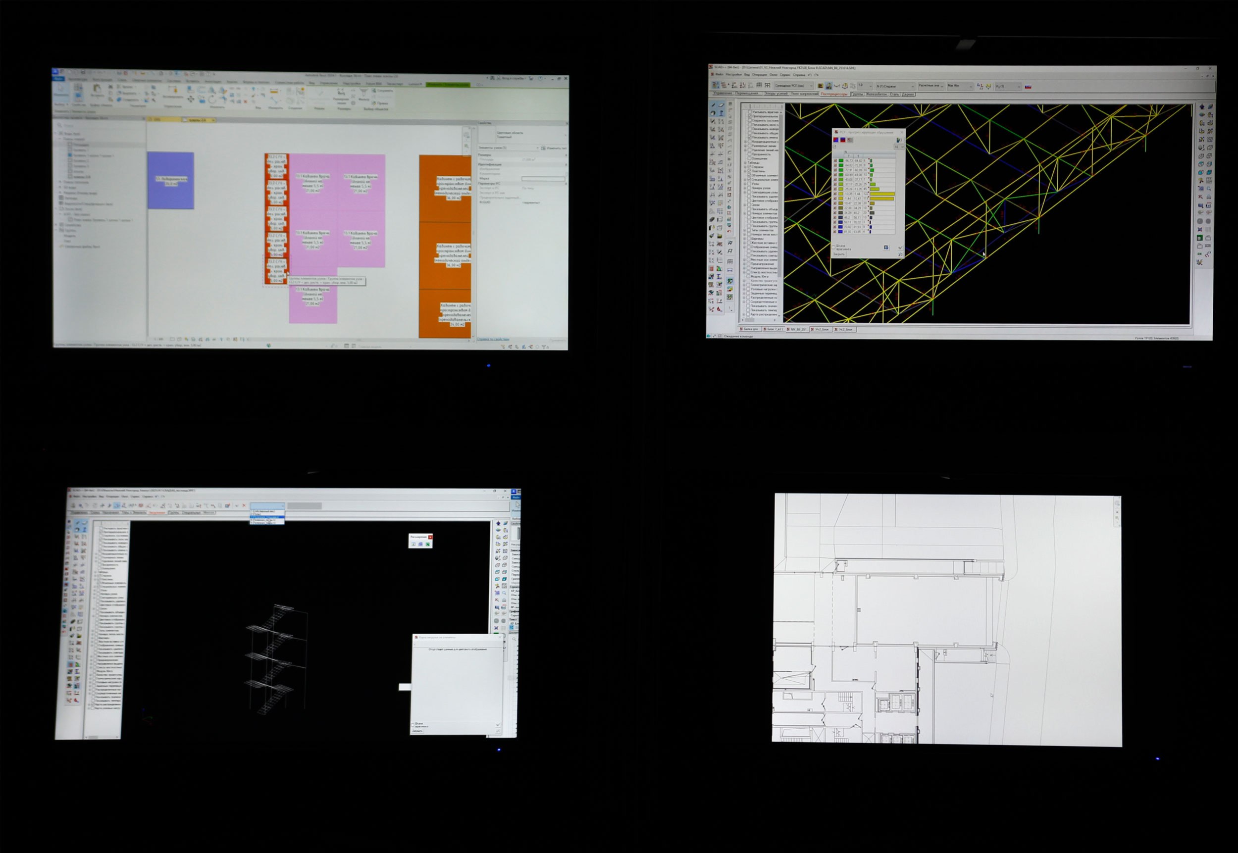 К проектированию игровых пространств помимо детских студий привлекли бюро-победителей прошлого Архитектона. К примеру, Челы, чей уличный объект был тогда признан лучшим, обустроили пространство из автомобиля BMW-7; обещают сидеть внутри, консультировать посетителей и встраивать обсуждения на абстрактные темы. АБ Маяк дает возможность разбивать кирпичи, Ризома построила fort blanket из матрасов, Студия 44 выгородила комнатку из мониторов – сколько рядов мониторов, столько этажей в бюро, все показывают работу над конкретными проектами, на экранах BIM-модели и прочее.