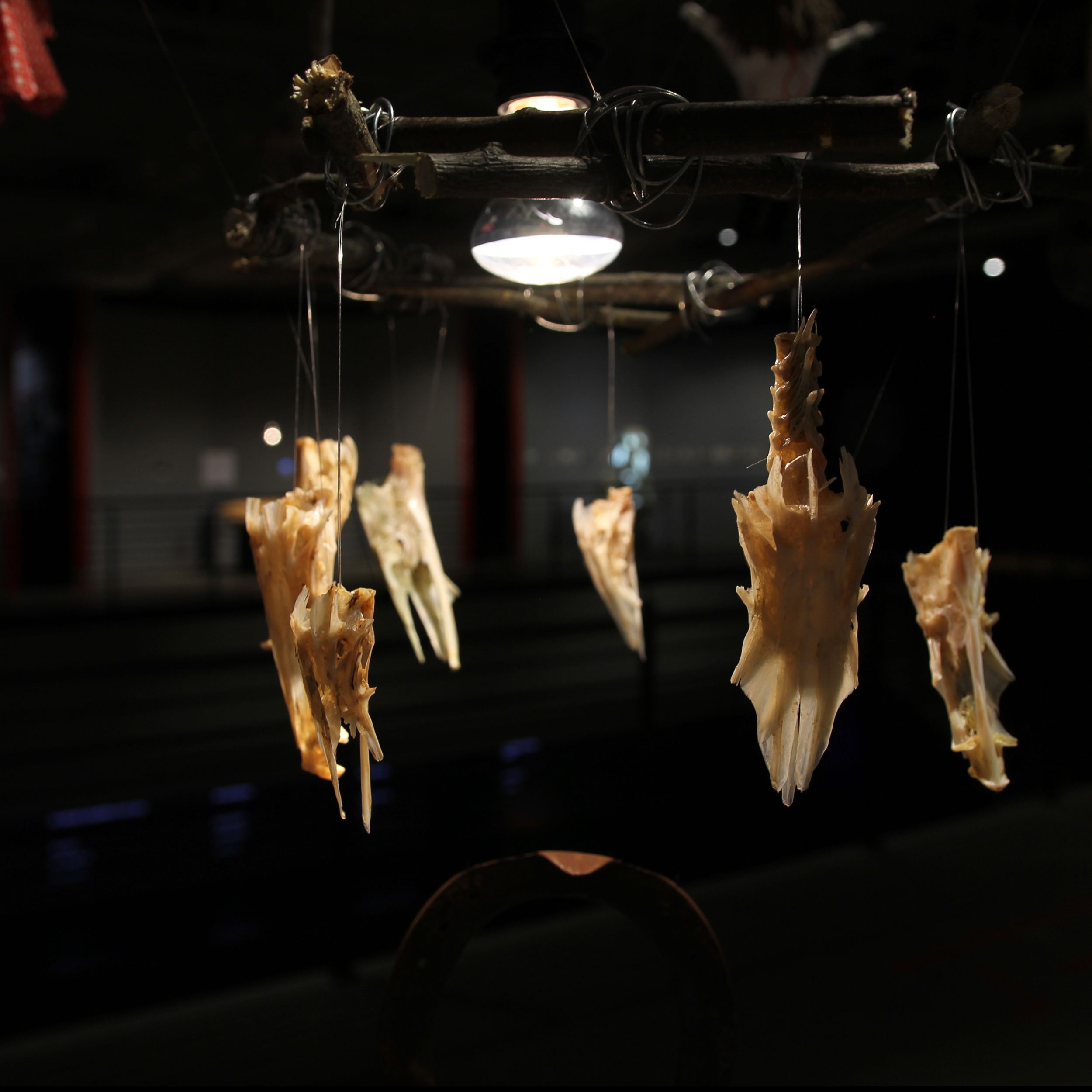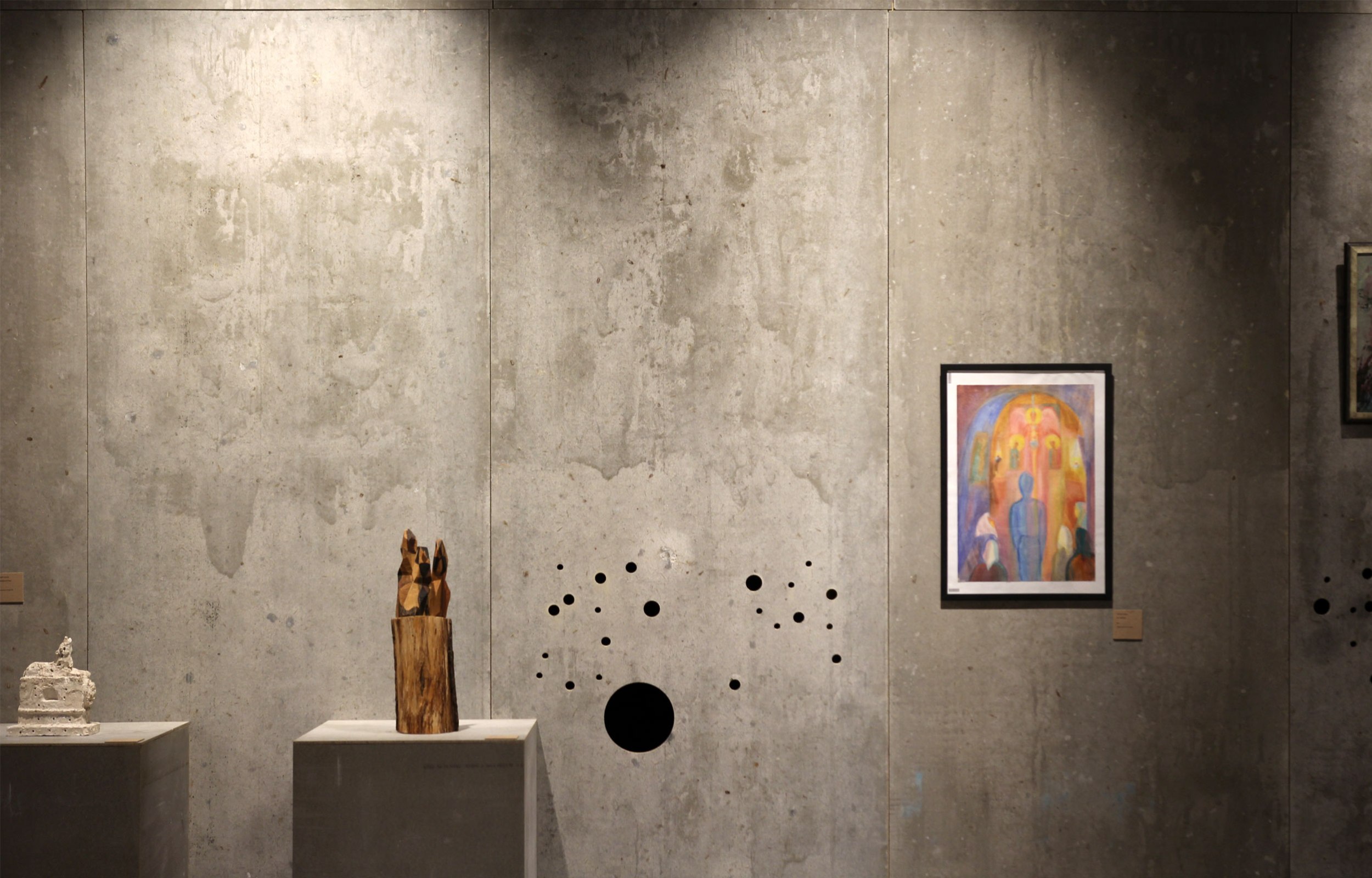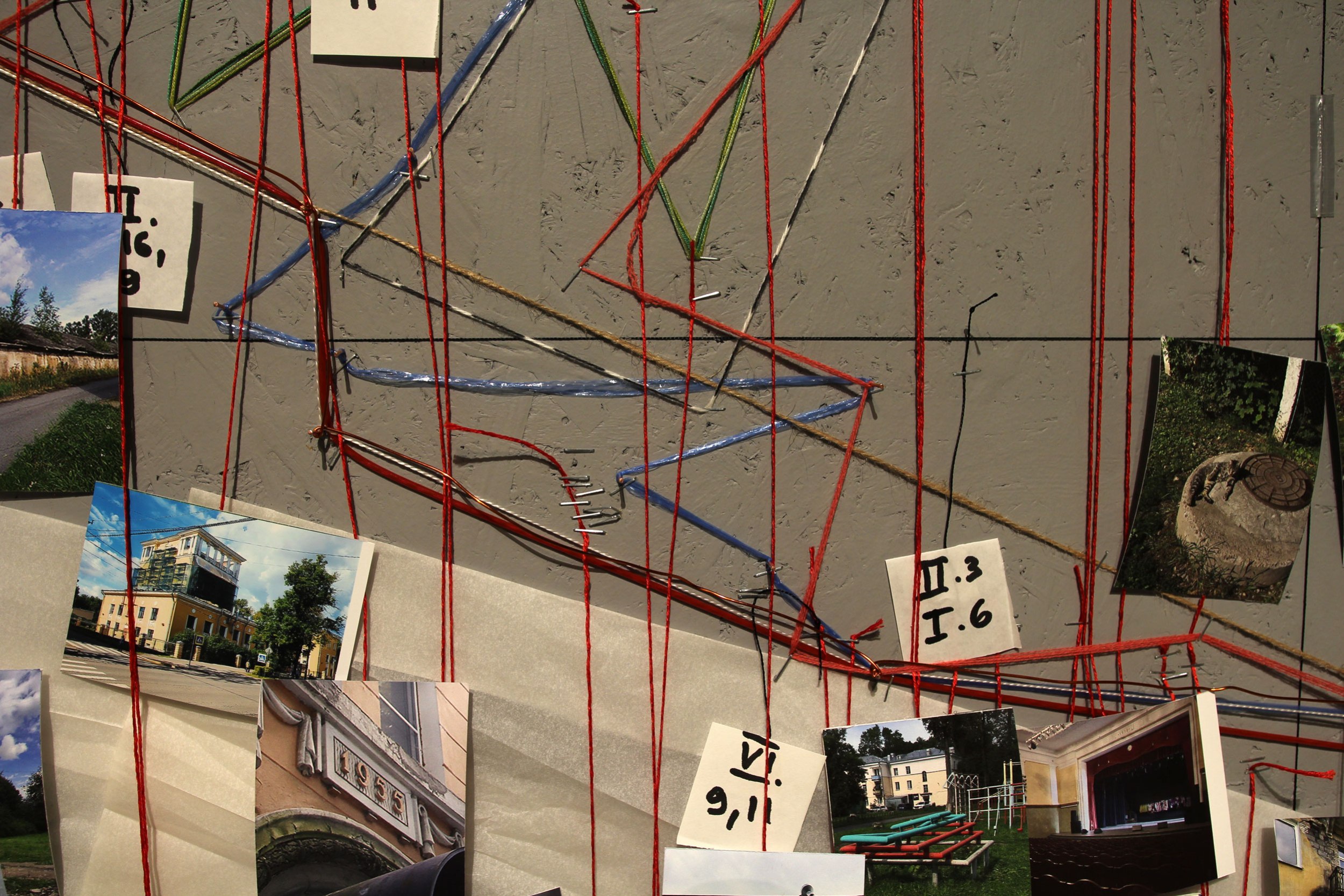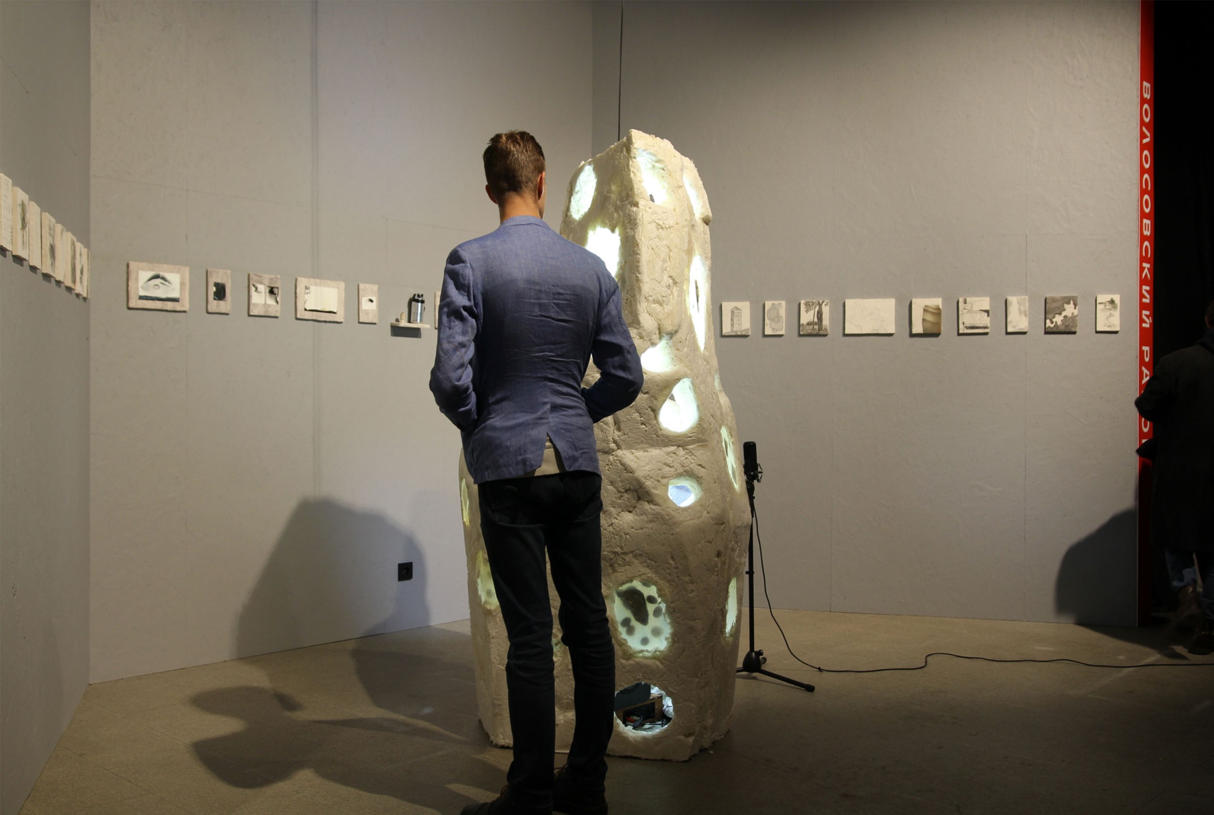 С точки зрения сближения и взаимодействия хорошо работает и второй этаж. Там кураторы разместили все выставки. Первая, в галерее двусветного пространства, представляет работы студенческих воркшопов, посвященных изучению различных местностей Леонобласти. Учащихся разных вузов распределили по жребию в группы с 6 кураторами, каждая изучала свой район. Итог – живописные по духу артистичные представительства каждой группы. Тут можно «залипнуть» надолго, особенно если читать зины, рассматривать экспонаты гипотетического музея Волхова у группы Ильи Мукосея, изучать культуру вепсов у группы Яны Голубевой или слушать «музыку ничто» на стенде Сергея Мишина.