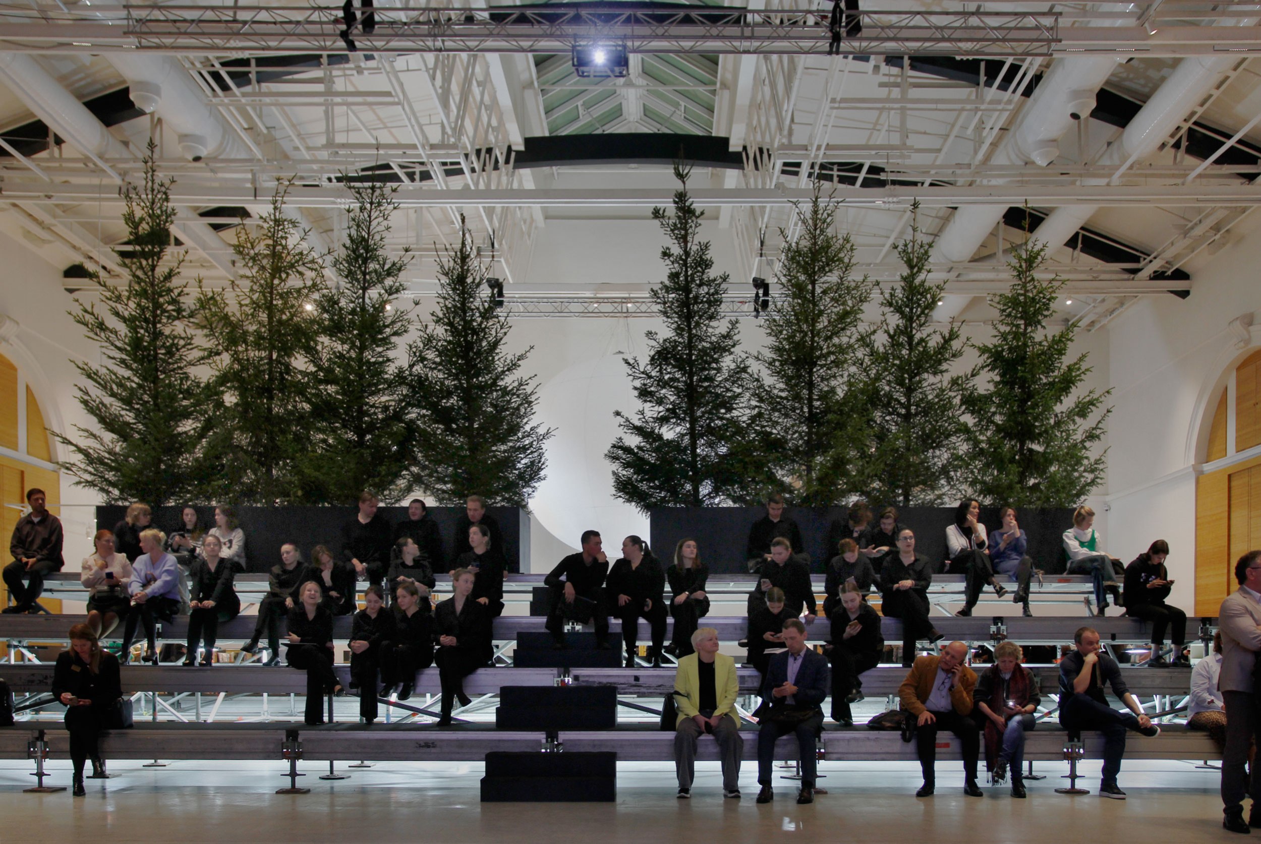 Так, у входа посетителя вновь встречают деревья – на этот раз елки вместо лип, которые вместе с логотипом и постаментом для дискуссий в виде зиккурата создают подобие площади у мавзолея – так это место шутя определяют сами авторы.
