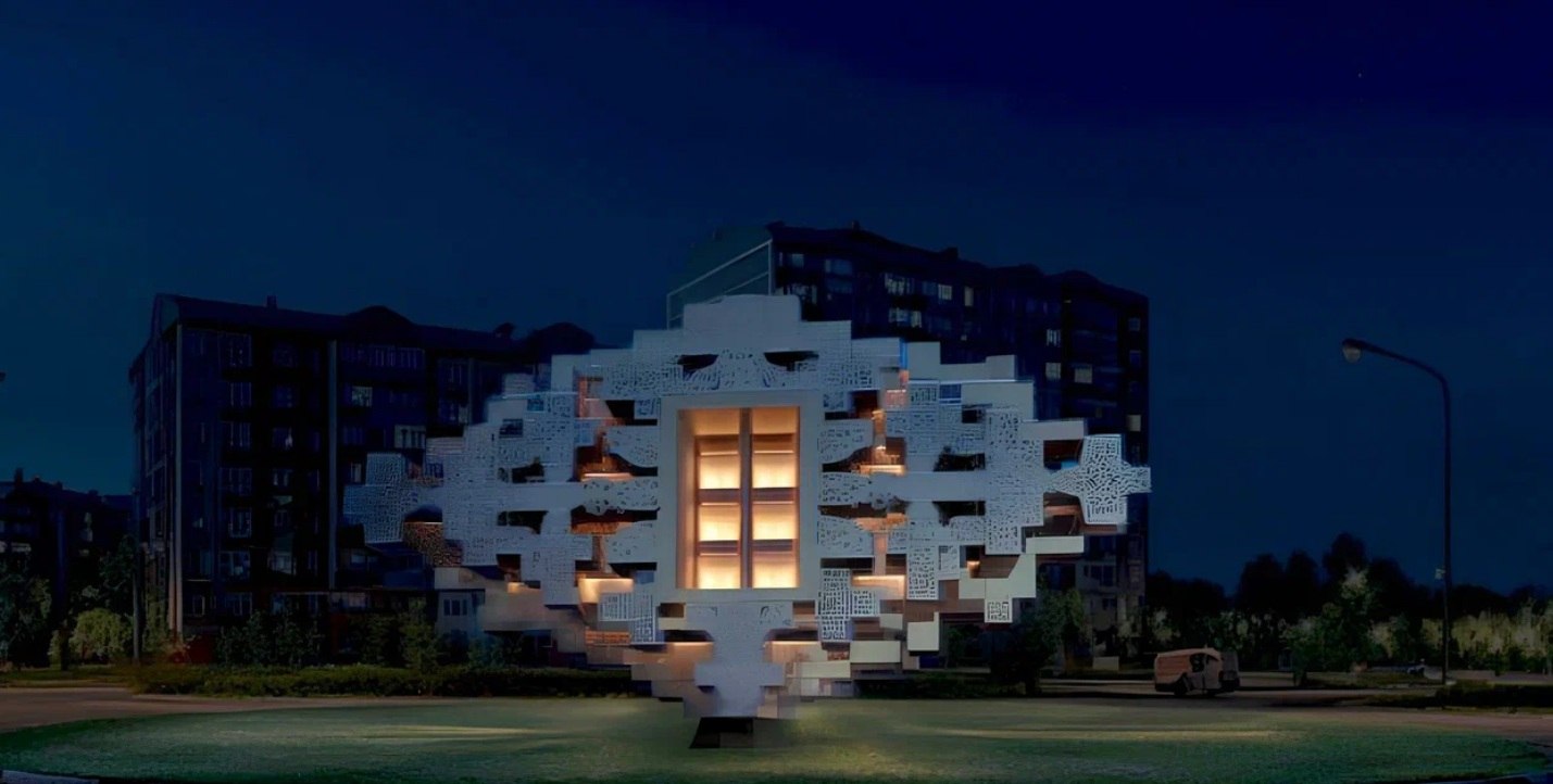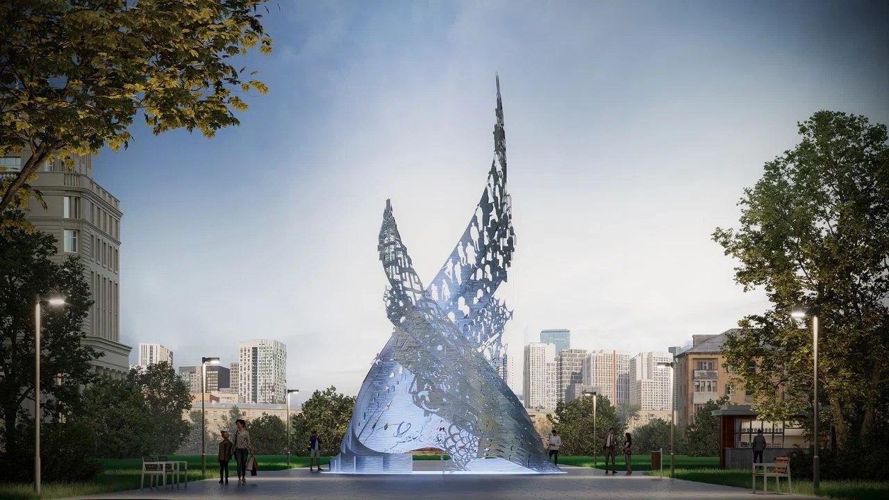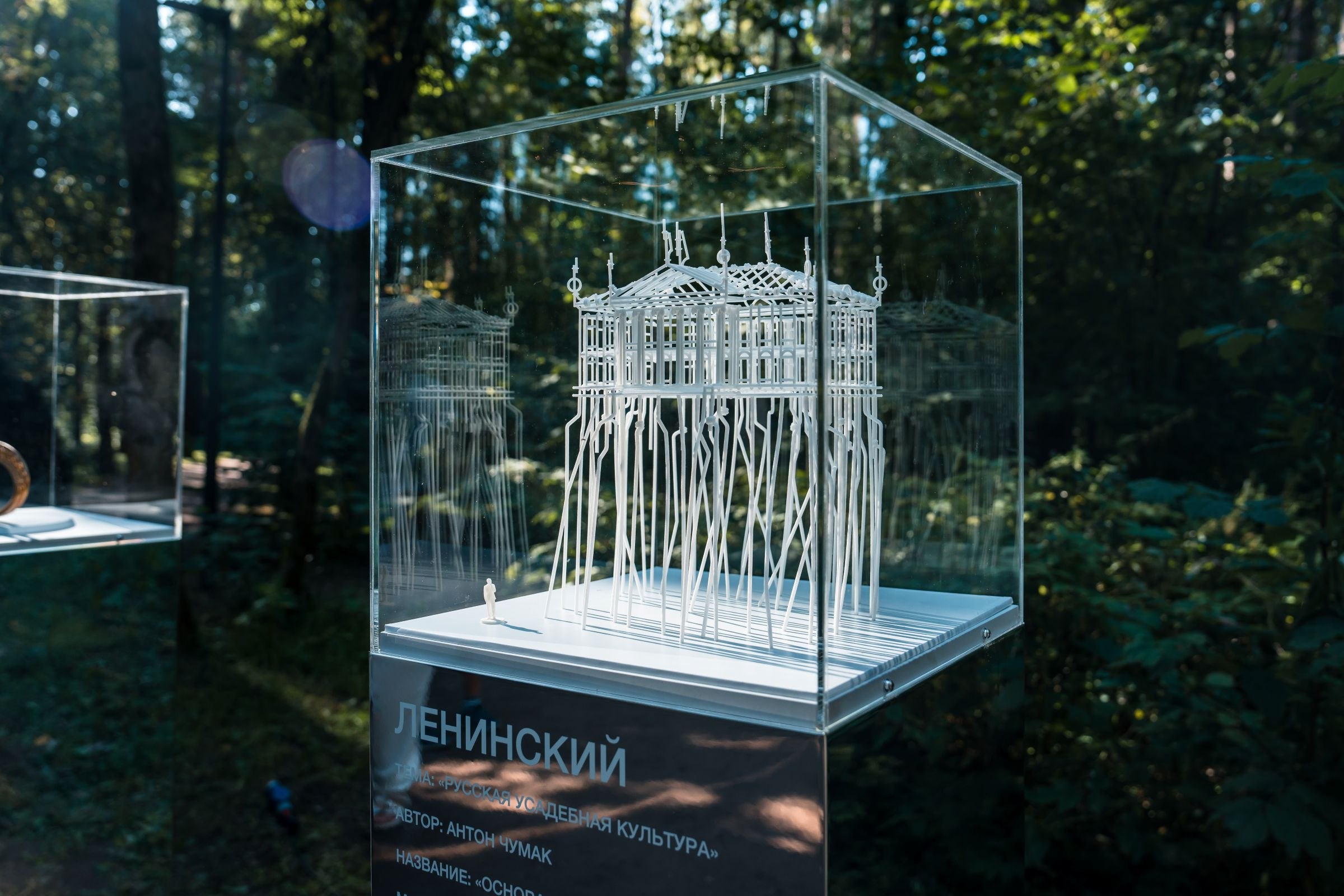 Антон ЧумакПроизведение «Русская усадебная культура», авторское название – «Основа», для Ленинского муниципального округа – это ажурный металлический каркас в форме классической усадьбы, который опирается на условные «корни». Футуристические антенны на крыше напоминают о технологическом развитии региона. Нижняя часть может быть вплетена в живой ландшафт с кустами и цветами.