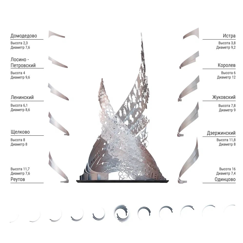 По сути, это большая скульптура-конструктор. Она состоит из десяти металлических лент-спиралей, каждая из которых имеет собственную уникальную форму и рисунок, связанный с историей какого-либо подмосковного города. Все спирали складываются в металлический вихрь, и он, напоминая основание торнадо, – символизирует энергию, прогресс и сотрудничество подмосковных городов. Получилось очень жизнеутверждающе.