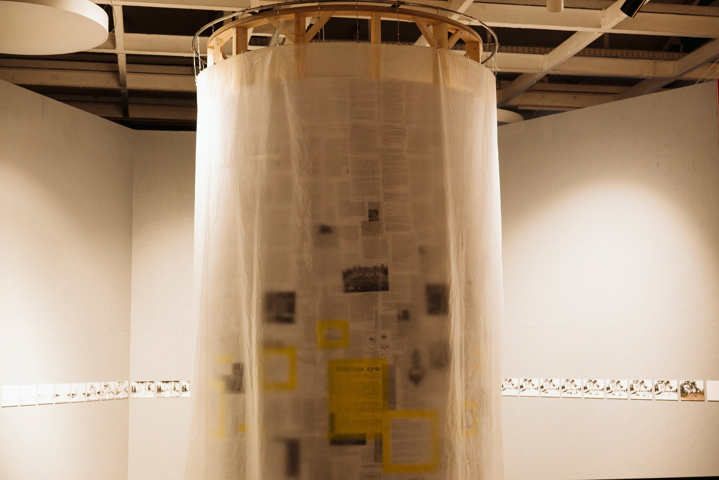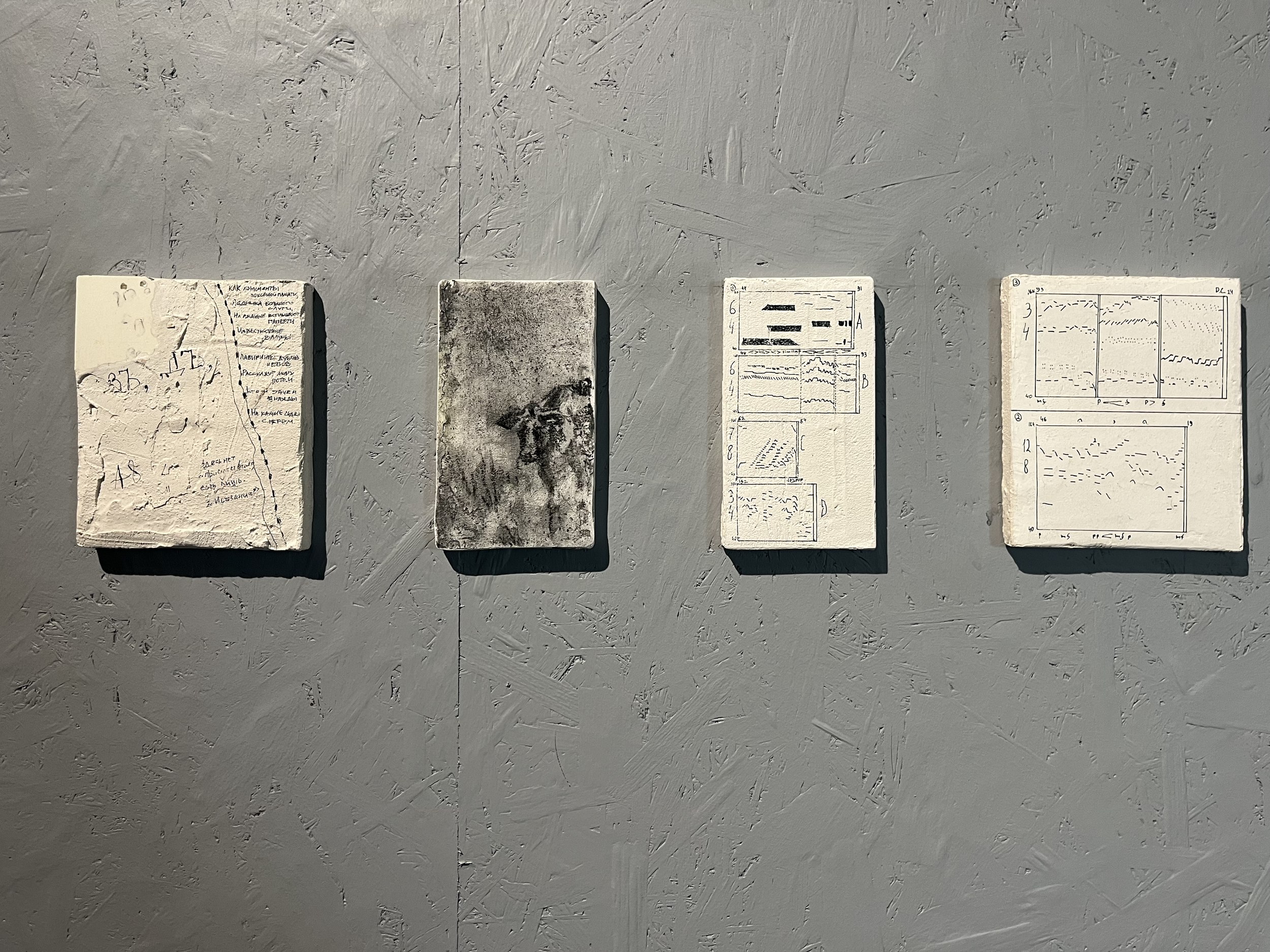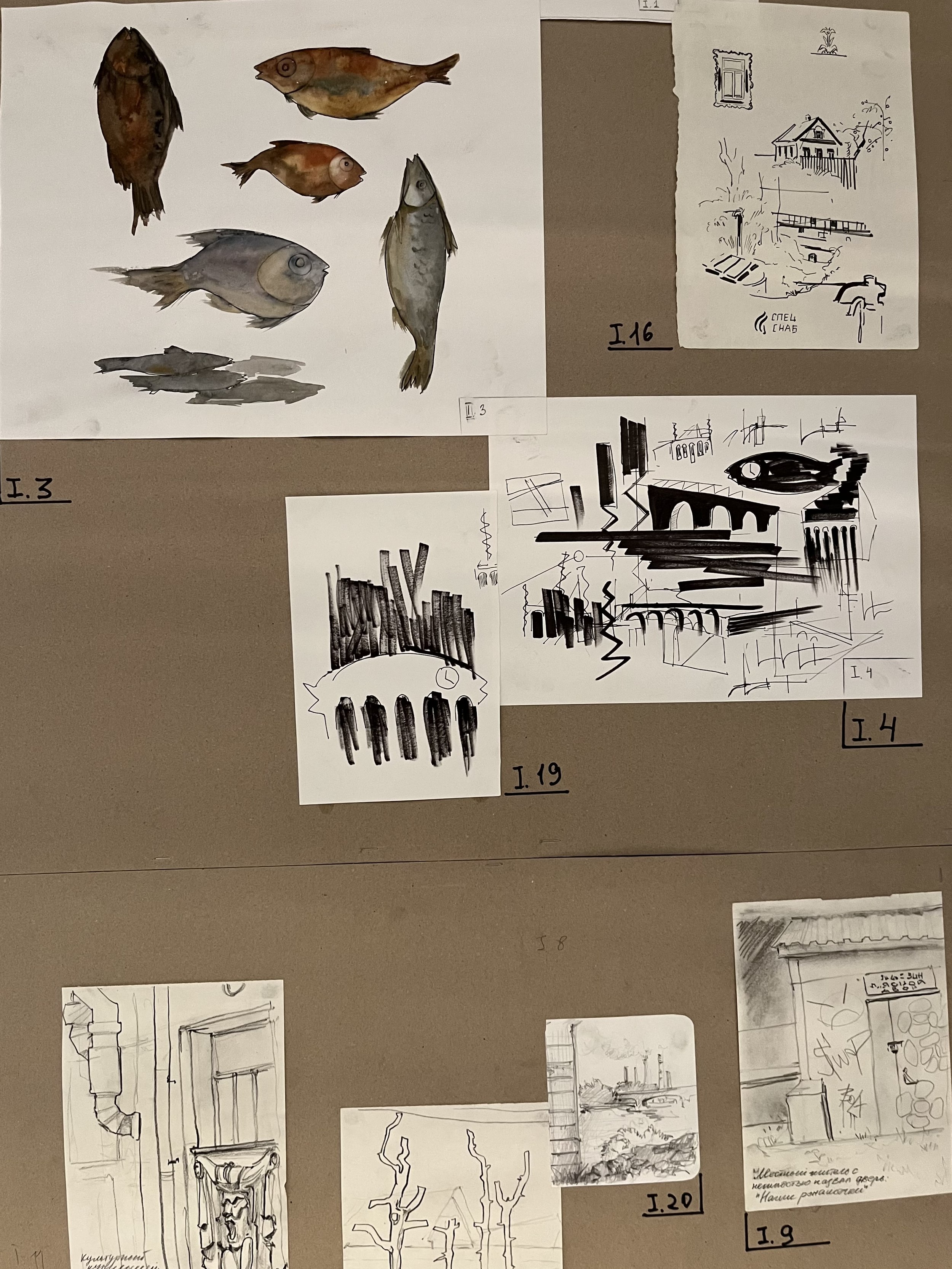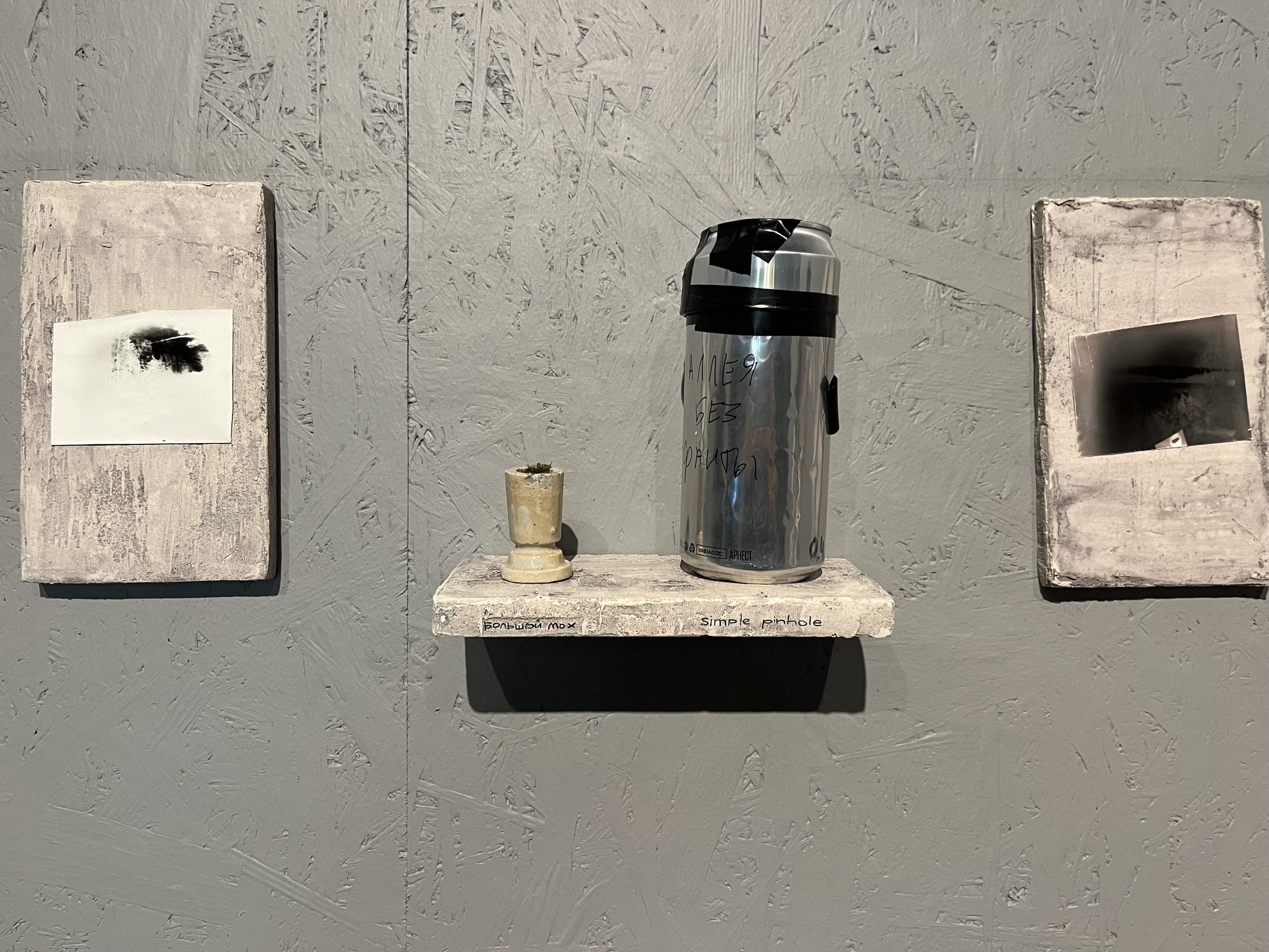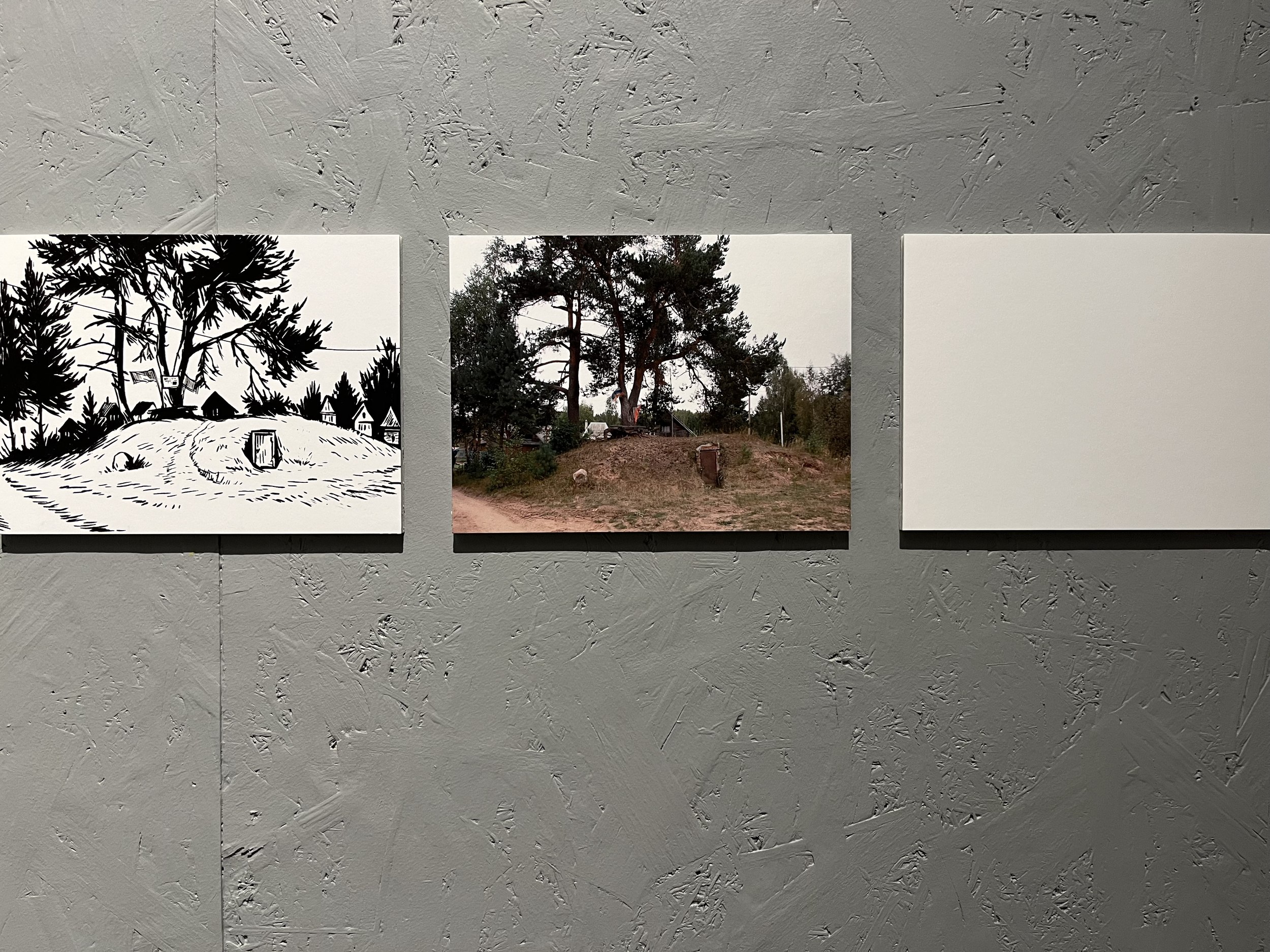 Догадаться, что группу курировал Сергей Мишин, можно было по графике в экседре экспозиции и презентации, в которой студенты использовали метод вербального проектирования. В эту же компанию попал будущий композитор из консерватории, а в процессе выяснилось, что в болотах, по которым бродила экспедиция, работал над оперой «Садко» Николай Римский-Корсаков, а нынешние зоотехники говорят языком Бунина и Набокова. Болото определили точкой начала и протоматерией, делали тесты на мутно-прозрачность и пористость, исследовали хтонь и пытались придать форму неоформленности. Так появился центральный объект экспозиции, внутри которого зловеще застыли найденные в пути артефакты. Помимо графики на стенах есть и фотографии, сделанные с помощью пинхола из пивной банки.