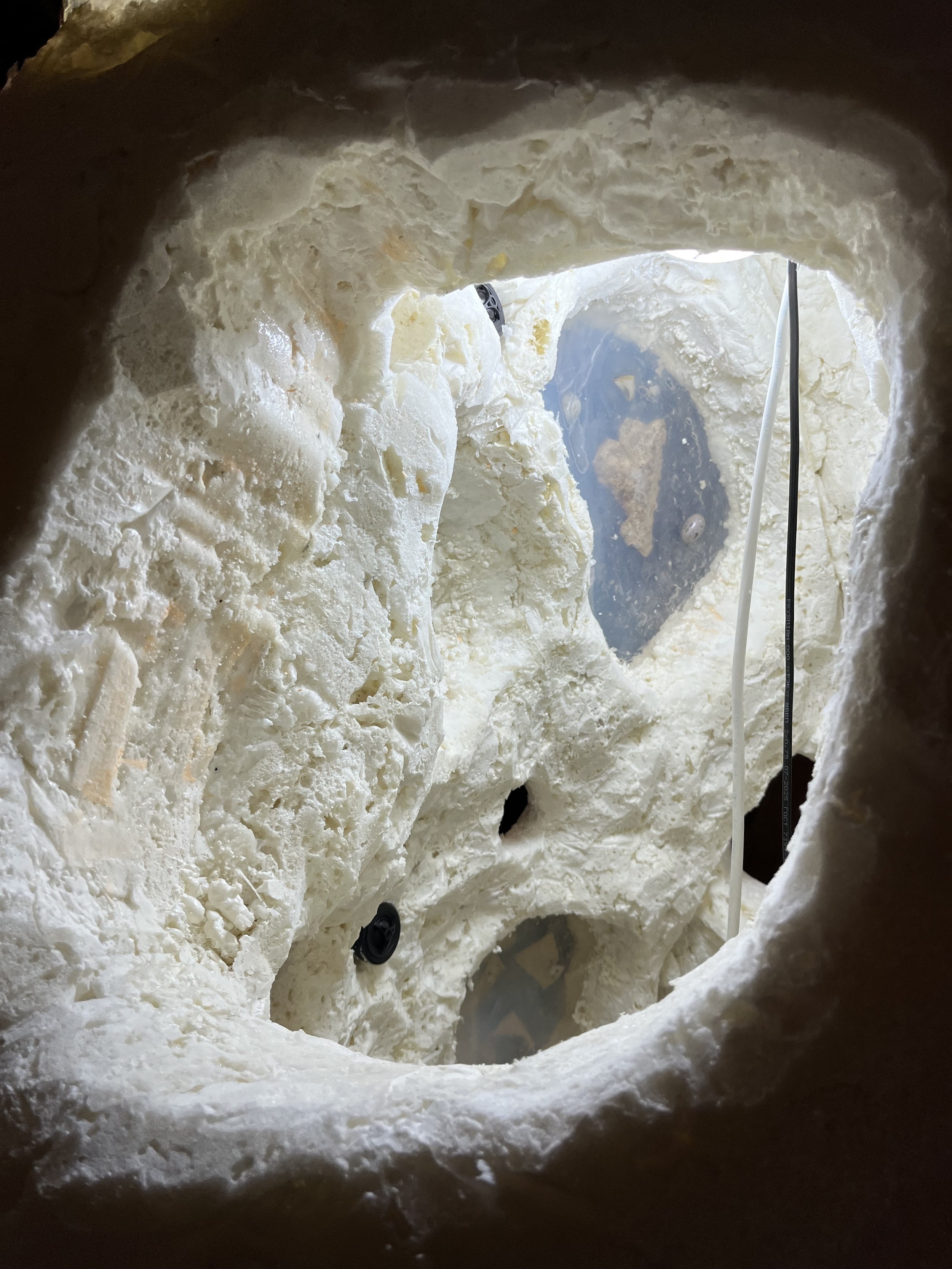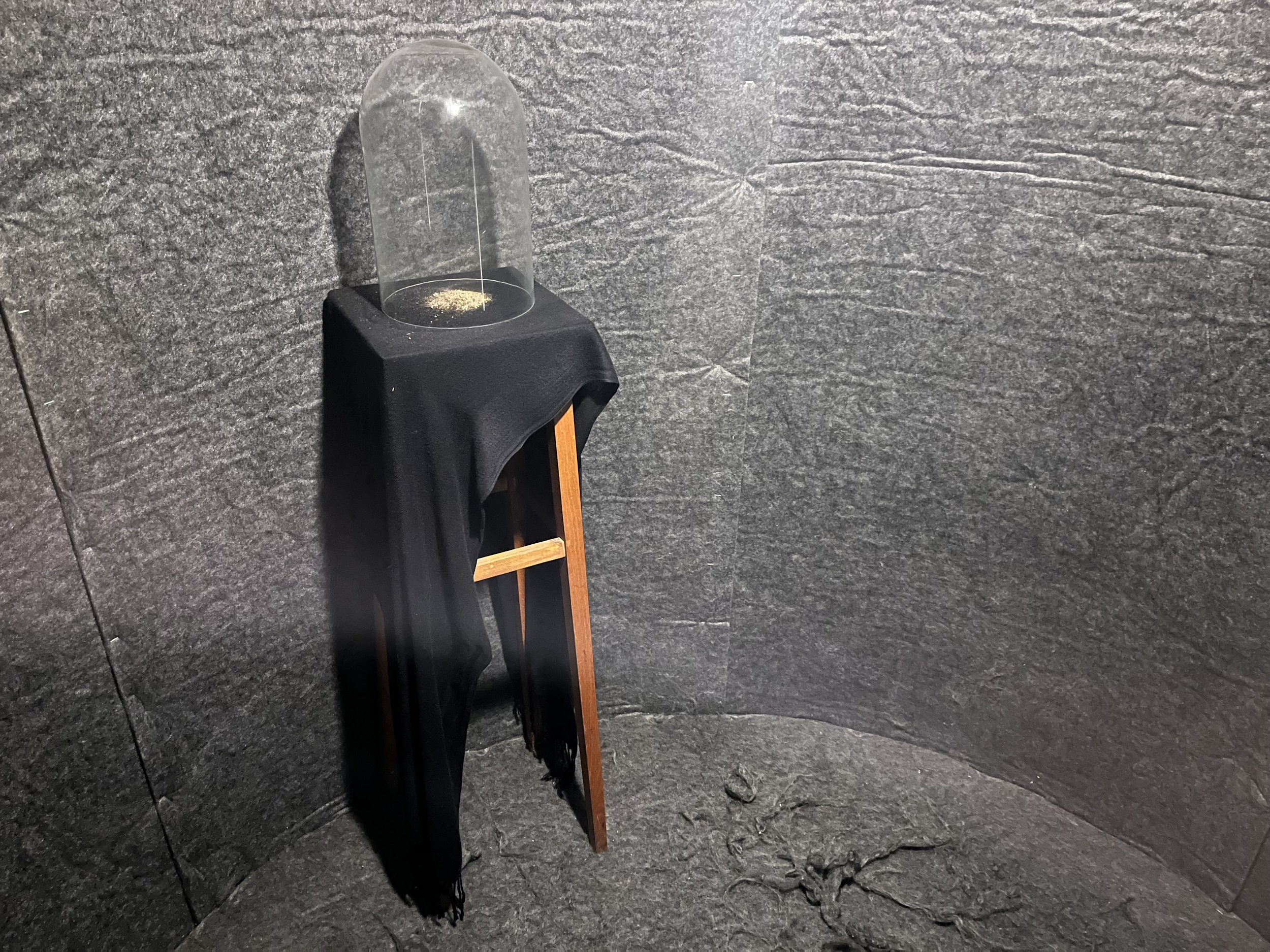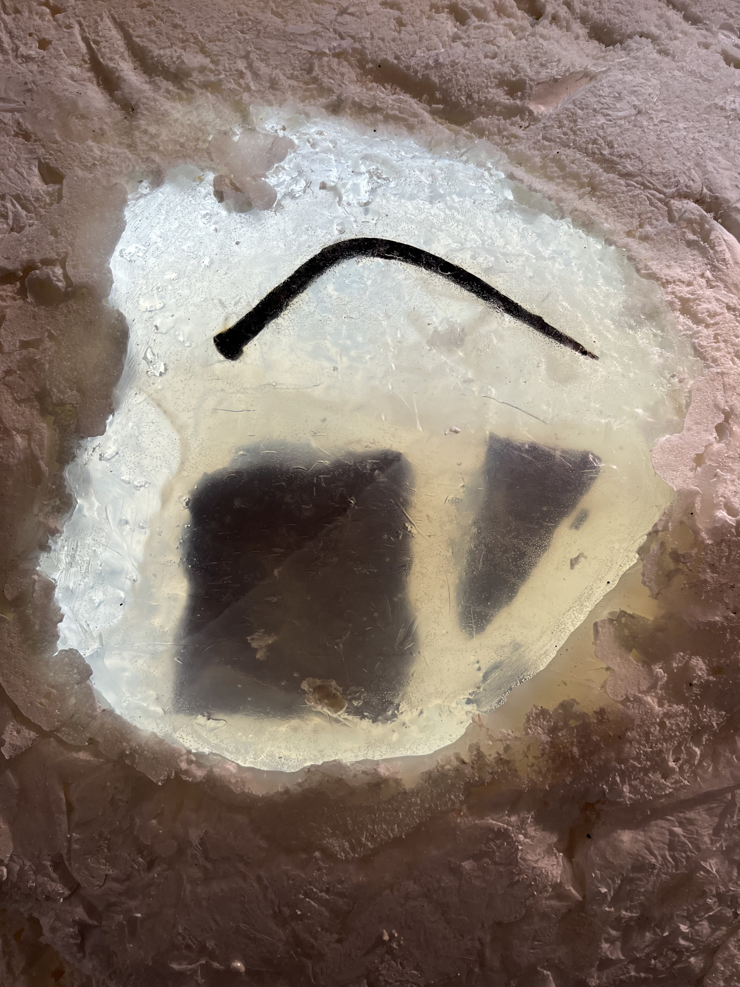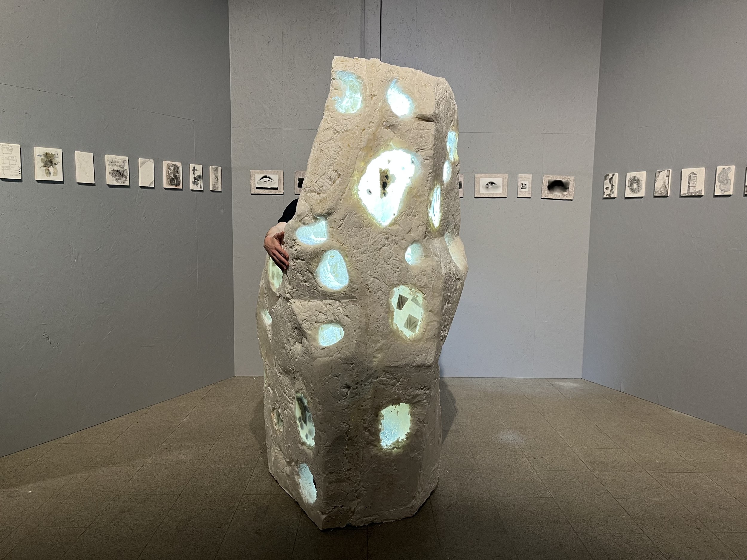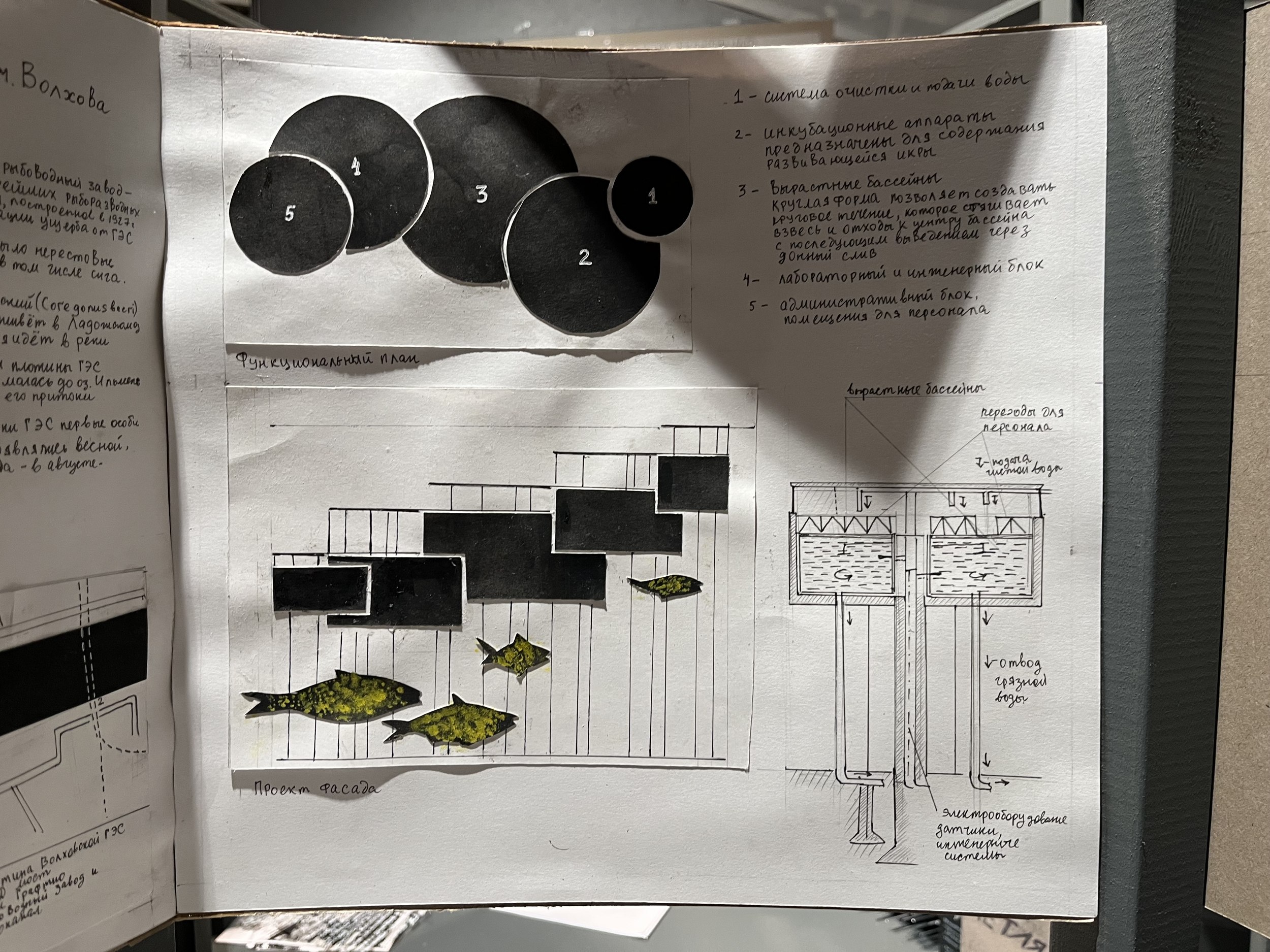 Догадаться, что группу курировал Сергей Мишин, можно было по графике в экседре экспозиции и презентации, в которой студенты использовали метод вербального проектирования. В эту же компанию попал будущий композитор из консерватории, а в процессе выяснилось, что в болотах, по которым бродила экспедиция, работал над оперой «Садко» Николай Римский-Корсаков, а нынешние зоотехники говорят языком Бунина и Набокова. Болото определили точкой начала и протоматерией, делали тесты на мутно-прозрачность и пористость, исследовали хтонь и пытались придать форму неоформленности. Так появился центральный объект экспозиции, внутри которого зловеще застыли найденные в пути артефакты. Помимо графики на стенах есть и фотографии, сделанные с помощью пинхола из пивной банки.