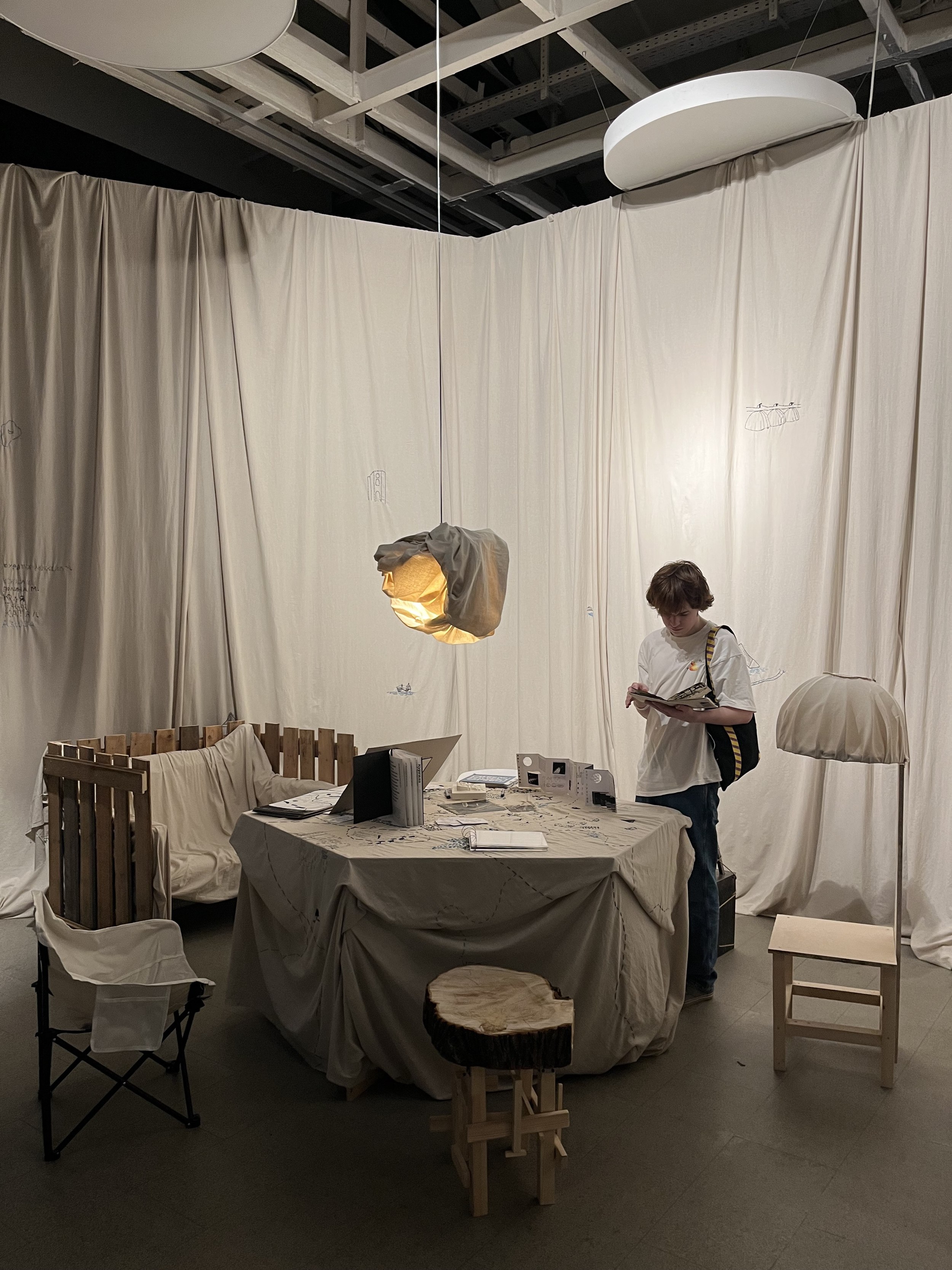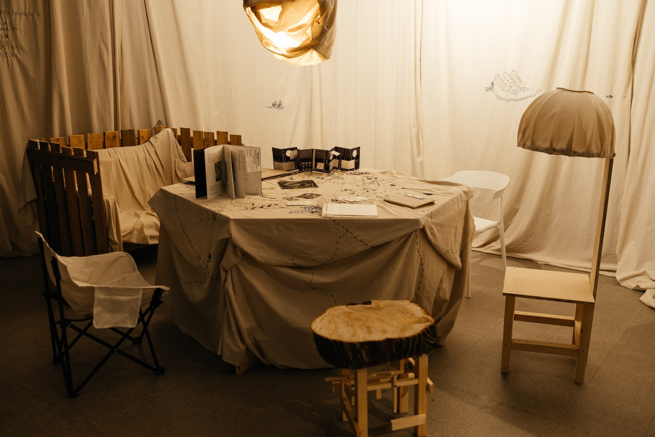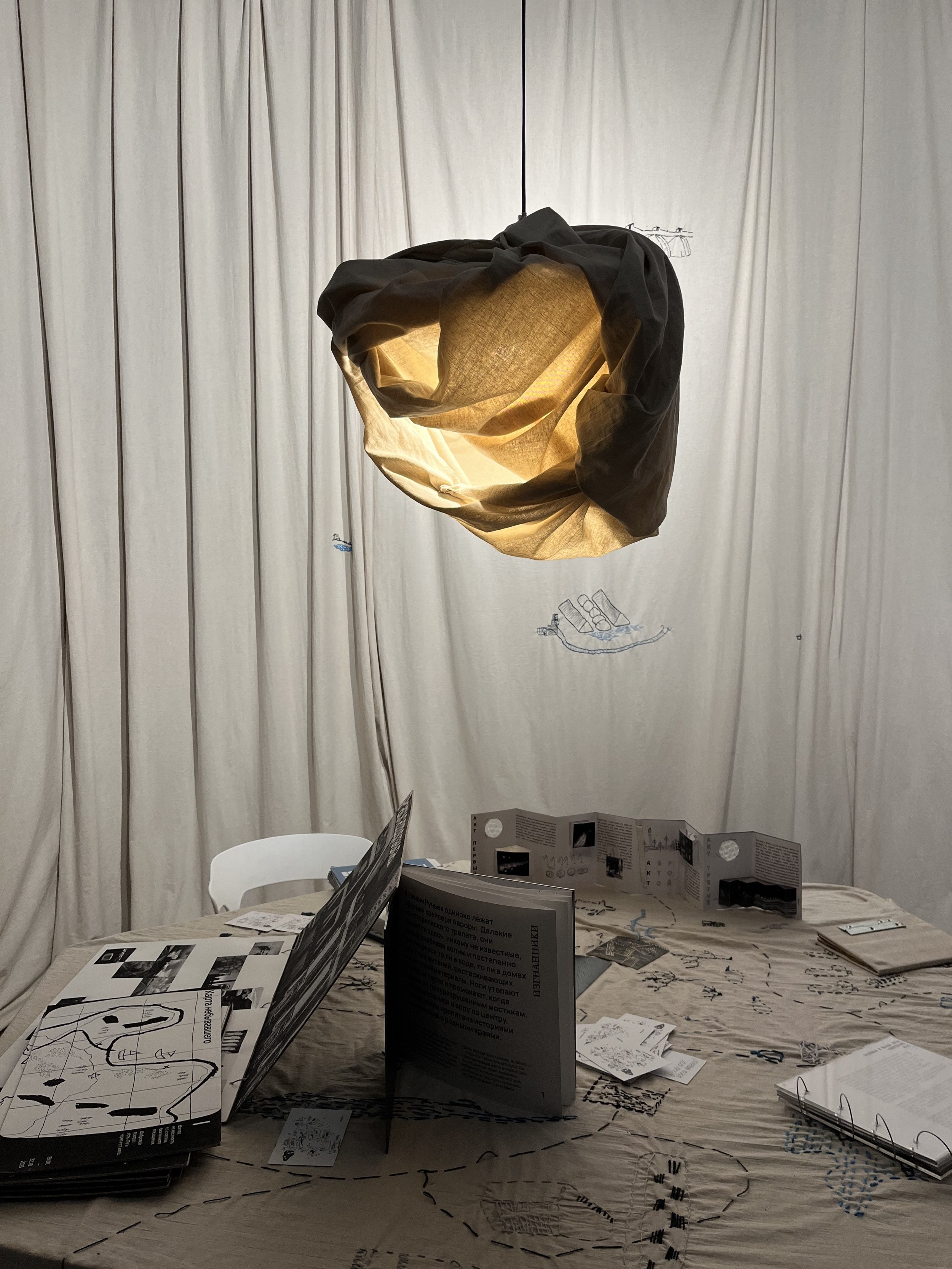 Морской порт Усть-Луги – один из крупнейших инфраструктурных объектов области. Рядом с ним также проходит отрезок «Северного потока-2». Понятно, что этот объект очень закрытый – студенты кружили вокруг него несколько дней, и в конце концов умудрилась получить небольшую экскурсию по территории. Опыт ожидания, вероятно, повлиял на экспозицию – каждый сделал для нее свой особенный стул, отразив в дизайне и особенности района. Группа исследовала и другие места. «Зачем вам в Лужицы? – спросил водитель. – Там же ничего нет». Но имеющий глаза увидит. Главным открытием стало сходство порта и окружающих его деревушек: в обеих реальностях есть вода, вернакуляр, изолированность, только живут они в разных масштабах. Свои впечатления участники зафиксировали в нескольких зинах. Вышивка на драпировке экспозиции отражает разрозненность объектов интереса в районе, а также главные занятия исконного населения – рыбную ловлю и украшение свадебных нарядов.