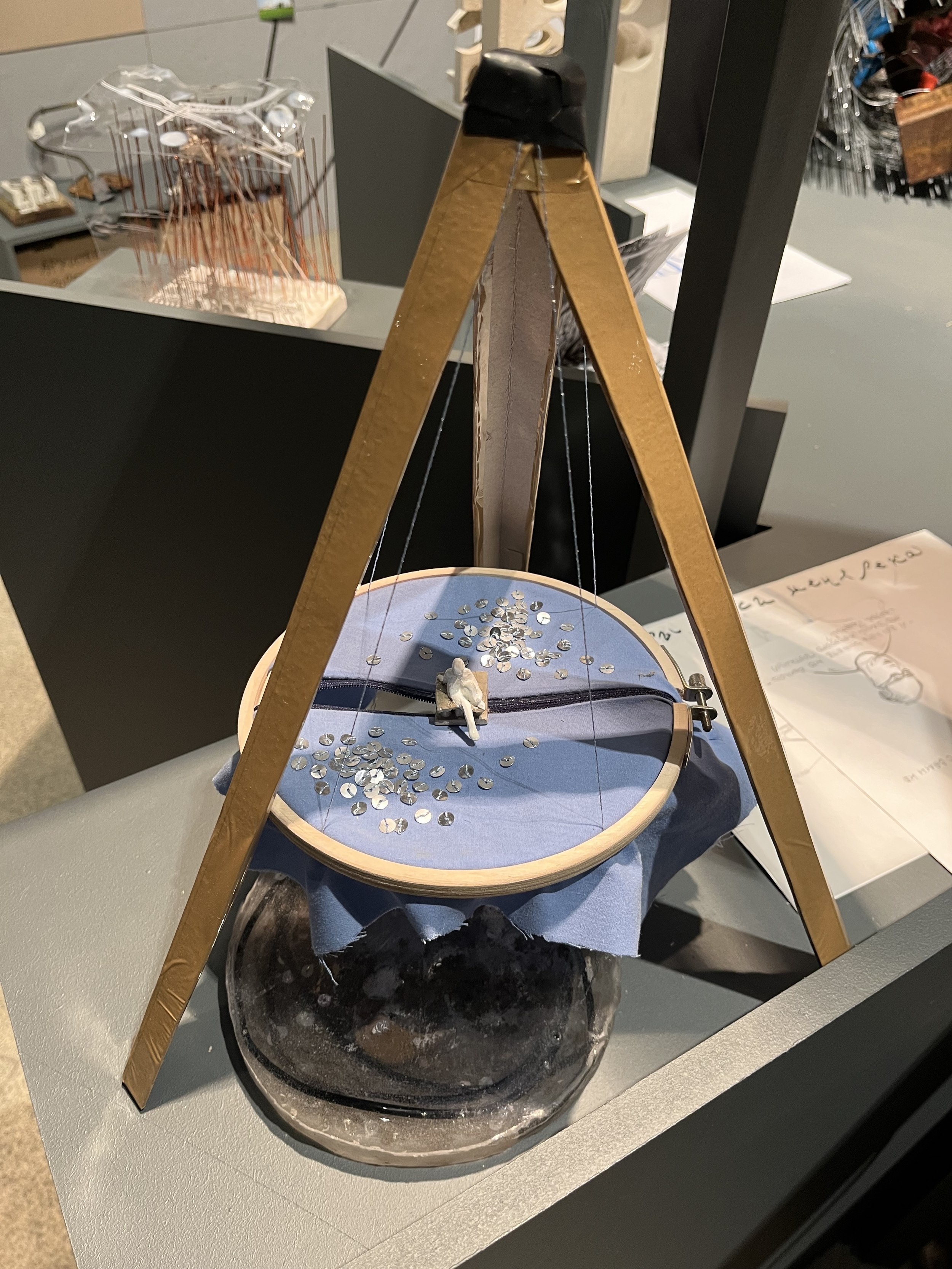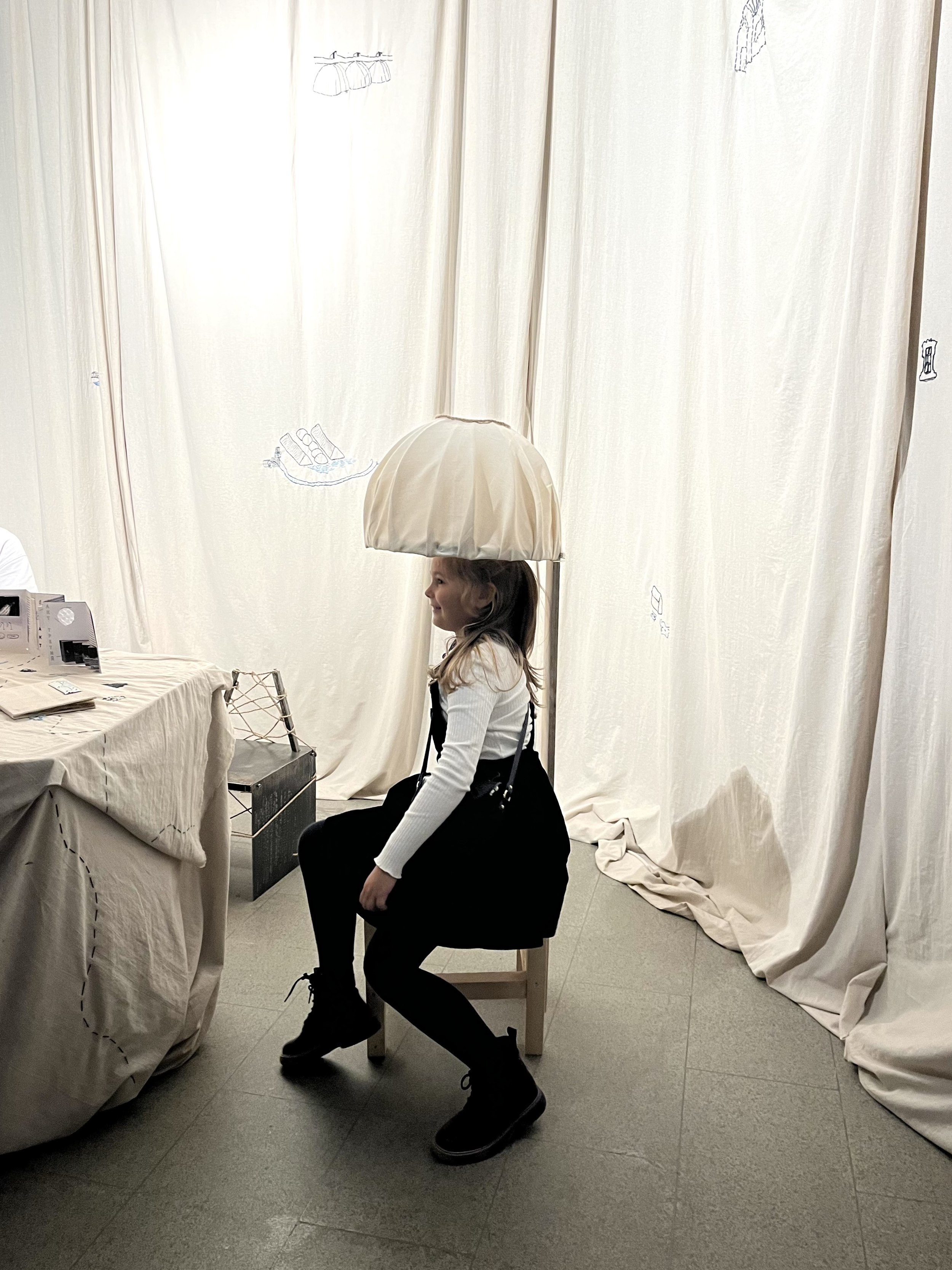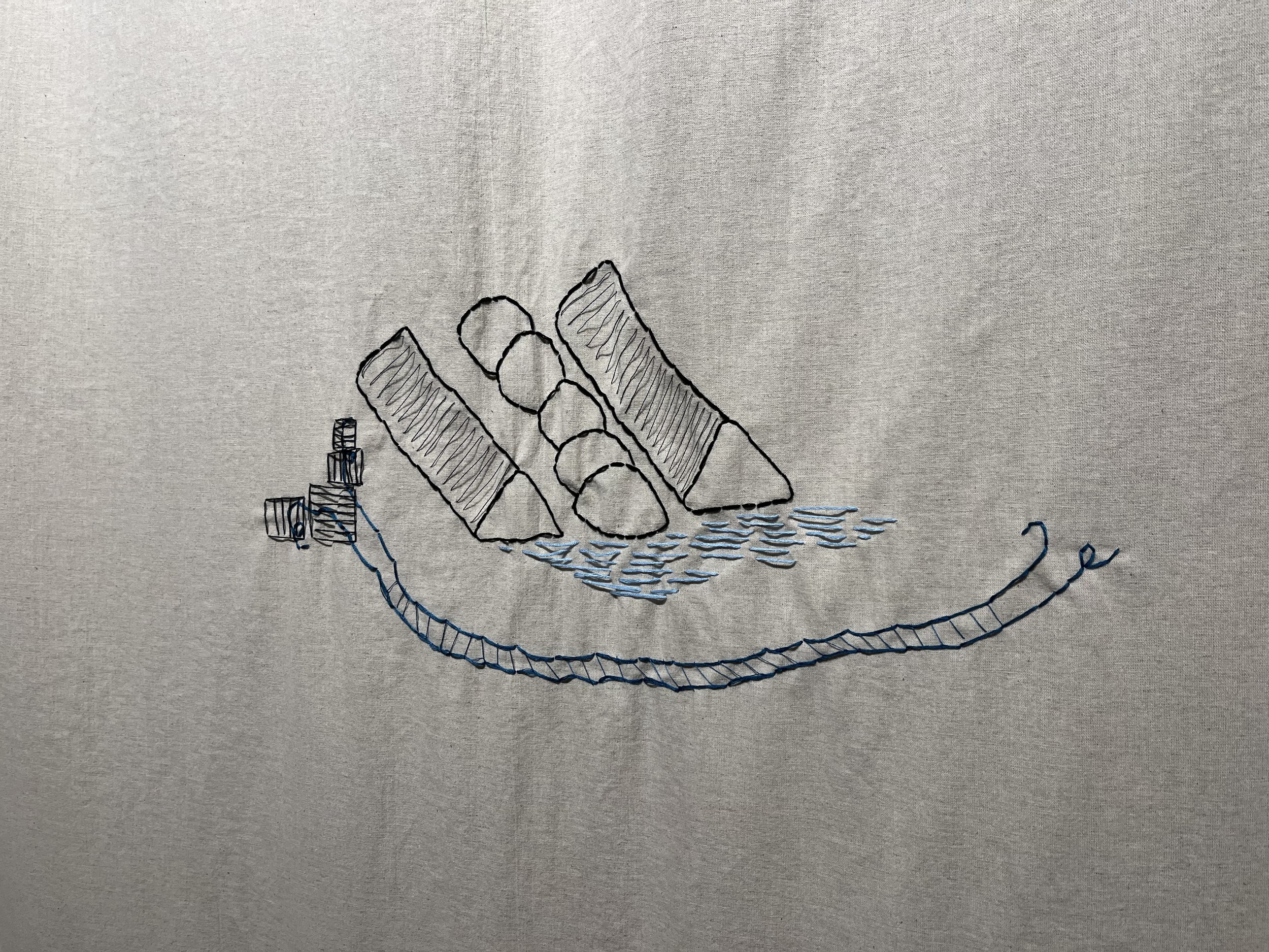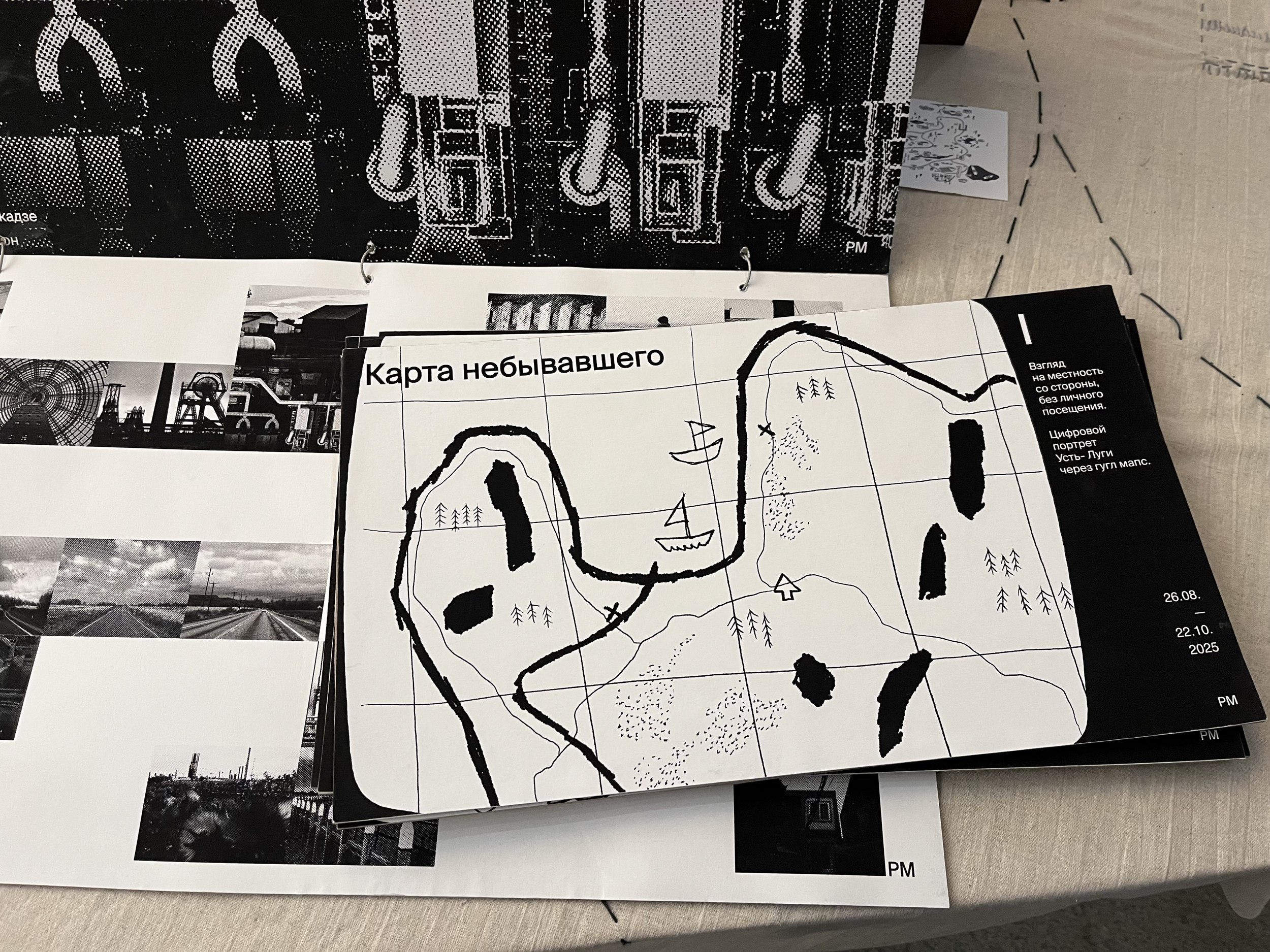 Морской порт Усть-Луги – один из крупнейших инфраструктурных объектов области. Рядом с ним также проходит отрезок «Северного потока-2». Понятно, что этот объект очень закрытый – студенты кружили вокруг него несколько дней, и в конце концов умудрилась получить небольшую экскурсию по территории. Опыт ожидания, вероятно, повлиял на экспозицию – каждый сделал для нее свой особенный стул, отразив в дизайне и особенности района. Группа исследовала и другие места. «Зачем вам в Лужицы? – спросил водитель. – Там же ничего нет». Но имеющий глаза увидит. Главным открытием стало сходство порта и окружающих его деревушек: в обеих реальностях есть вода, вернакуляр, изолированность, только живут они в разных масштабах. Свои впечатления участники зафиксировали в нескольких зинах. Вышивка на драпировке экспозиции отражает разрозненность объектов интереса в районе, а также главные занятия исконного населения – рыбную ловлю и украшение свадебных нарядов.