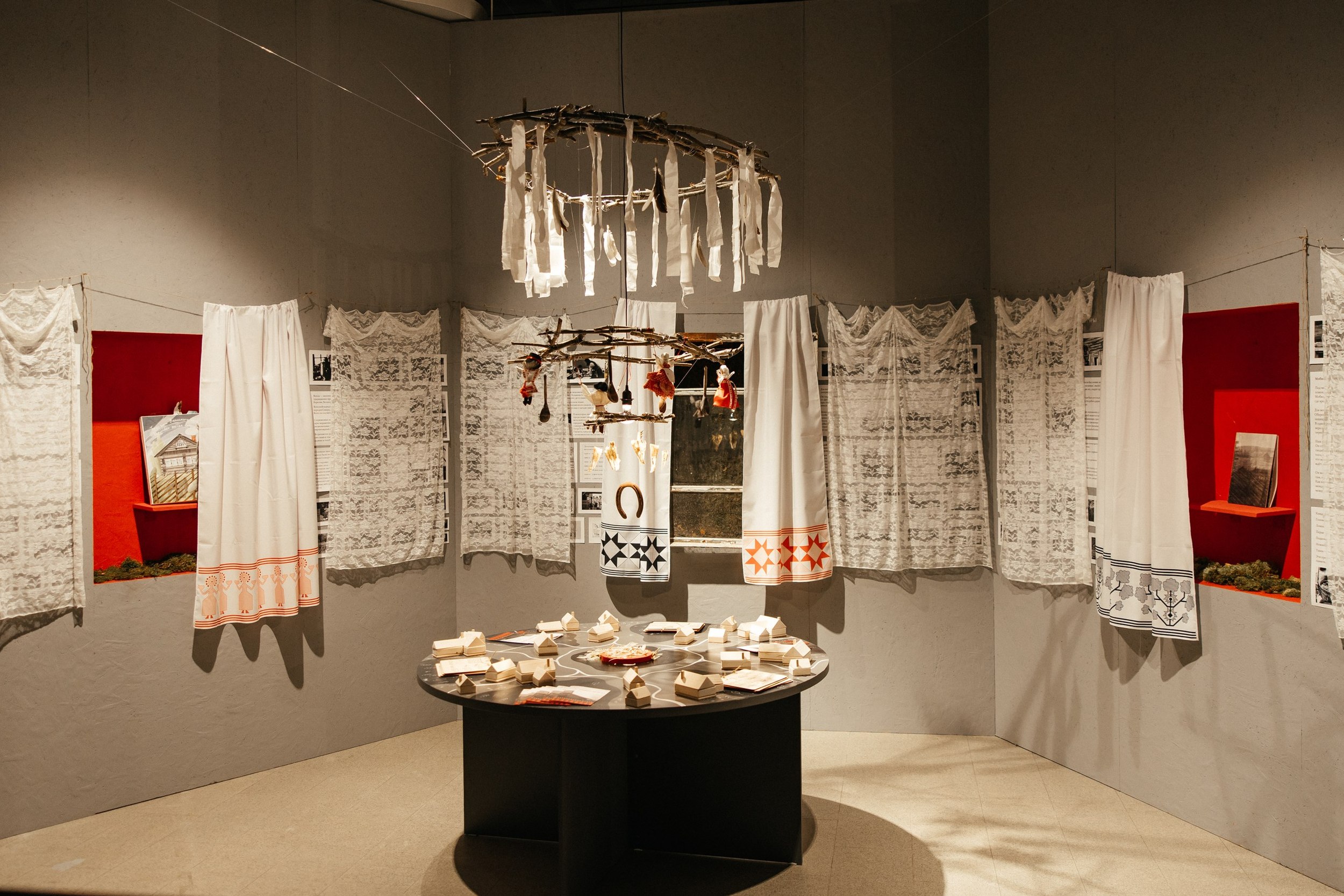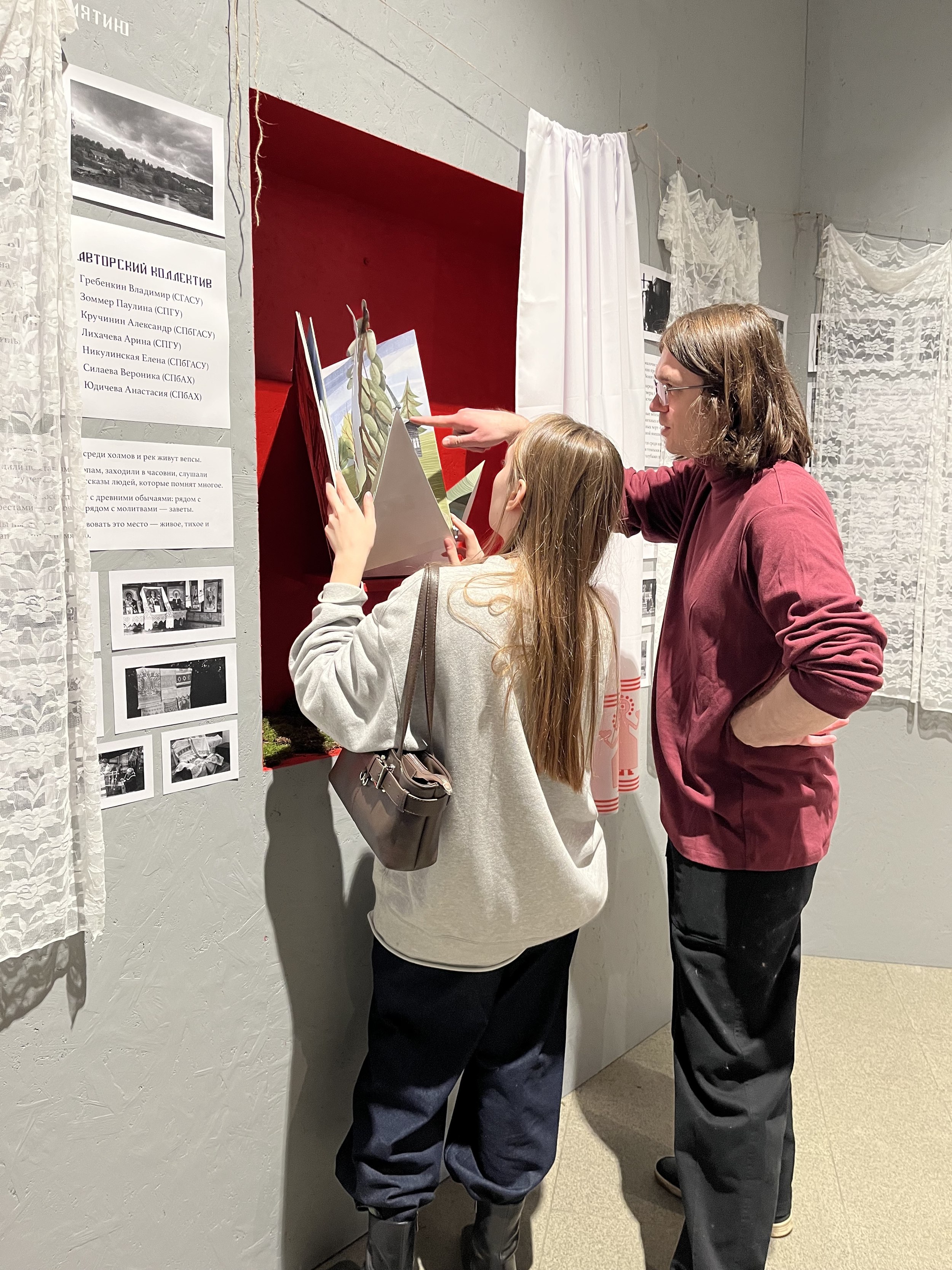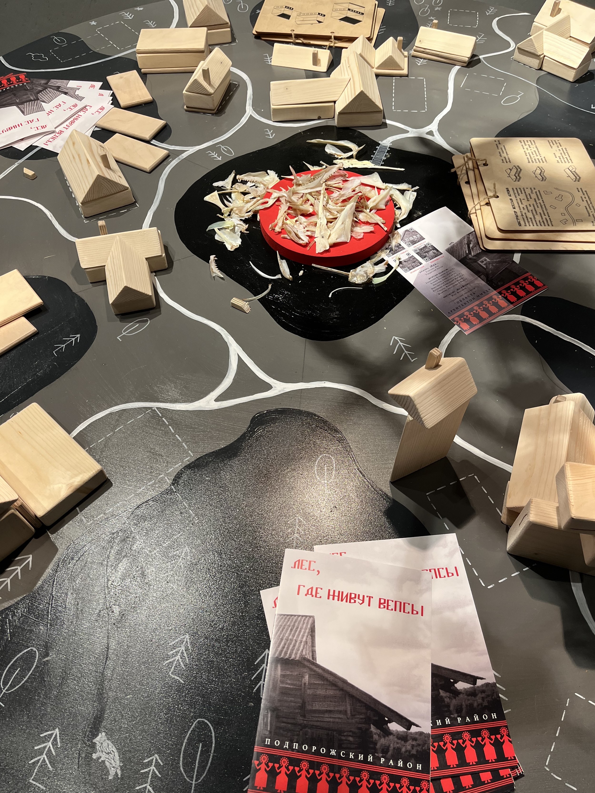У этой группы, кажется, была самая прямая дорожка: получив по жребию Подпорожский район, кураторы выбрали предметом исследования территорию заповедника Вепсский лес, обратились за поддержкой к проекту «Лес и ветер», который восстанавливает дома и организует туры в эту глубинку, а на презентации рассказали все за студентов. Целью экспедиции выбрали популяризацию места и аутентичного ландшафта. Экспозиция и правда привлекла внимание и была наиболее цельной и понятной: на стенах – «заветы» из тканей традиционными орнаментами, над столом с вепсской деревушкой – мобиль-оберег из различных сакральных предметов, включая череп щуки. В окошках – зины, путеводители и 3D-книга о крае. После фестиваля экспозиция переедет на территорию Вепсского леса.