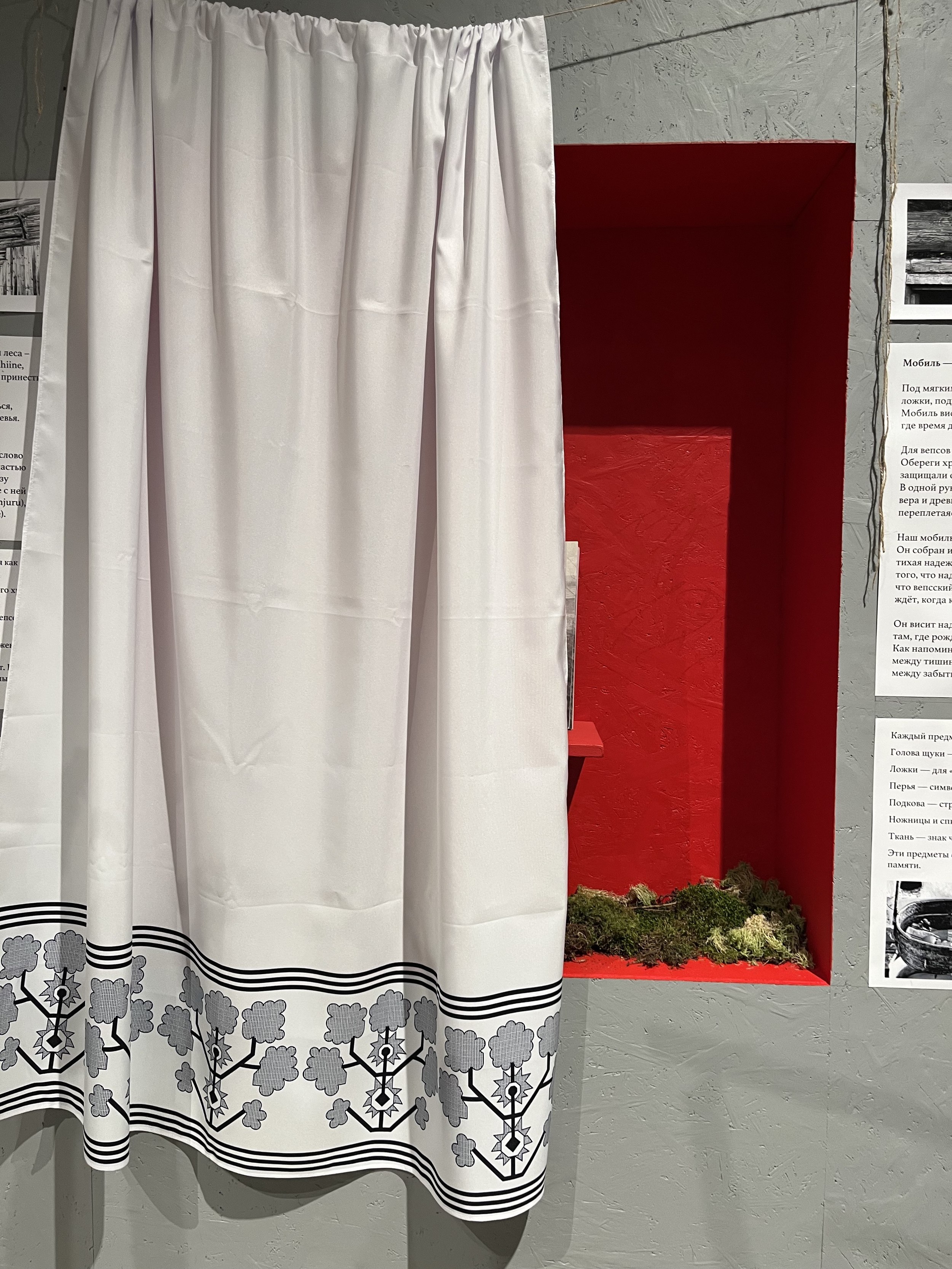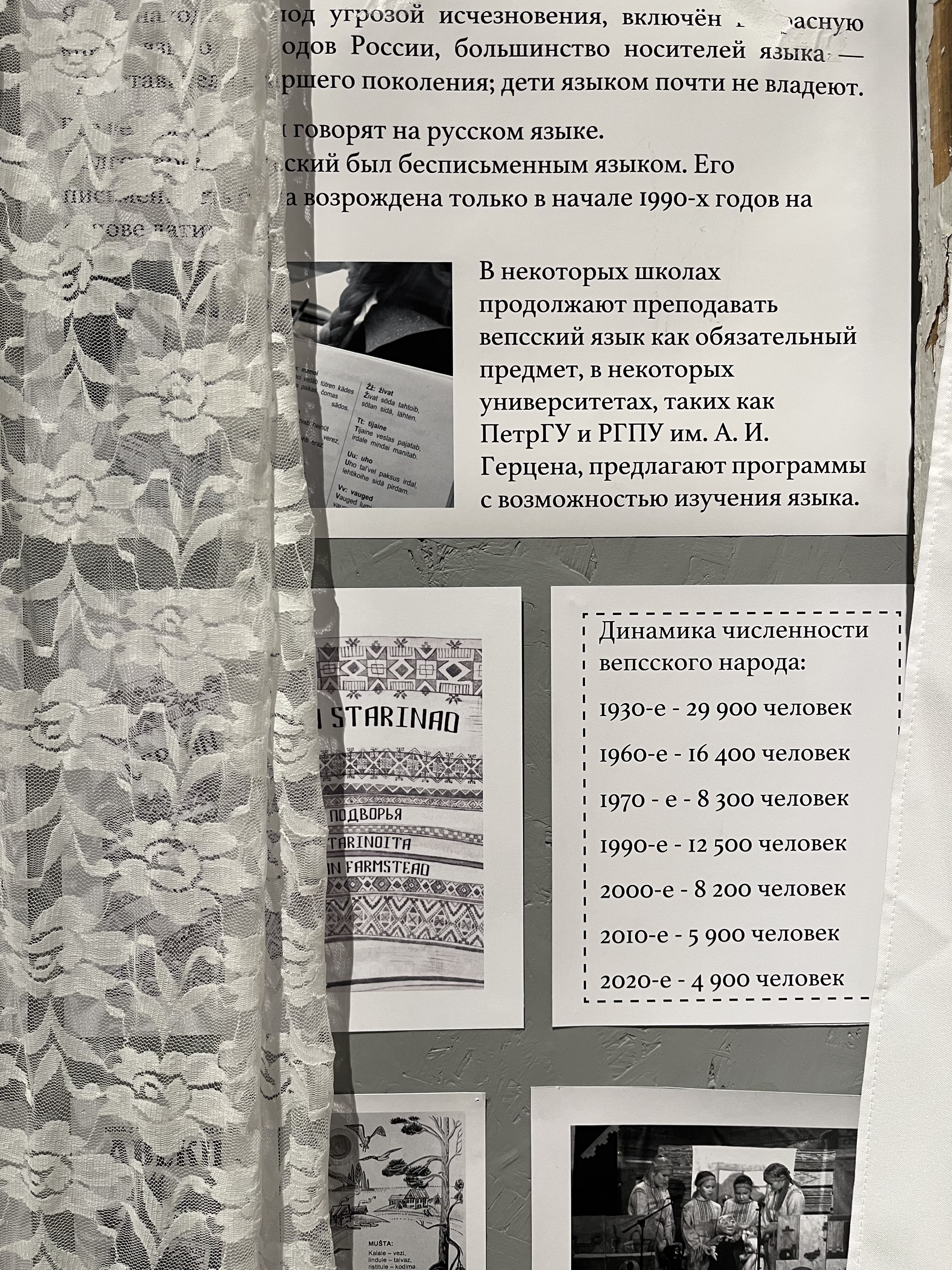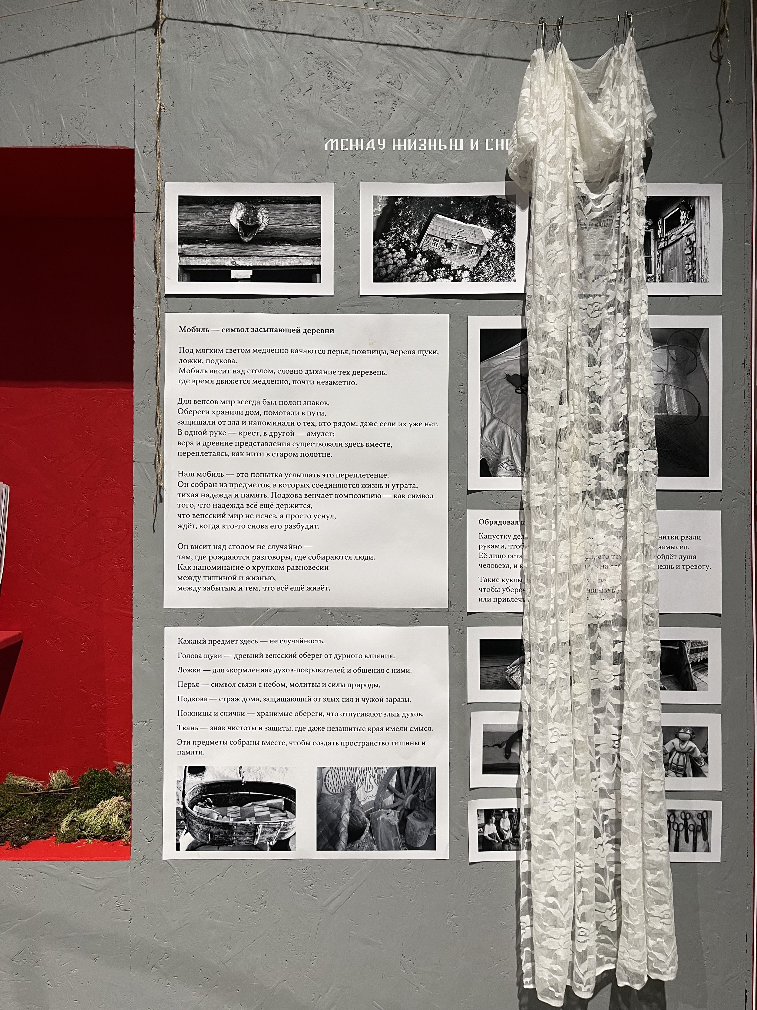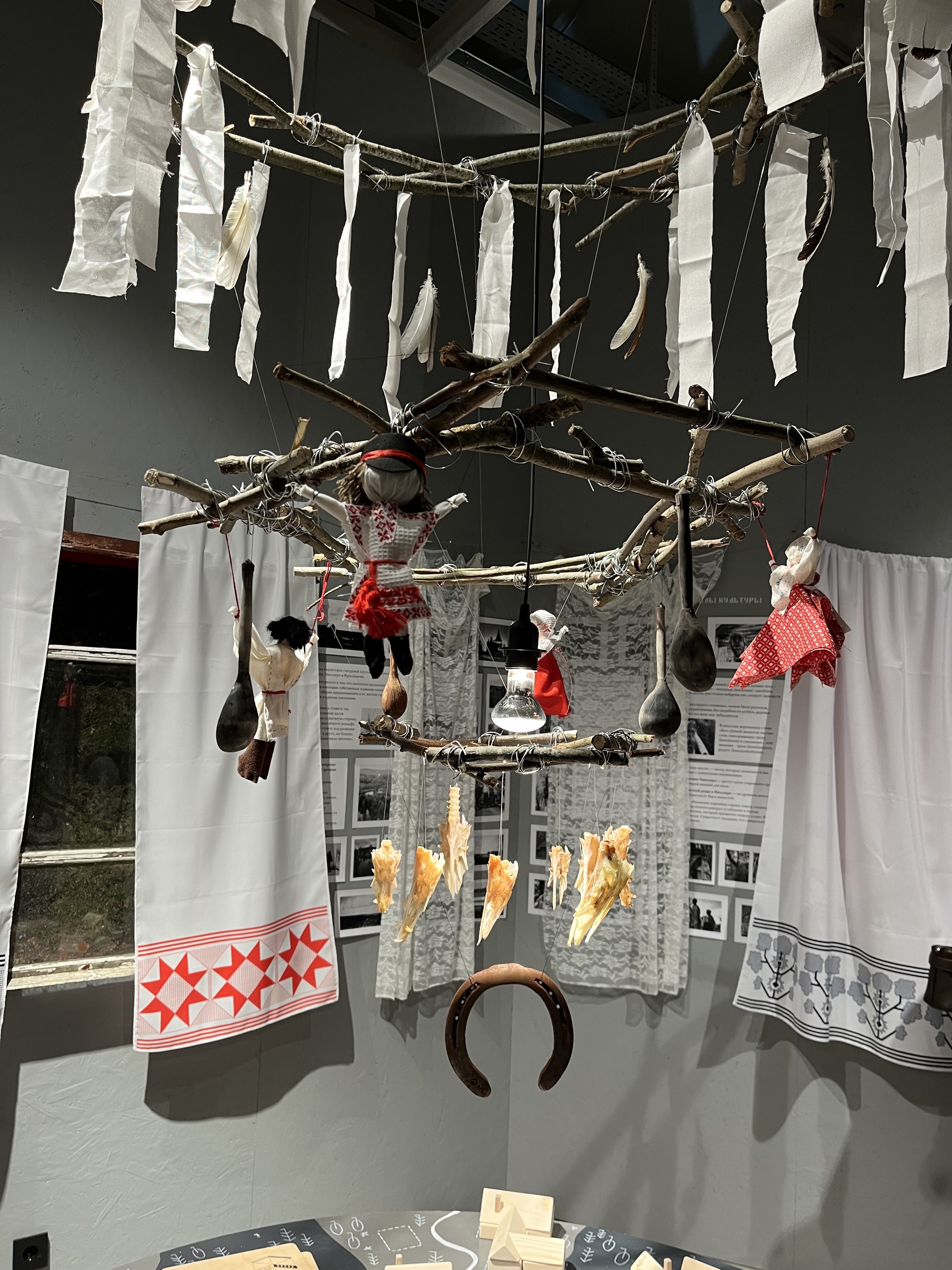 У этой группы, кажется, была самая прямая дорожка: получив по жребию Подпорожский район, кураторы выбрали предметом исследования территорию заповедника Вепсский лес, обратились за поддержкой к проекту «Лес и ветер», который восстанавливает дома и организует туры в эту глубинку, а на презентации рассказали все за студентов. Целью экспедиции выбрали популяризацию места и аутентичного ландшафта. Экспозиция и правда привлекла внимание и была наиболее цельной и понятной: на стенах – «заветы» из тканей традиционными орнаментами, над столом с вепсской деревушкой – мобиль-оберег из различных сакральных предметов, включая череп щуки. В окошках – зины, путеводители и 3D-книга о крае. После фестиваля экспозиция переедет на территорию Вепсского леса.