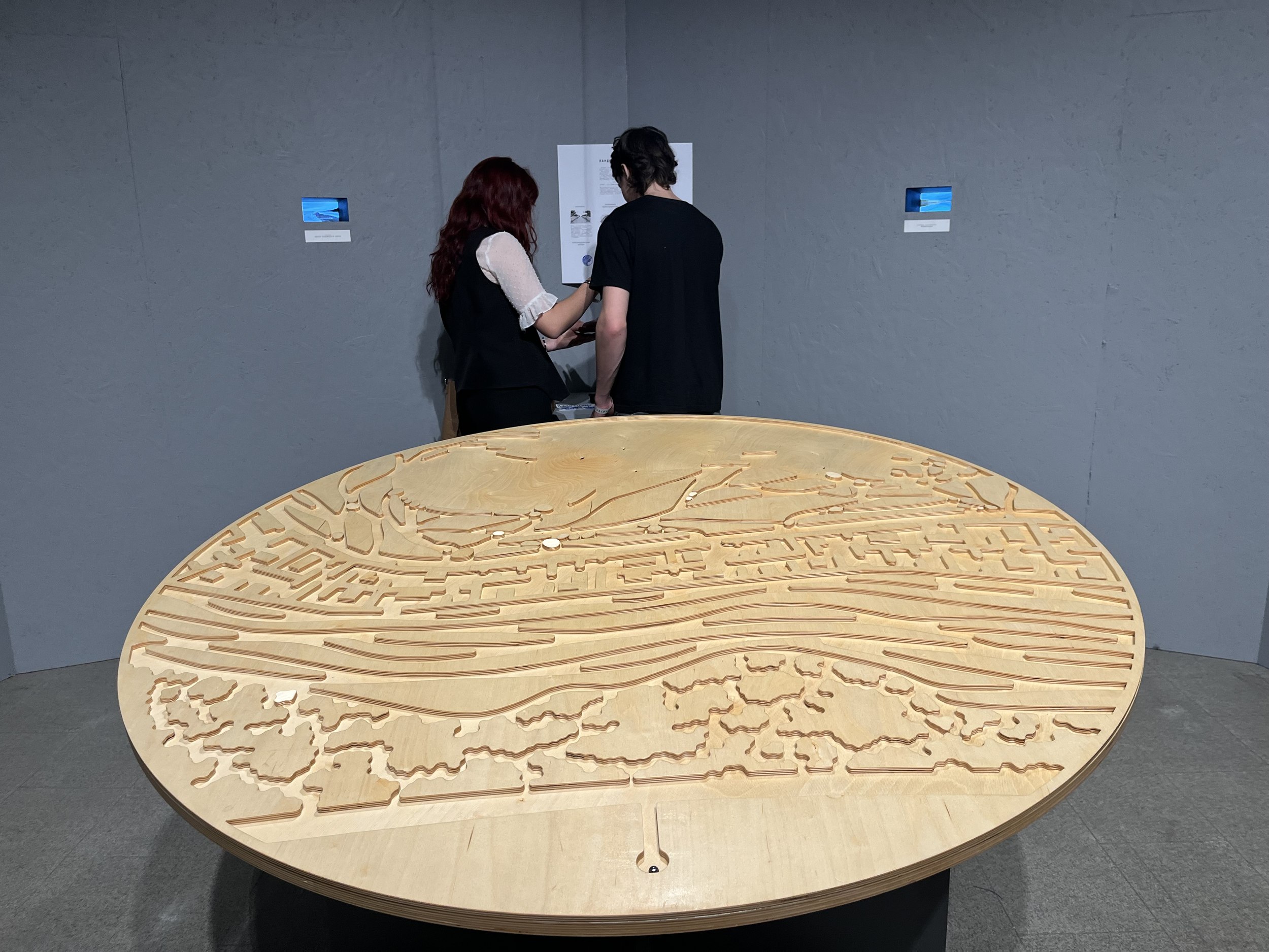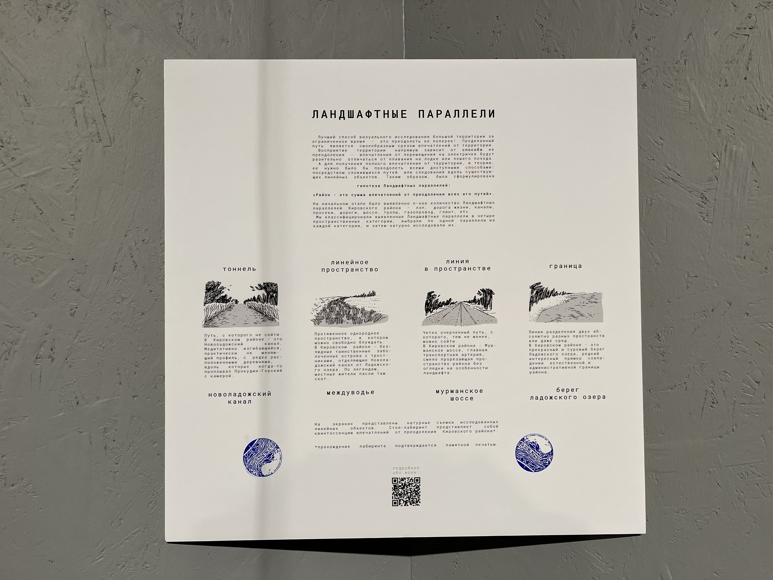 Самые известные места этого района – Шлиссельбург и Дорога жизни. Группа исследовала северную часть, которая подходит к Ладожскому озеру – на весельных лодках, автомобилях, электричках и пешком – захватив несколько деревень, Староладожский и Новоладожский каналы, тростниковые поросли, тропинки и грунтовки. На пути попался даже понтонный мост, который нужно разводить самостоятельно. Изначально была выдвинута гипотеза об отсутствии центричности, транзитном характере района, его линейности и слоистости: ландшафт напоминает срез путиловской известняковой плиты. Студенты выявили четыре базовых формирующих элемента – линию, границу, тоннель и линейное пространство. В экспозиции каждому элементу посвятили окошко в стене, а в центре расположили игру-лабиринт, которая отражает сумму впечатлений о топографии района: на диске-балансире вырезаны лес, озеро с берегом, шоссе, тростники и другие места.