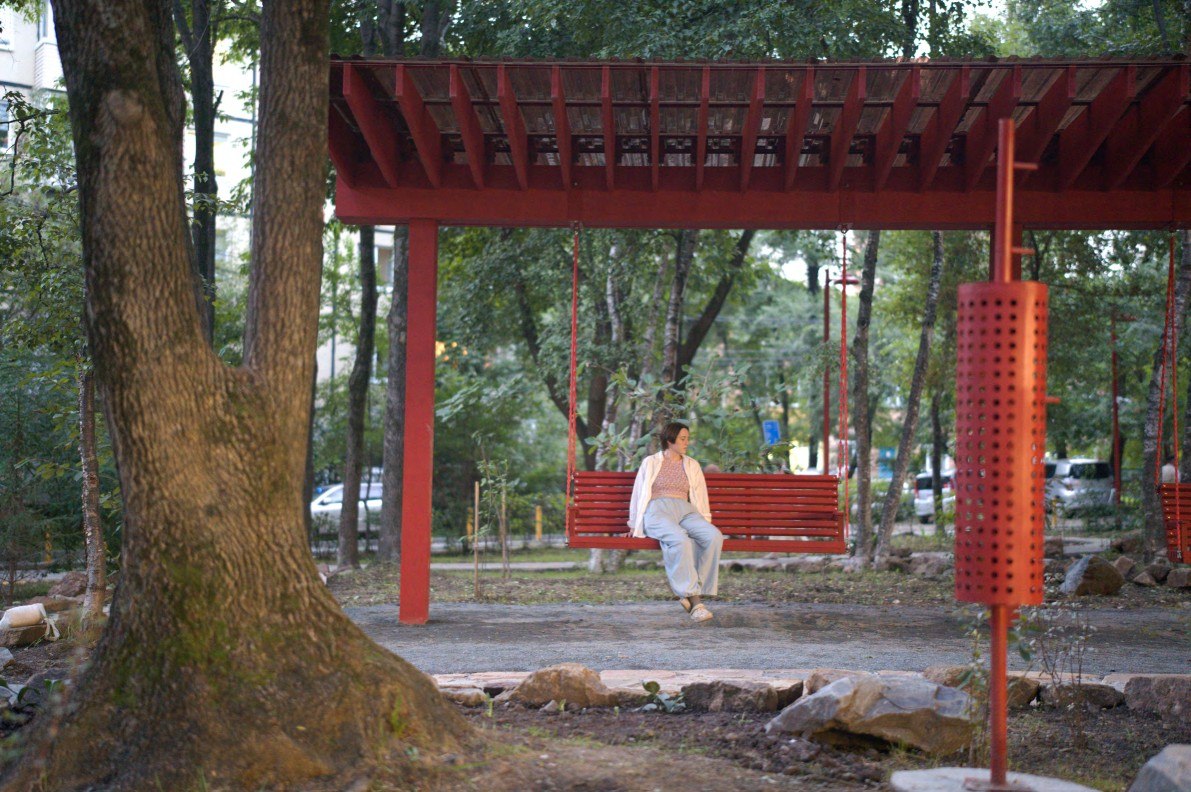 «Гусиноозерск – город в Республике Бурятия, третий в республике после Улан-Удэ и Северобайкальска по числу жителей, расположен на берегу Гусиного озера. Сам участок проектирования расположен в центральной части города Гусиноозерск и окружен двумя детскими садами и школой. Данная территория одна из самых проходимых в городе, благодаря близлежащим учебным заведениям, что сделало задачу по ее комплексному благоустройству особенно важной для города. Сквер исходно был окружен высоким забором, из-за которого многие горожане думали, что сквер – часть школьной закрытой территории и не воспринимали его как место для прогулки и отдыха. В то же время сами школьники не посещали сквер, так как не знали, чем себя занять на пустой и безжизненной территории во время перемены или после уроков. За основу концепции была взята история города и его главный символ – Гусь. Так цвета и фактуры материалов основываются на окрасе птицы и форме ее перьев. Эта тематика поддерживается и в выборе малых архитектурных форм, закладываемых в проект. В проектных решениях также была использована еще одна характерная черта региона – деревянное зодчество. Отделка домов деревянной черепицей стала основой для создания уникального паттерна для отделки основных объектов в сквере. Реализация проекта обеспечила город новым качественным общественным пространством для досуга и отдыха. Появление таких объектов как амфитеатр и павильон дало дополнительные возможности для развития в городе новых культурных сообществ для детей и подростков. Новое закрытое всесезонное пространство позволило держать социальную активность жителей города даже зимой».