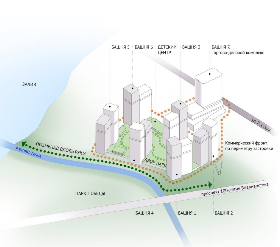 Некогда заброшенный ручей, Вторая речка возвращается в статус реки благодаря экологическим мероприятиям по ее очистке и получает благоустроенную эко-набережную по двум берегам. По одному из них проходит прогулочная пешеходная зона ЖК STARK, которая в дальнейшем протянется в пешеходную ось от проспекта 100-летия Владивостока до берега Амурского залива. Одно-двух этажные рестораны с видовыми площадками и магазины формируют активный, сомасштабный человеку уличный фронт набережной. Здесь организовано приоритетное движение пешеходов с возможностью подъезда автомобилей к входным группам домов и ресторанов».