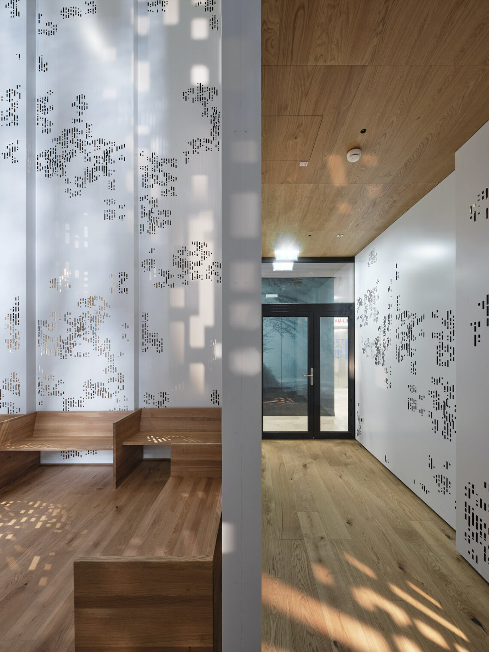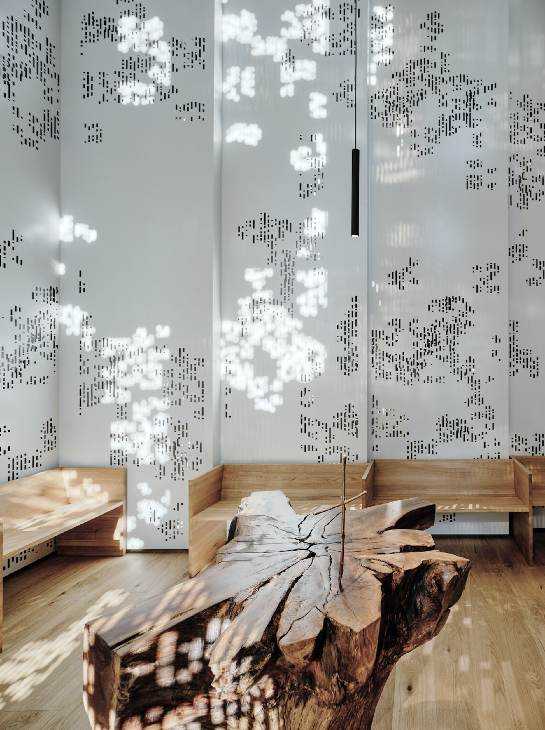 Государственная больница города Грац в Австрии, как и многие другие больницы по всему миру, заботится о психологическом здоровье посетителей и пациентов. Для того чтобы им было где провести время в покое, была обустроена небольшая часовня площадью всего 35 кв. метров. Формально христианская, она фактически представляет собой не каноническое, а научно и художественно спроектированное пространство психологической реабилитации. Дизайн основан на современных исследованиях в области нейробиологии и экологической психологии. Для создания теплой атмосферы в интерьере сочетаются натуральные материалы, дневной свет и органические формы. Кроме того, в оформлении использованы фрактальные паттерны, созданные с помощью специальной компьютерной программы, эффективность которых в снижении стресса подтверждена экспериментально учеными NASA.