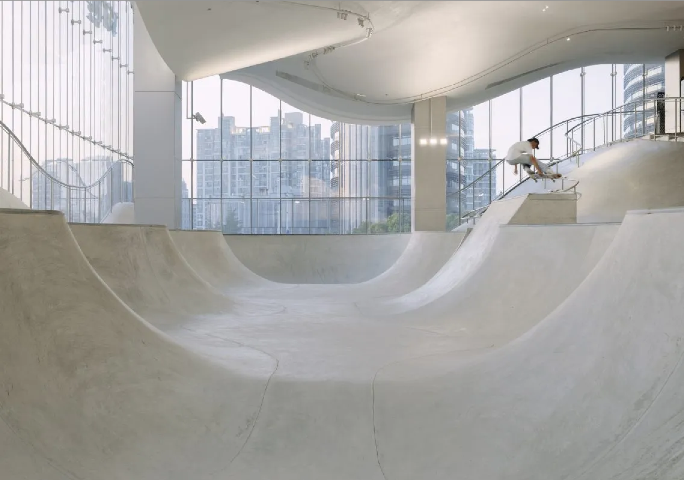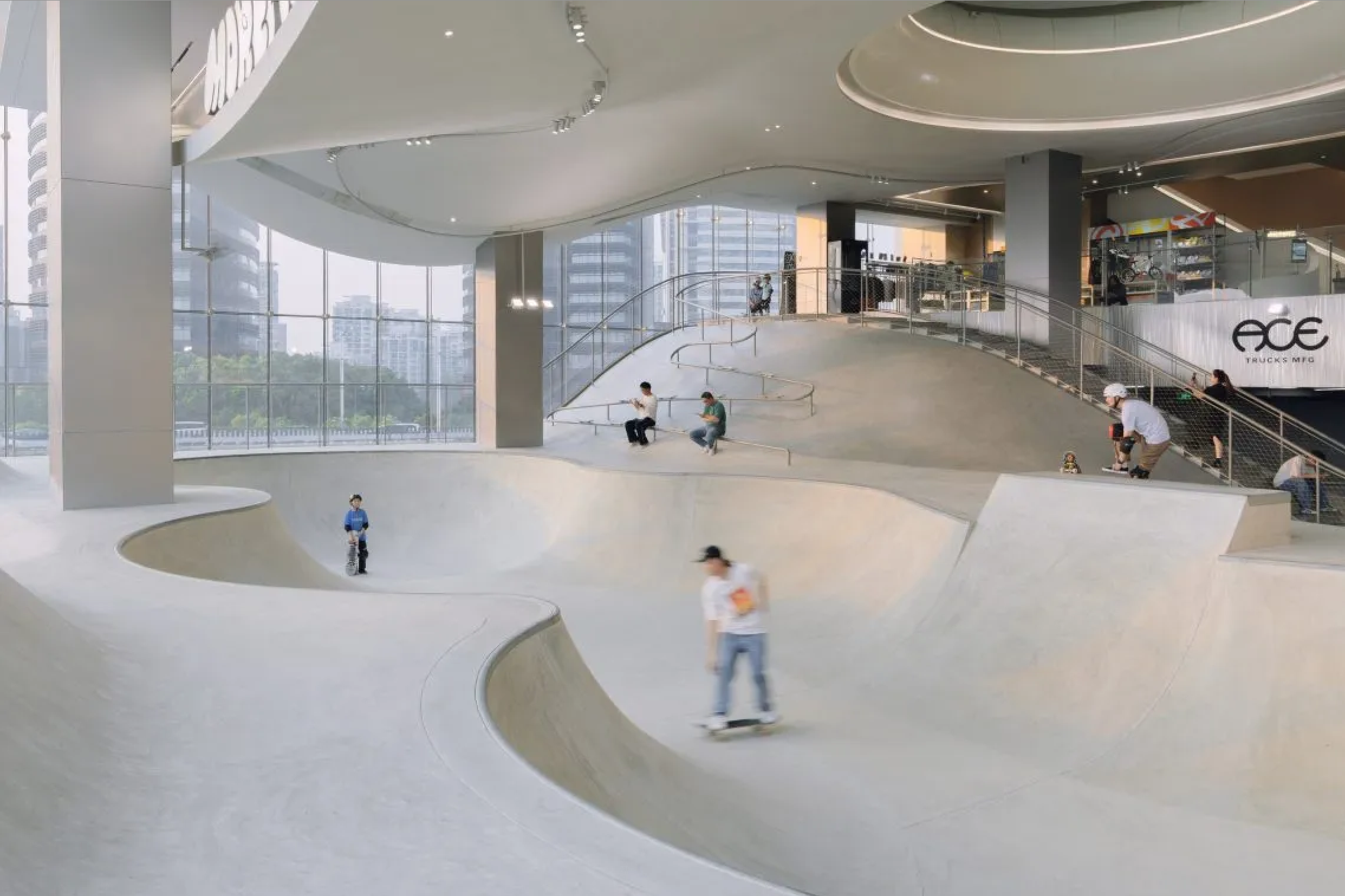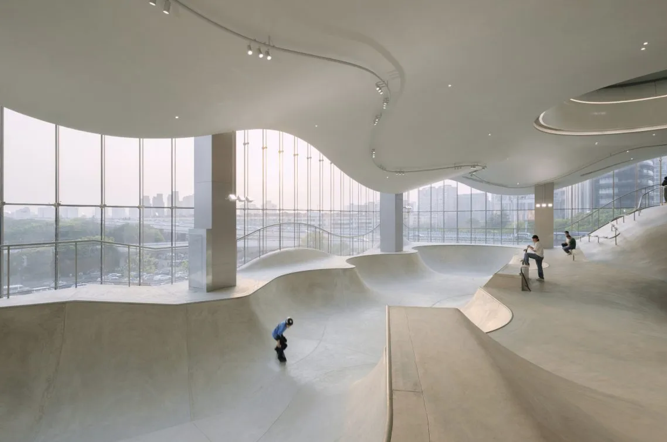 Скейт-парк может быть только на улице или внутри ангара? Вовсе нет. Его можно разместить внутри высотного комплекса посреди оживленного района города – и сделать так, чтобы он стал украшением всего здания. Скейт-парк MOREPRK расположен на третьем, четвертом и пятом этажах высотки в пригороде Шанхая. Огромный трехэтажный витраж открывает вид на раскинувшиеся внутри пандусы и чаши для катания. Изгибающиеся поверхности светло-серого цвета снаружи выглядят как песчаные дюны, по которым скейтеры с легкостью скользят, борясь и побеждая земную гравитацию. Благодаря расположению и дизайну MOREPRK – не только экстремальное место для скейтбордистов, но и новая городская достопримечательность – трехмерный театр, открытый городу.