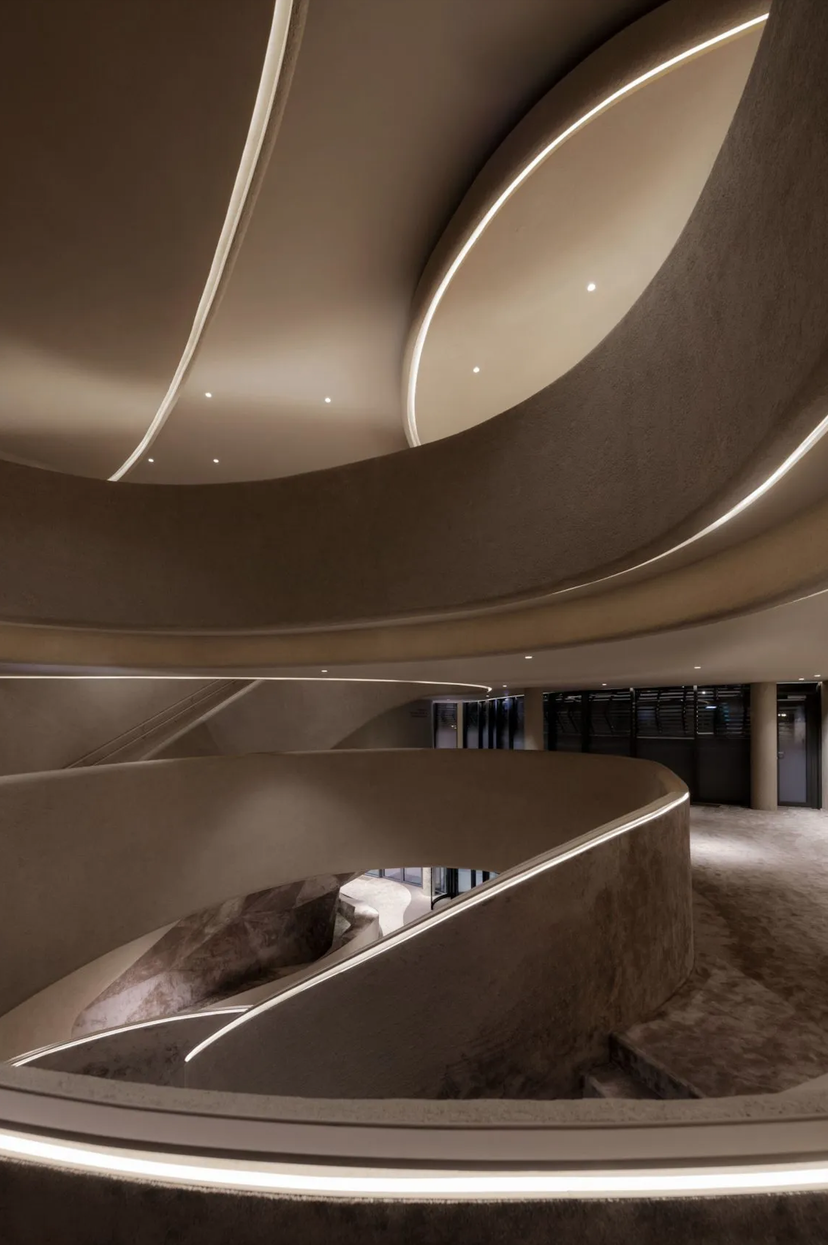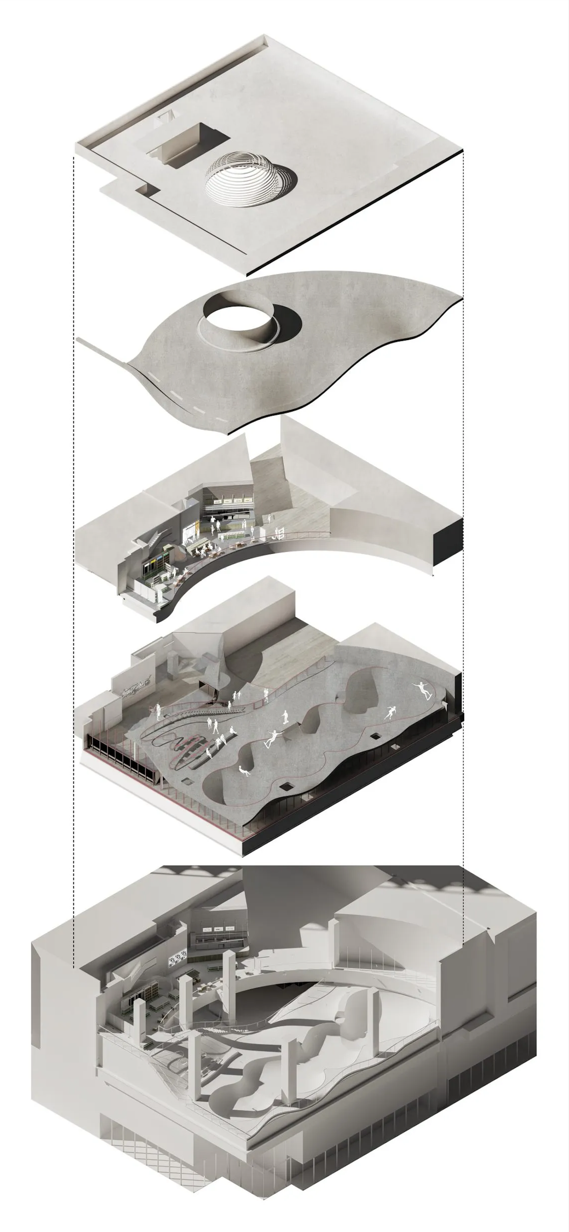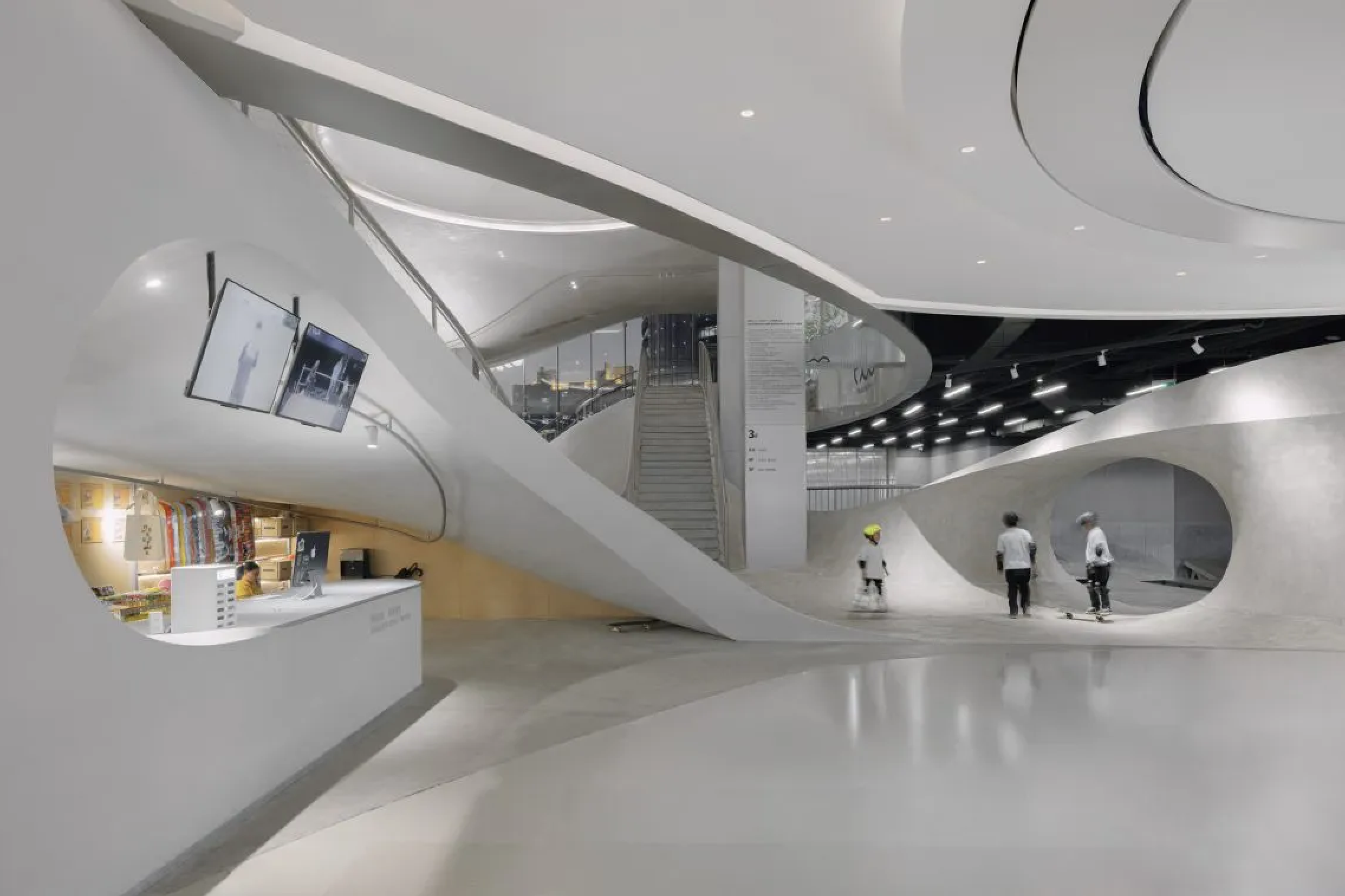 Скейт-парк может быть только на улице или внутри ангара? Вовсе нет. Его можно разместить внутри высотного комплекса посреди оживленного района города – и сделать так, чтобы он стал украшением всего здания. Скейт-парк MOREPRK расположен на третьем, четвертом и пятом этажах высотки в пригороде Шанхая. Огромный трехэтажный витраж открывает вид на раскинувшиеся внутри пандусы и чаши для катания. Изгибающиеся поверхности светло-серого цвета снаружи выглядят как песчаные дюны, по которым скейтеры с легкостью скользят, борясь и побеждая земную гравитацию. Благодаря расположению и дизайну MOREPRK – не только экстремальное место для скейтбордистов, но и новая городская достопримечательность – трехмерный театр, открытый городу.