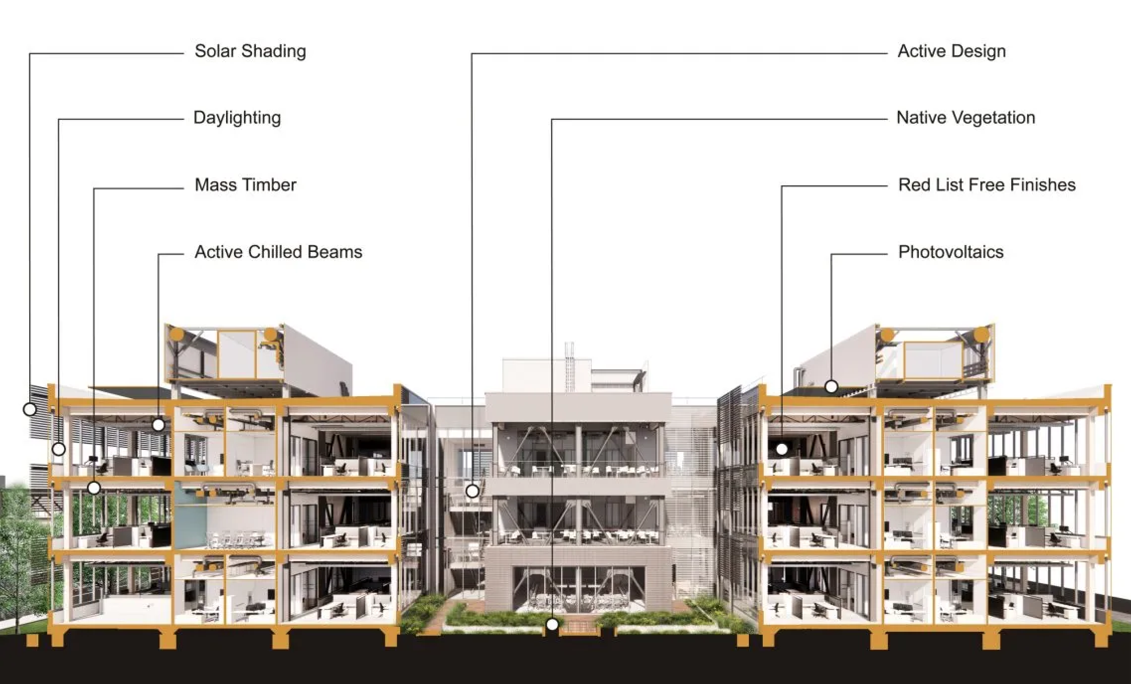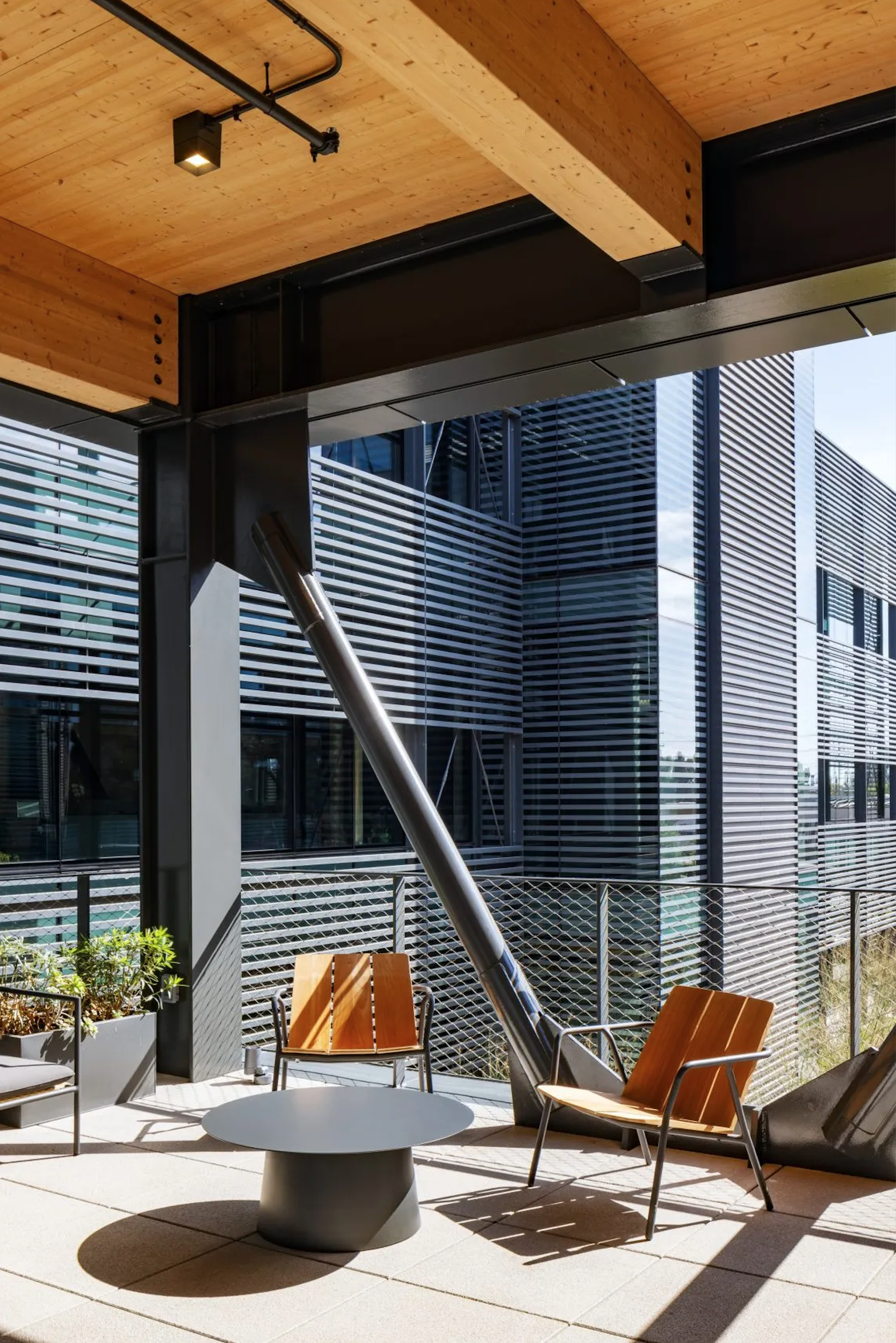 Новая штаб-квартира управления очистных сооружений округа Оранж стала первым зданием в Южной Калифорнии, построенным из массива древесины с нулевым потреблением энергии. На месте бывшей промышленной зоны возведено внешне простое здание, состоящее из основного трехчастного объема и дополнительного блока конференц-зала. Все конструктивные и инженерные решения призваны продемонстрировать новейшие достижения в энергоэффективности и ресурсосбережении. В дизайне интерьера доминируют деревянные клееные конструкции потолка с ромбовидной структурой и металлическими V-образными опорами по периметру. Остальные дизайнерские решения лишь подчеркивают мощь и выразительность конструкции. Ничего искусственного, ничего сделанного ради эстетики – только функция и эффективность.